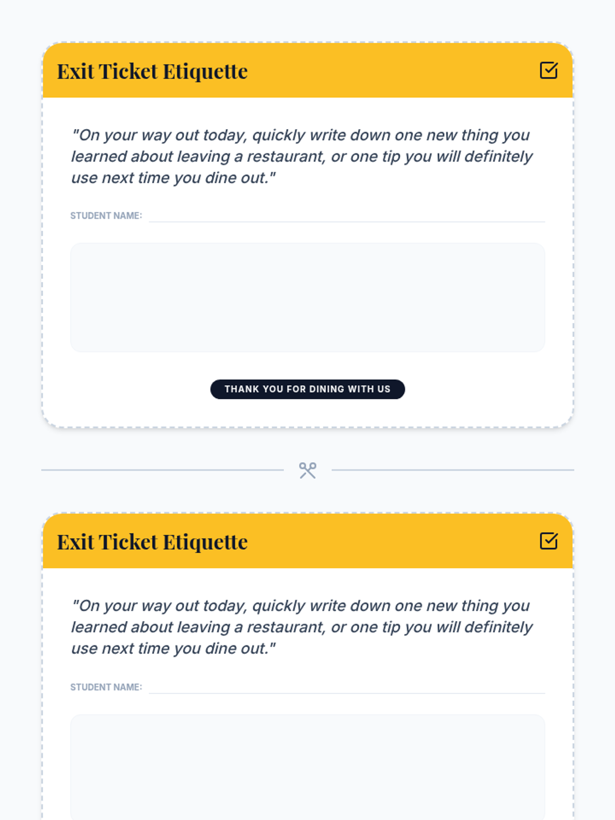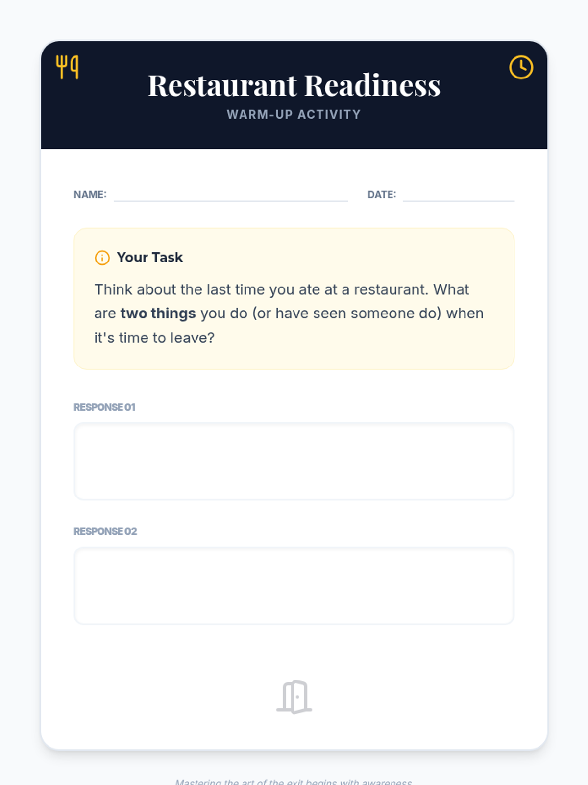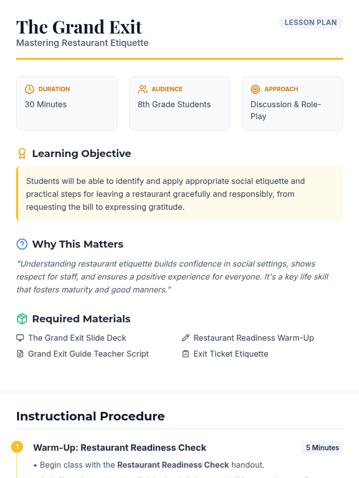 This lesson teaches 8th-grade students the essential social etiquette and practical steps for leaving a restaurant gracefully, covering bill review, tipping, and polite departures.