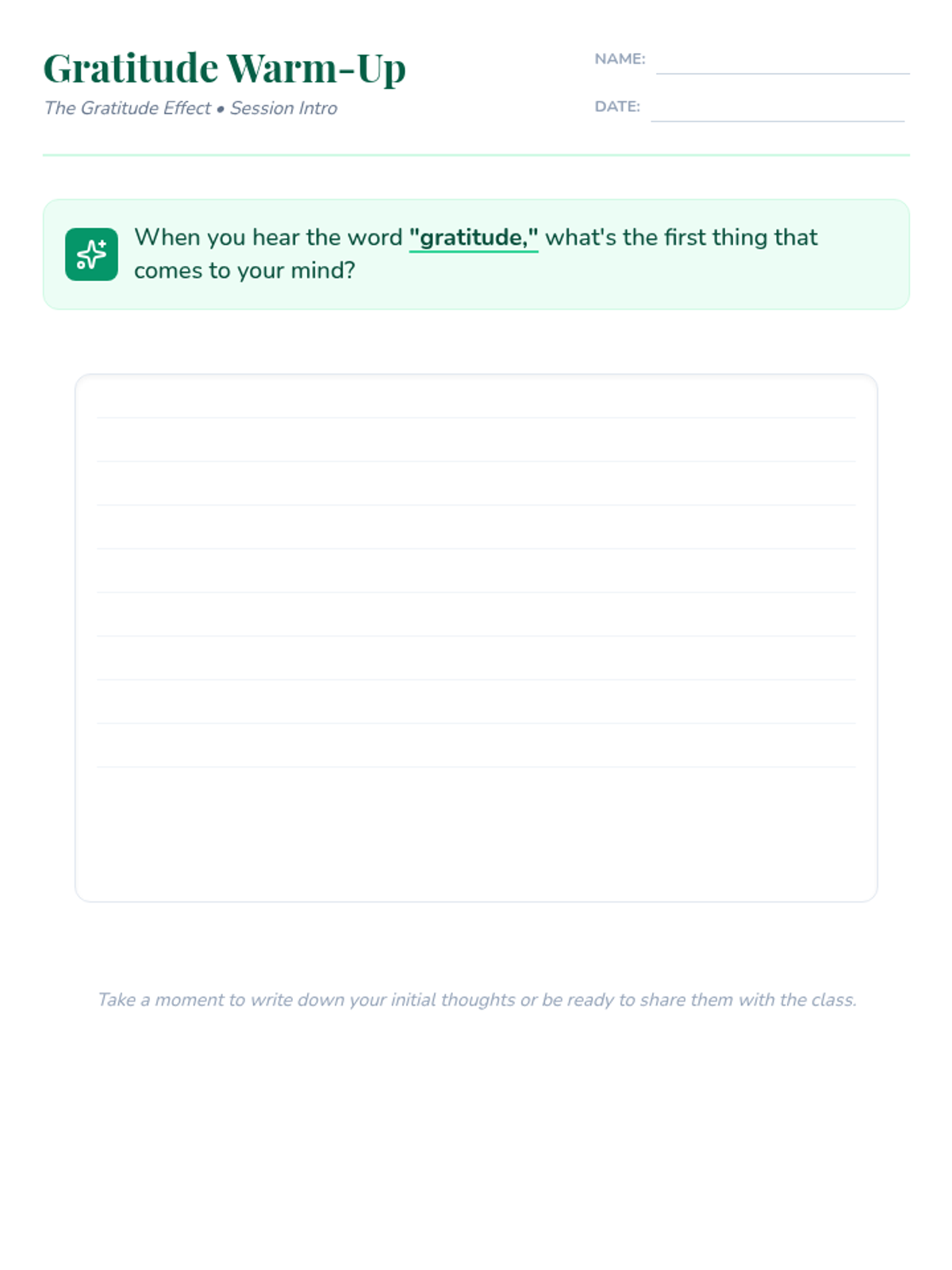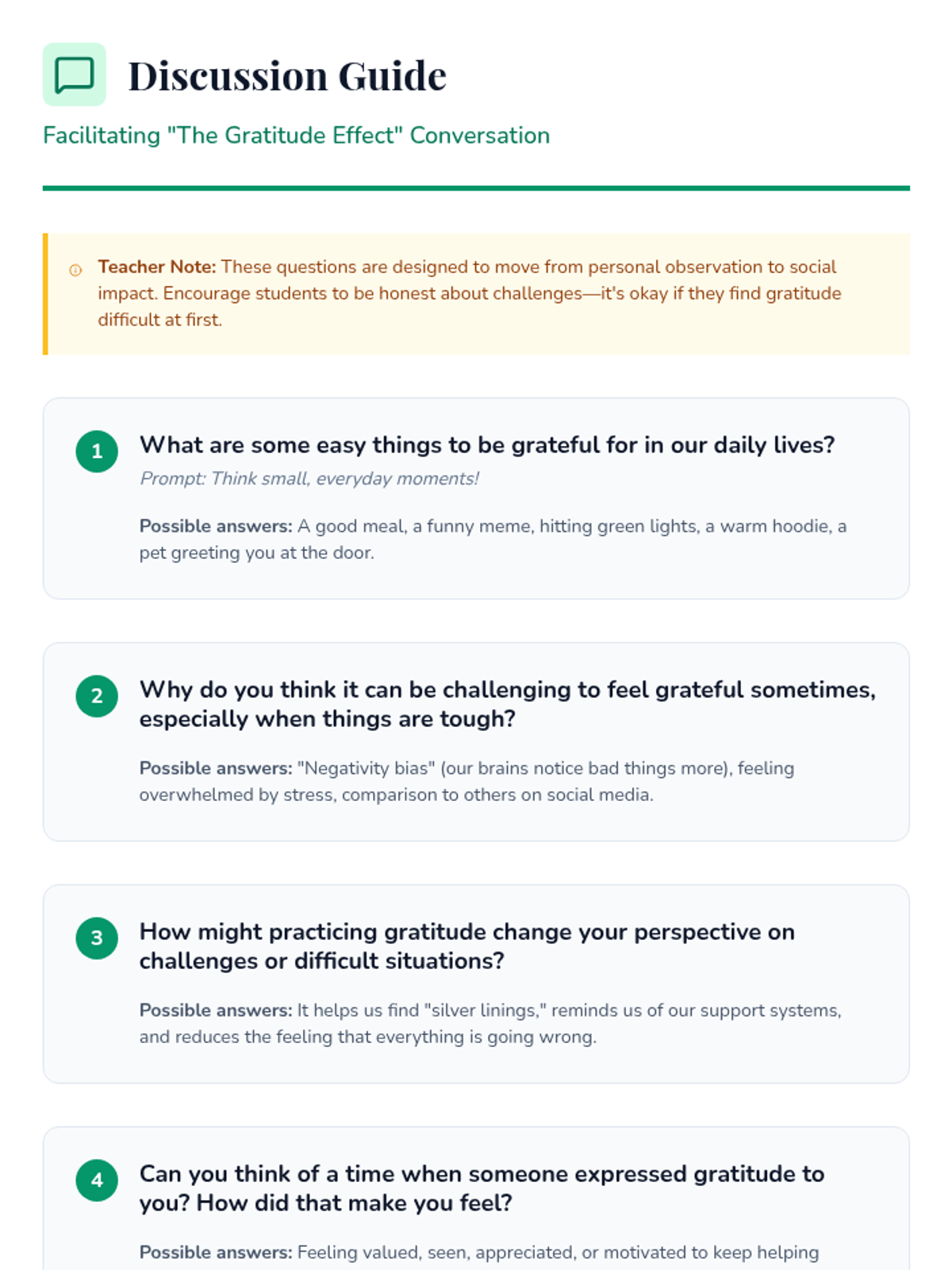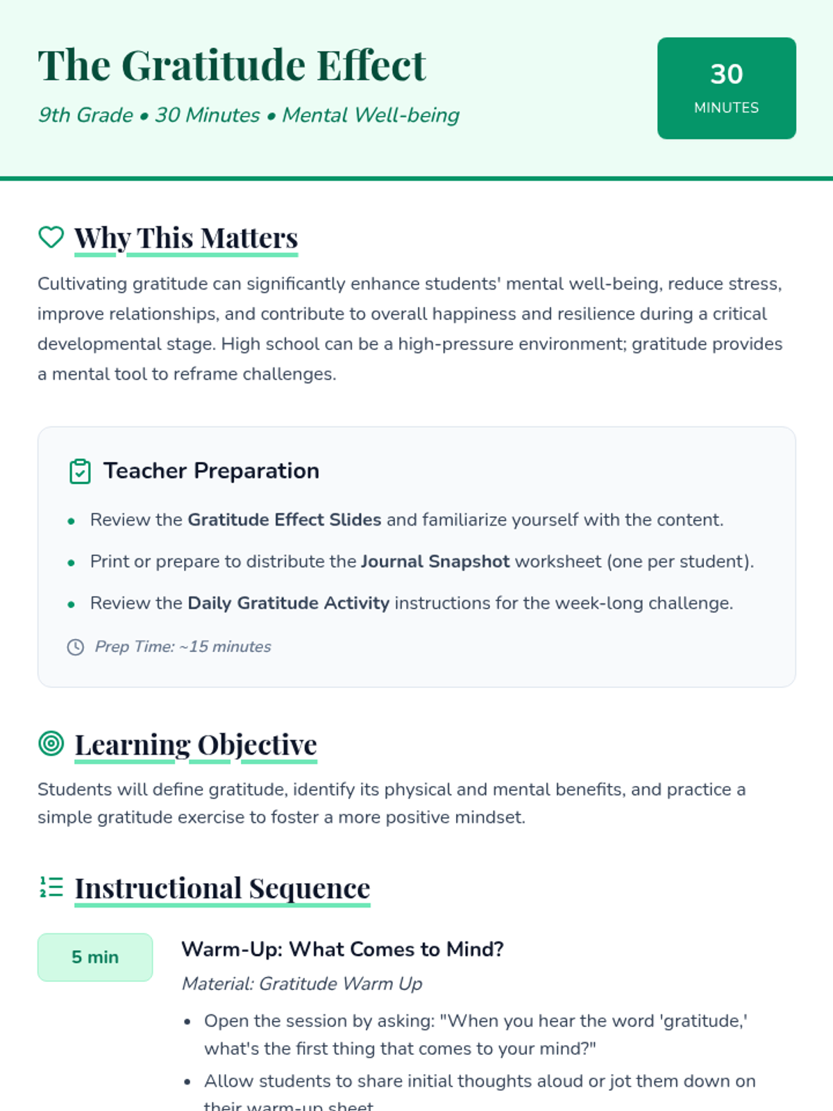 A 30-minute introductory lesson for 9th graders exploring the science and practice of gratitude to improve mental well-being and resilience.