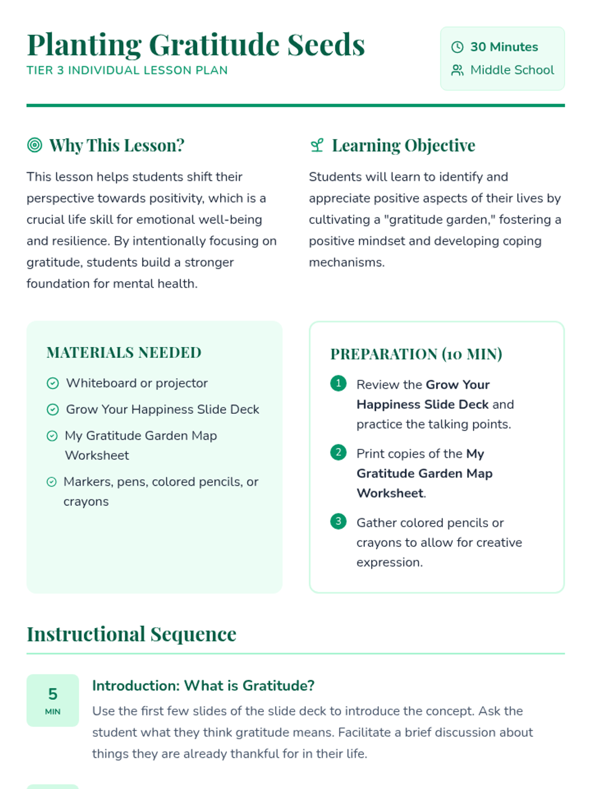 A Tier 3 individual counseling lesson focused on cultivating positivity and resilience through the 'Gratitude Garden' metaphor. Students identify and appreciate various positive aspects of their lives to develop healthy coping mechanisms.