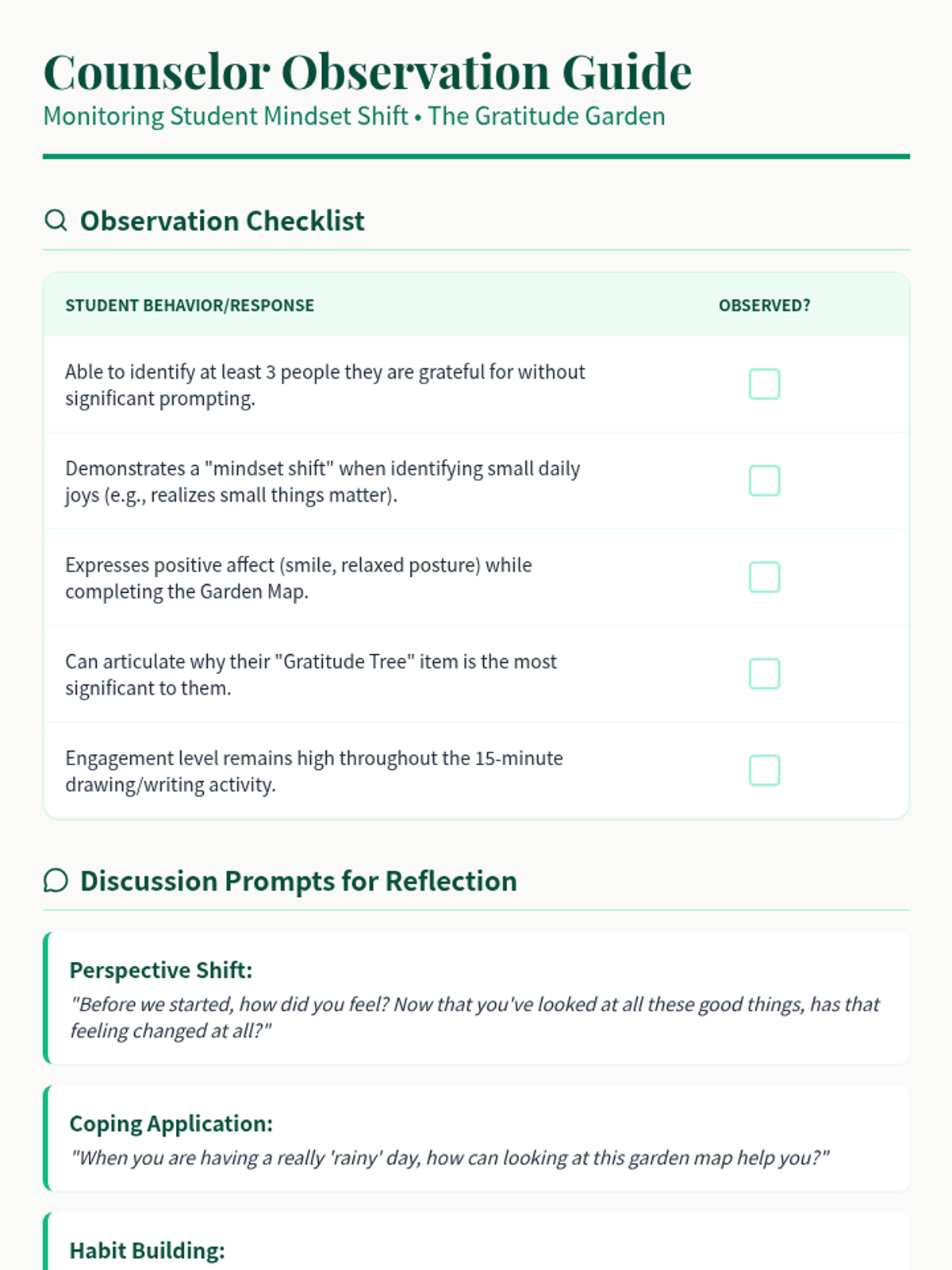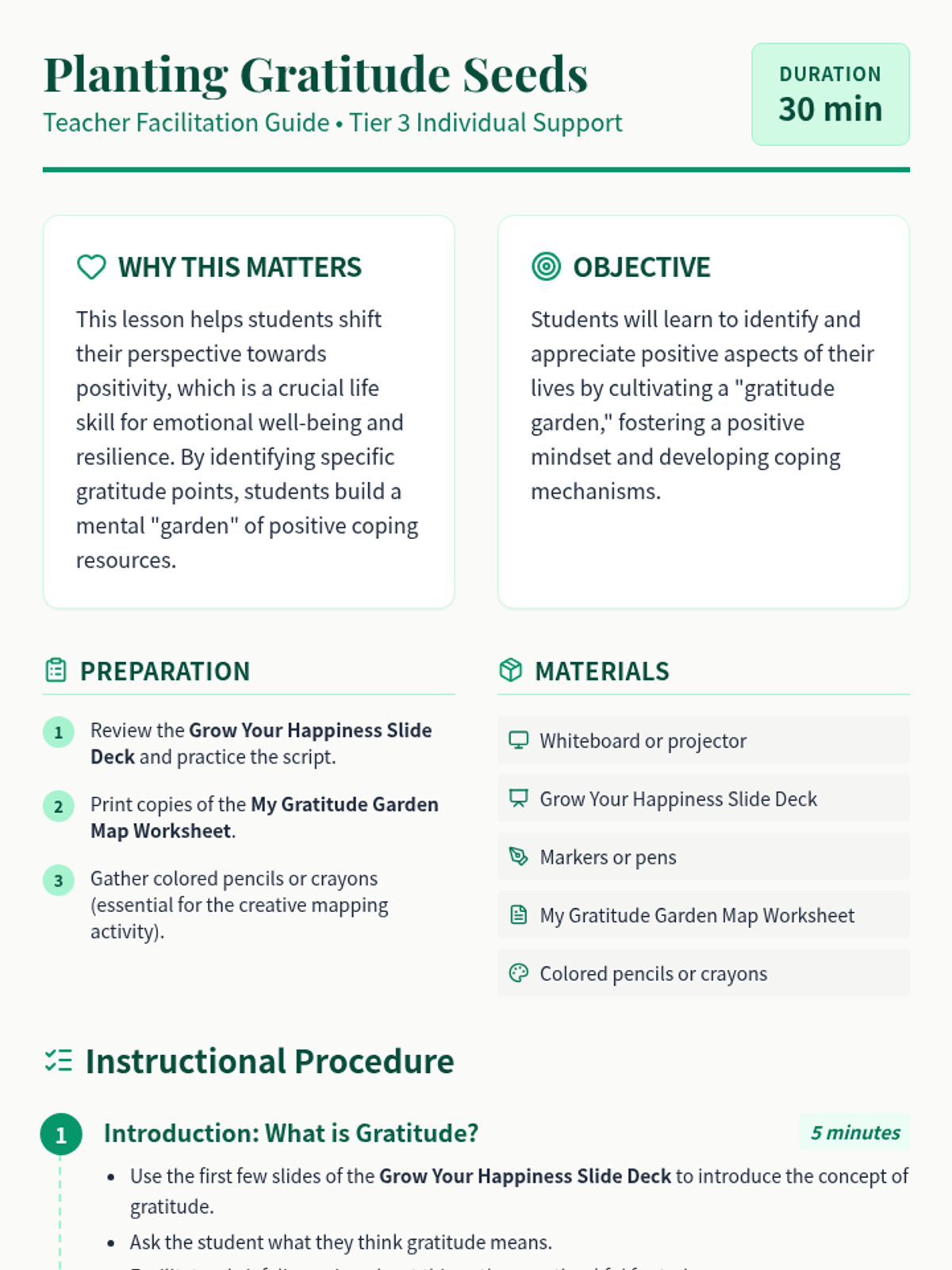 A Tier 3 individual counseling lesson that uses a garden metaphor to help middle school students identify and cultivate gratitude to foster a positive mindset and resilience.