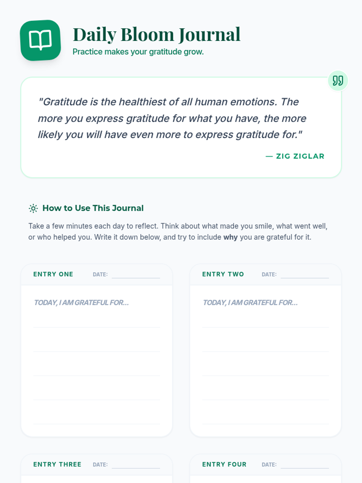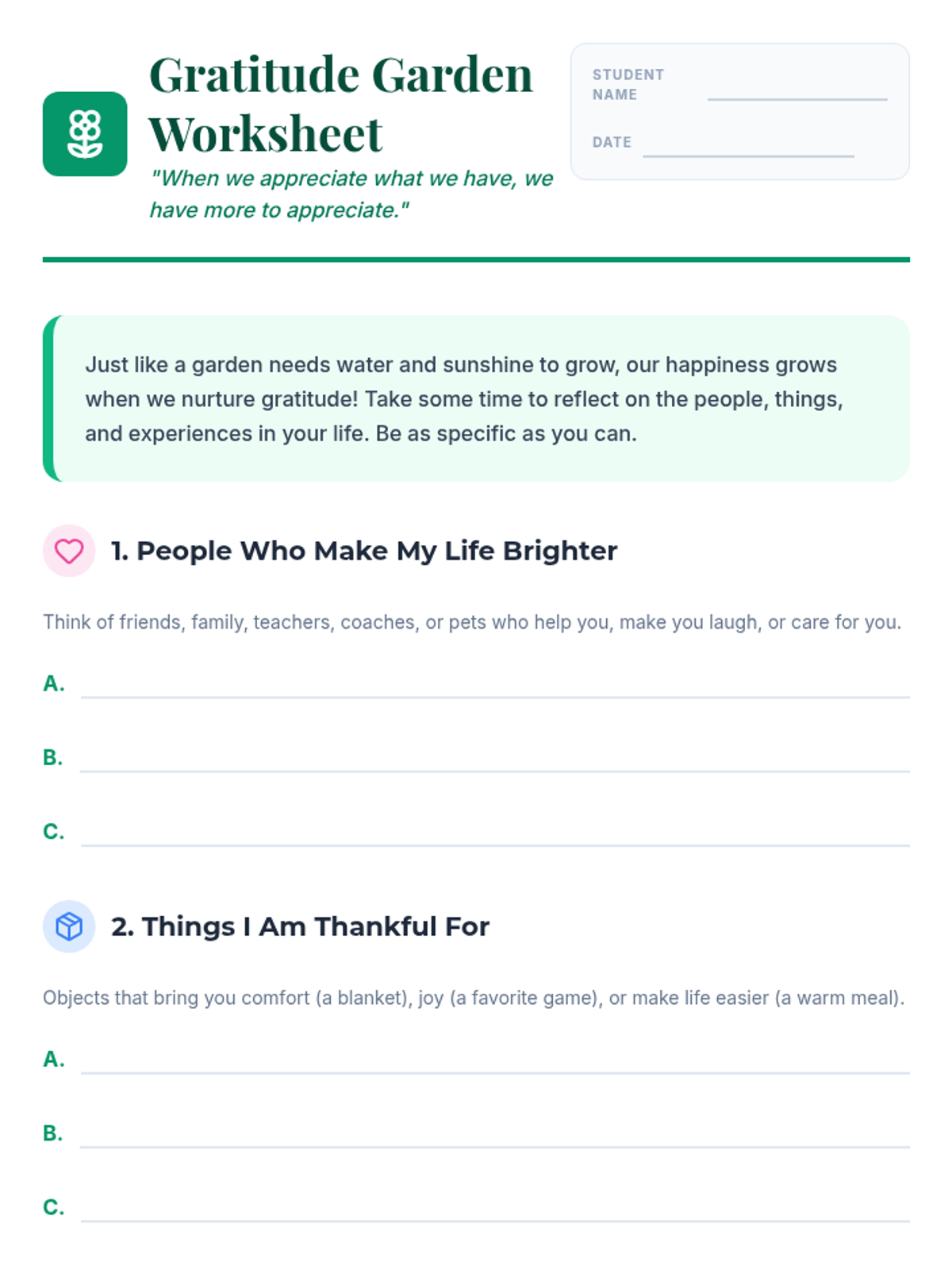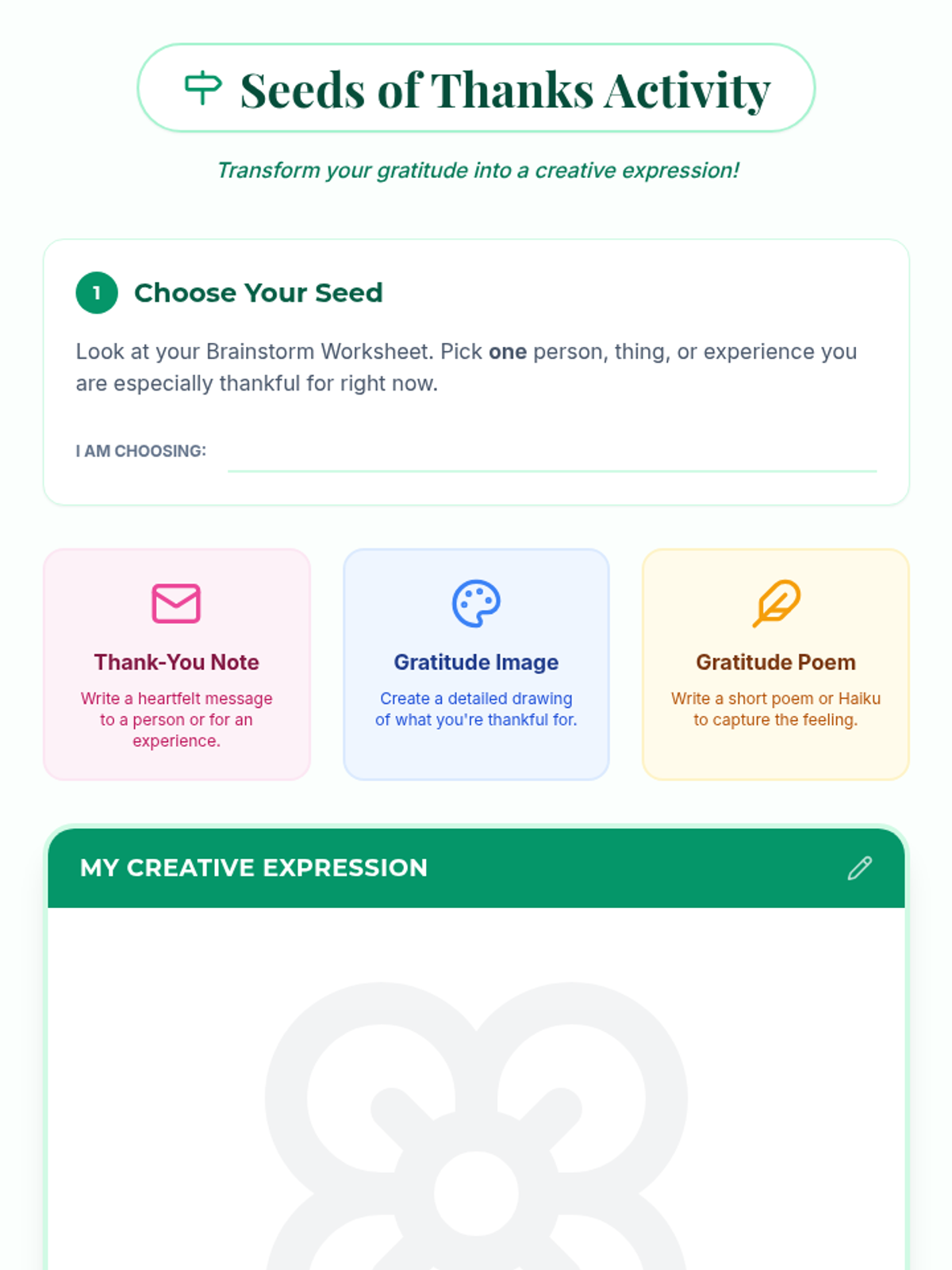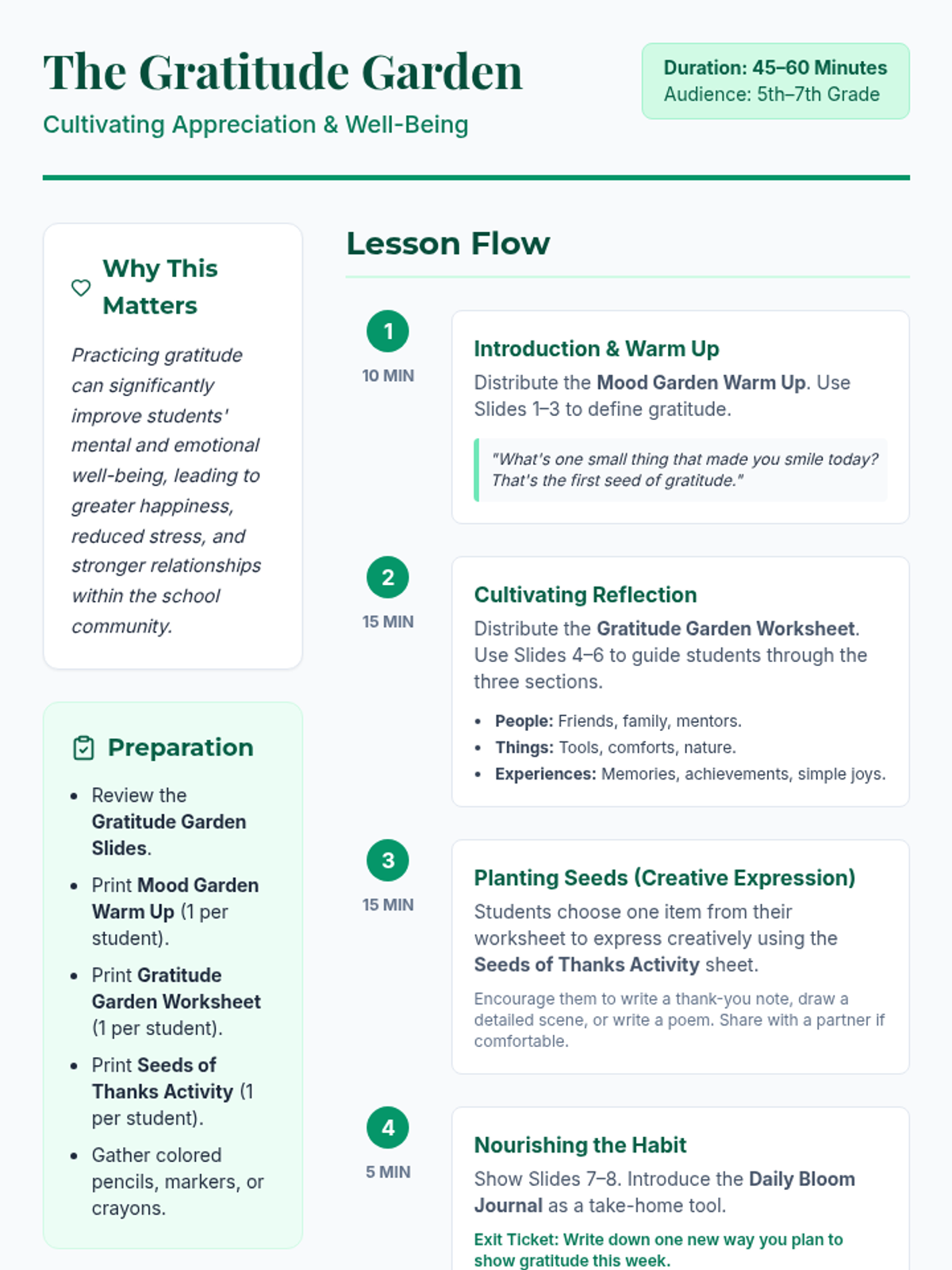 This lesson for 5th-7th graders introduces the concept of gratitude and its positive impact on well-being. Through guided reflection and creative expression, students will identify things, people, and experiences they are thankful for, learning to practice appreciation daily to foster optimism and connection.