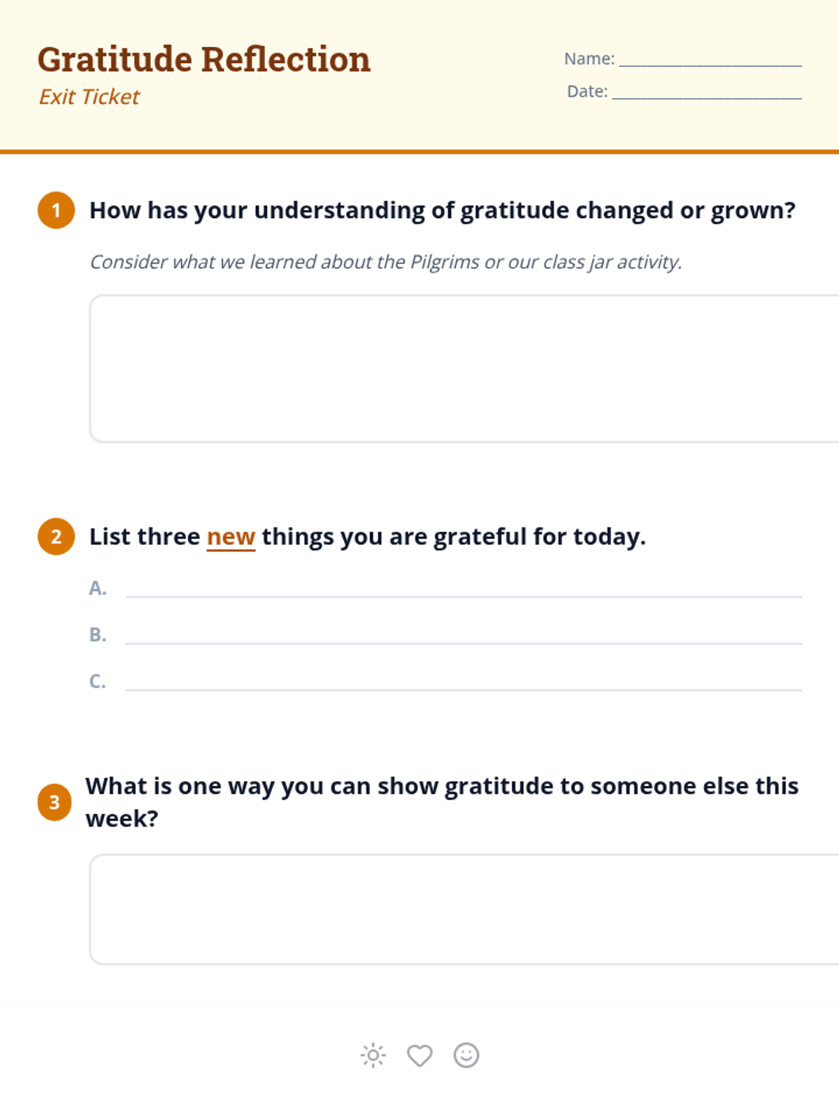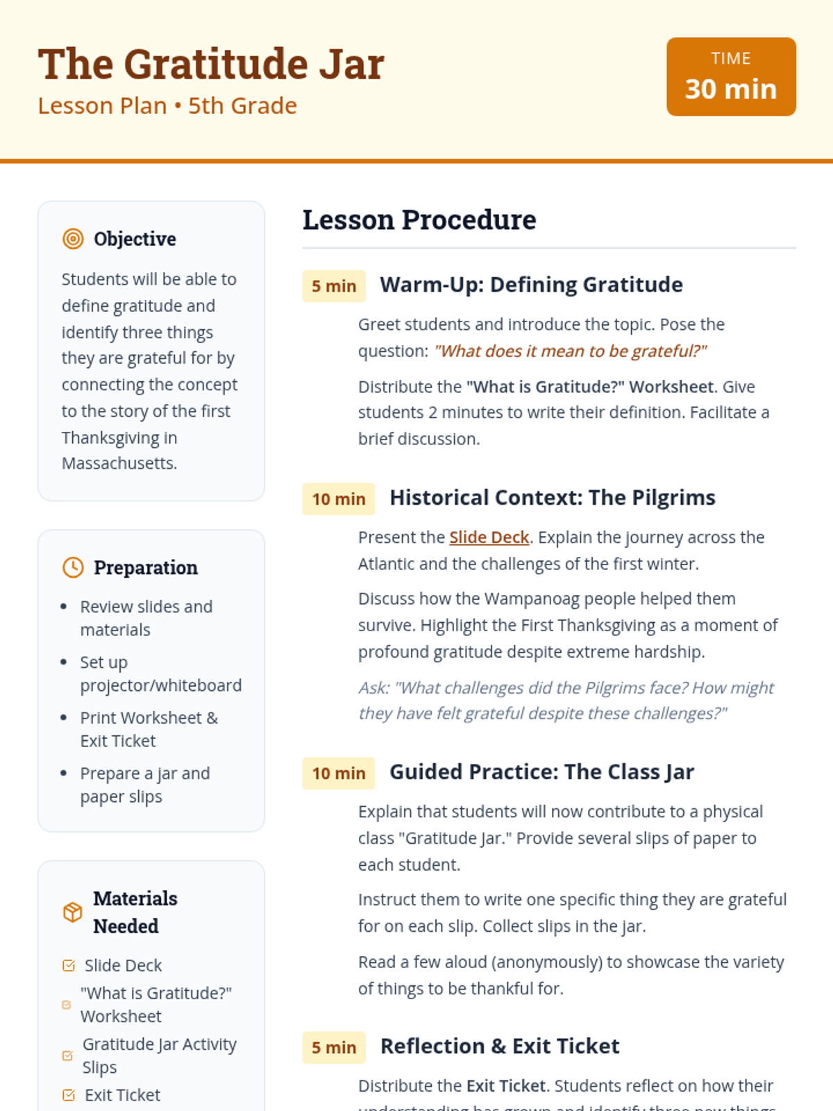 A 30-minute 5th-grade lesson exploring gratitude through the historical lens of the Pilgrims' first Thanksgiving, helping students define and practice thankfulness in their own lives.