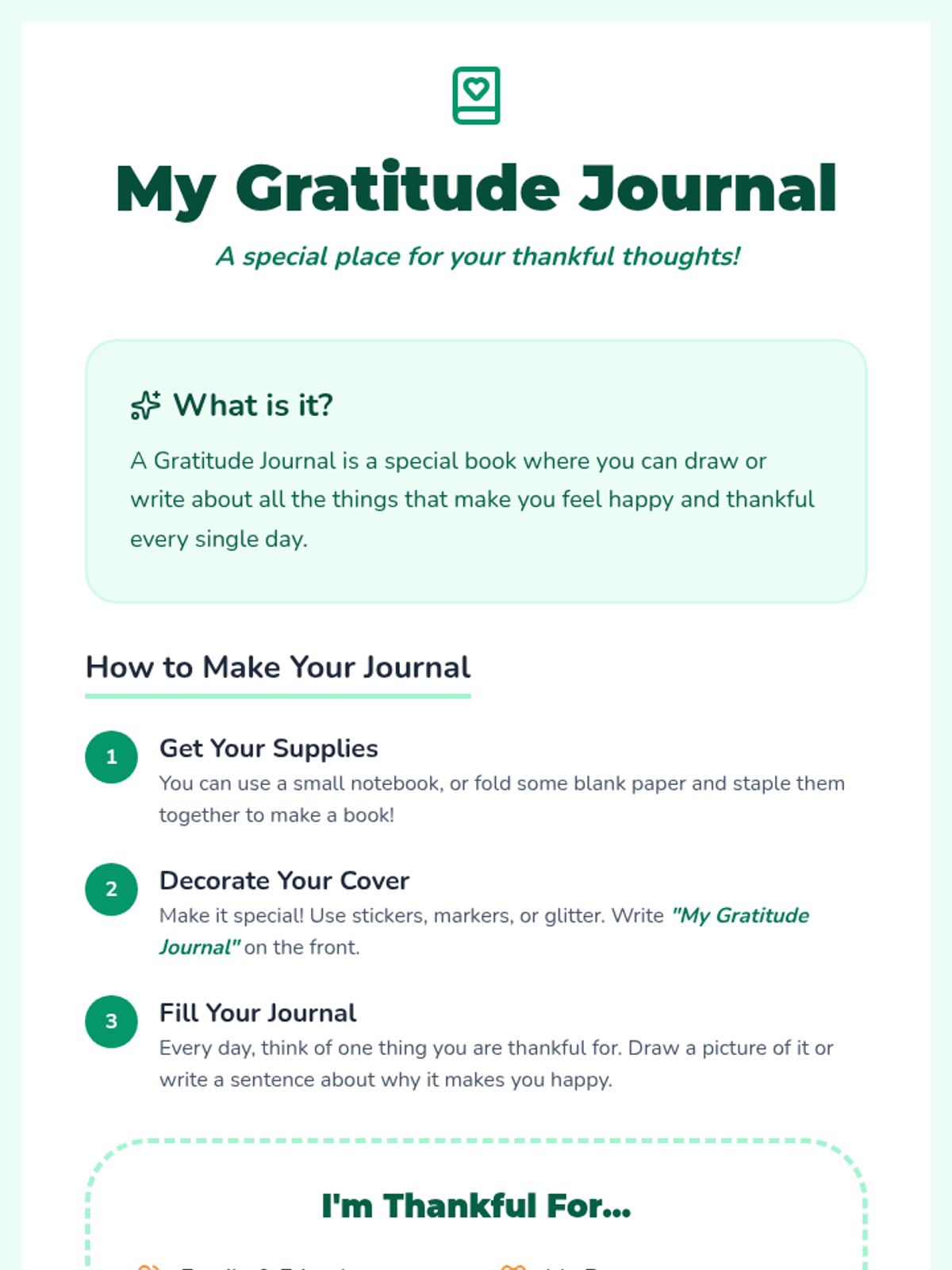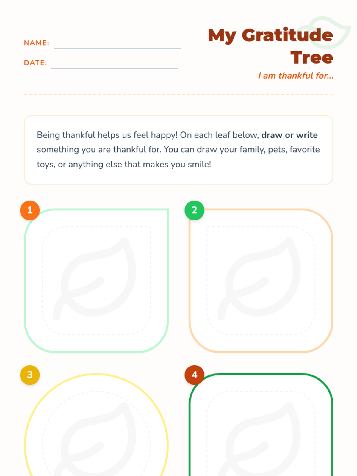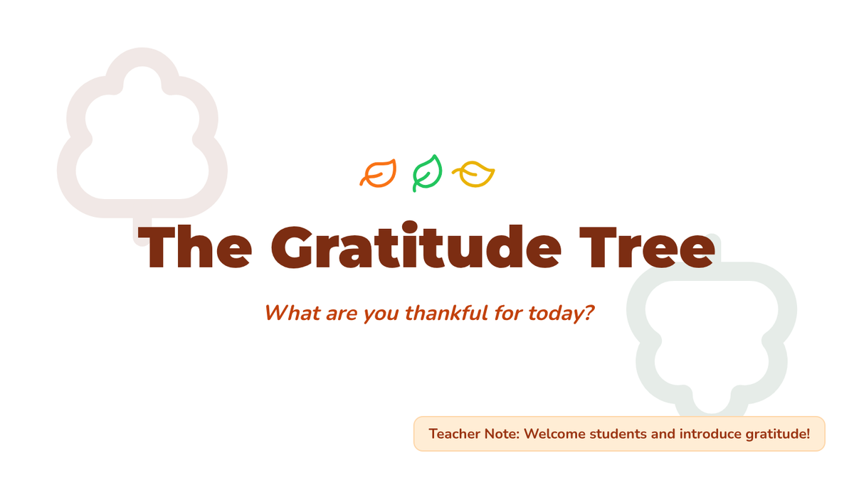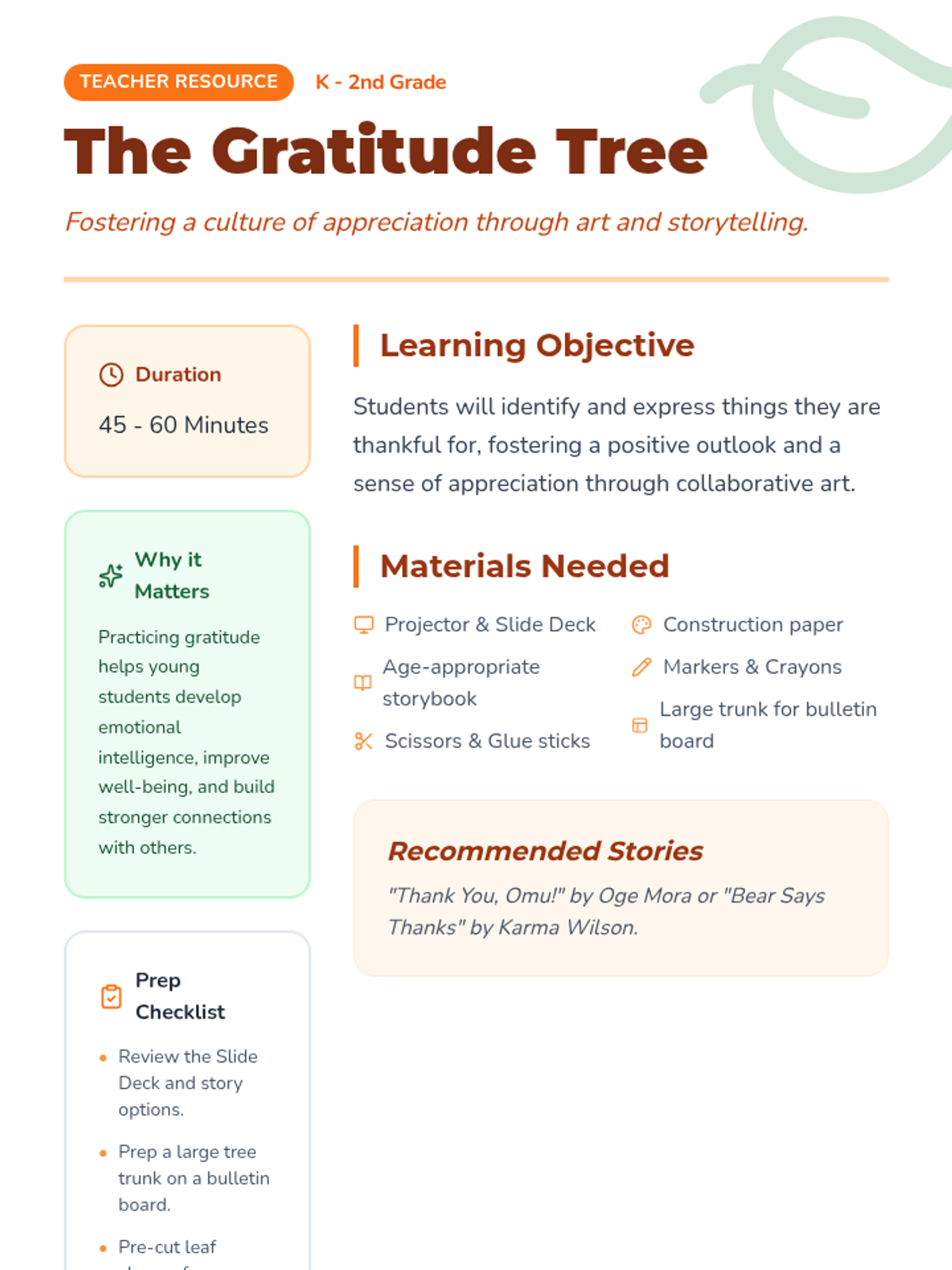 A heartfelt lesson for young learners to explore gratitude through storytelling, art, and collaboration. Students will create individual leaves to build a classroom 'Gratitude Tree', fostering a positive and appreciative environment.