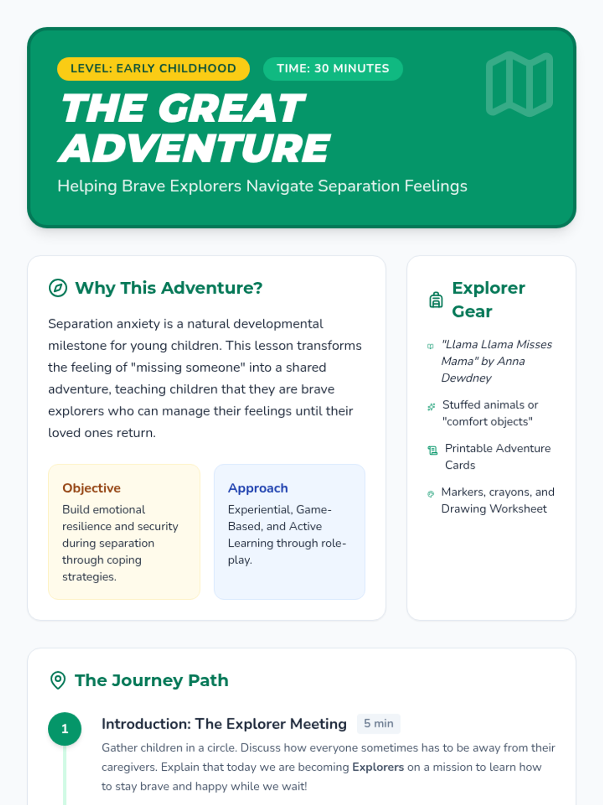 A playful, adventure-themed lesson designed for 4-year-olds to help them manage separation anxiety through storytelling, role-play, and coping strategies.