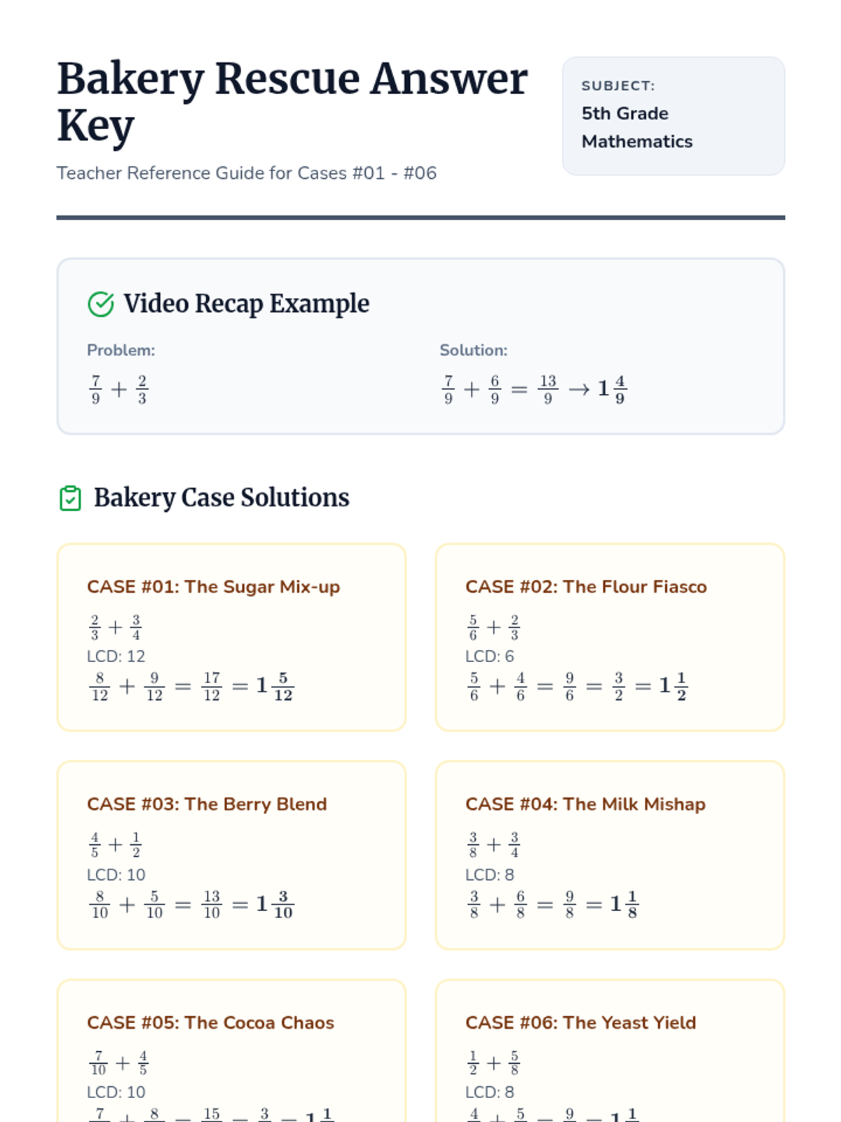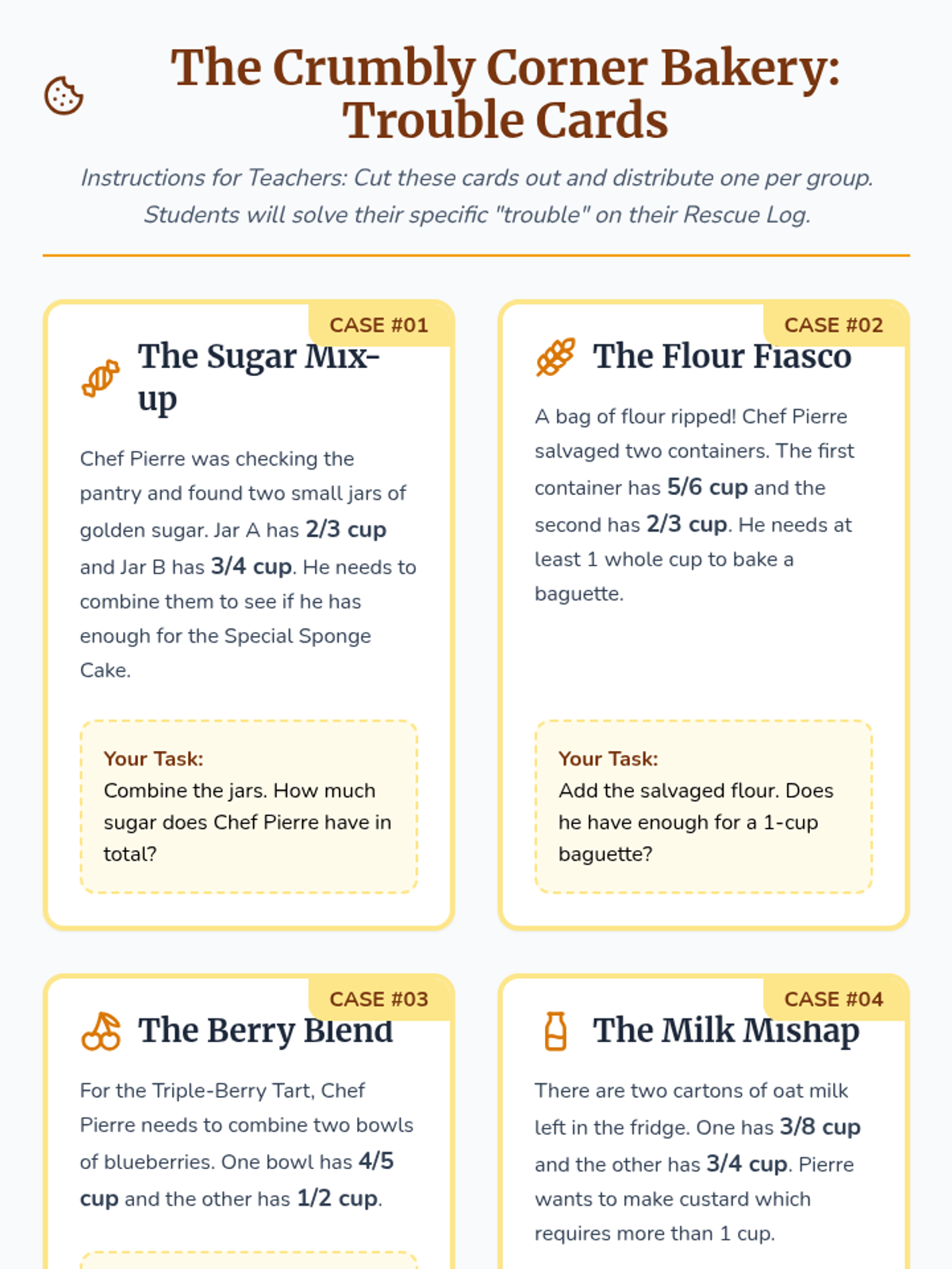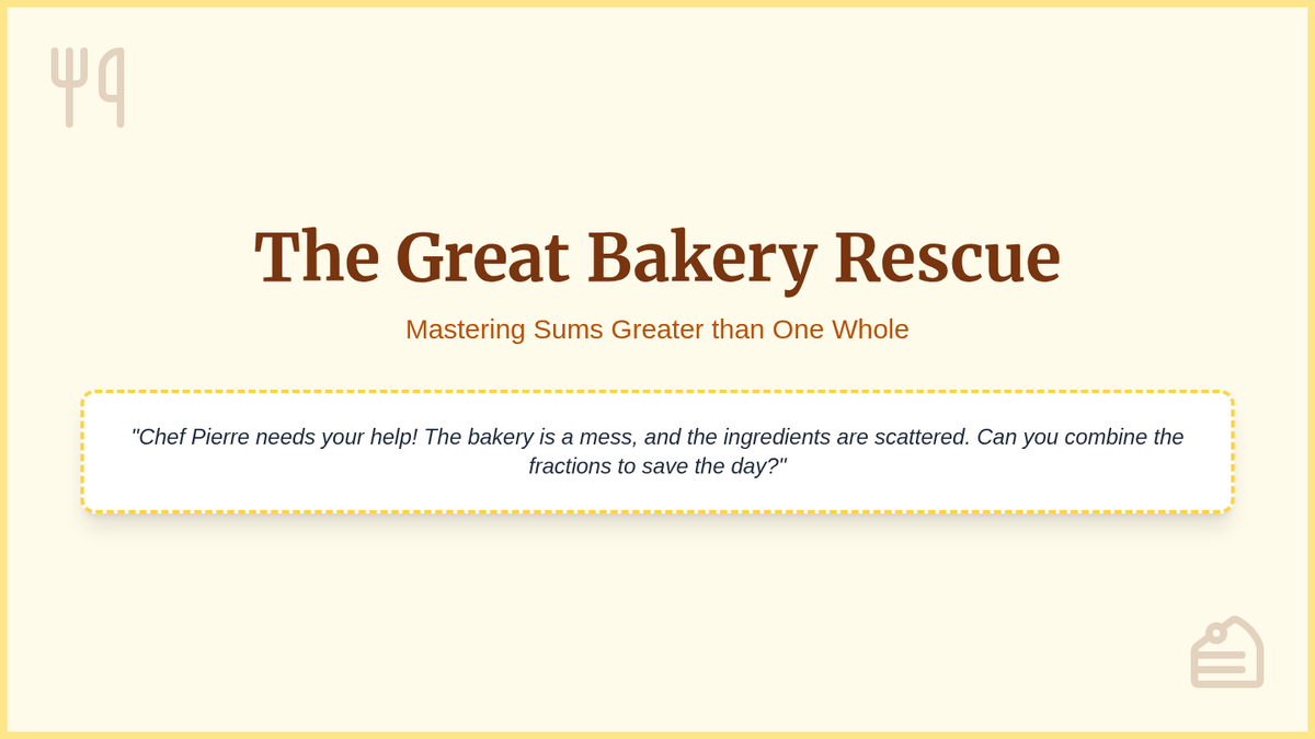 Students help 'The Crumbly Corner Bakery' combine leftover ingredients to rescue a day of baking, mastering fraction addition with sums greater than one whole.