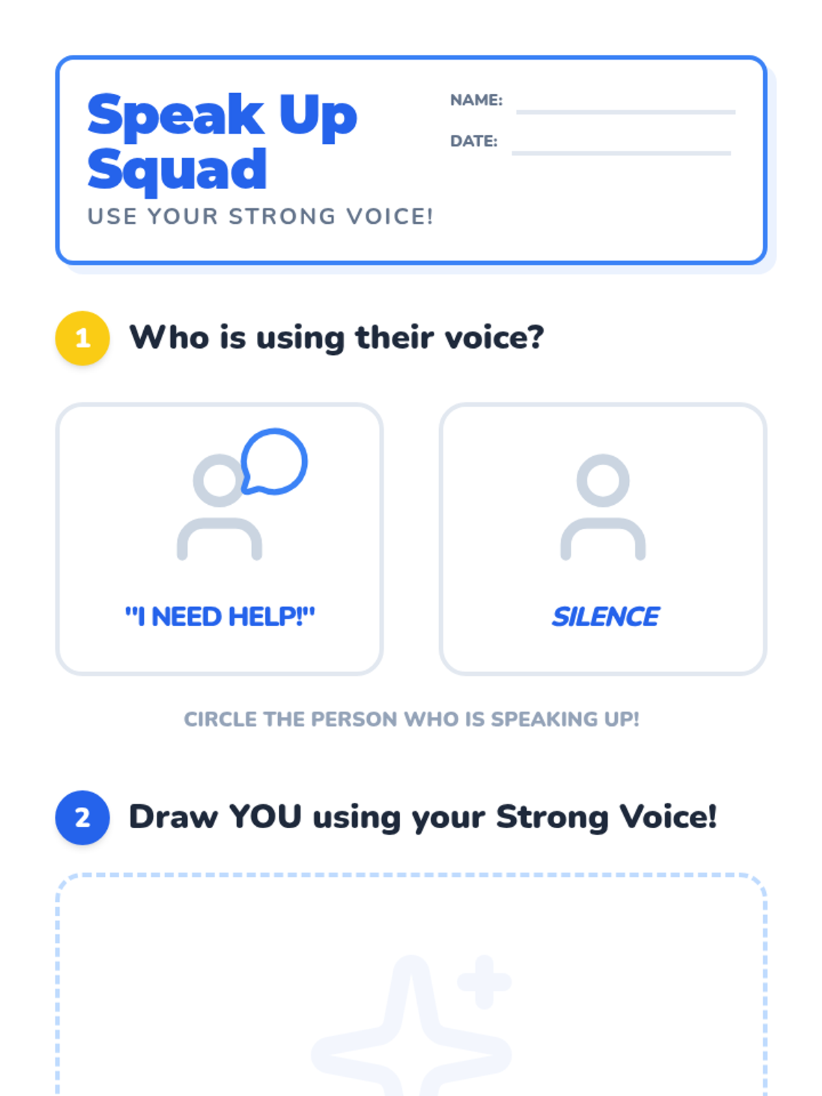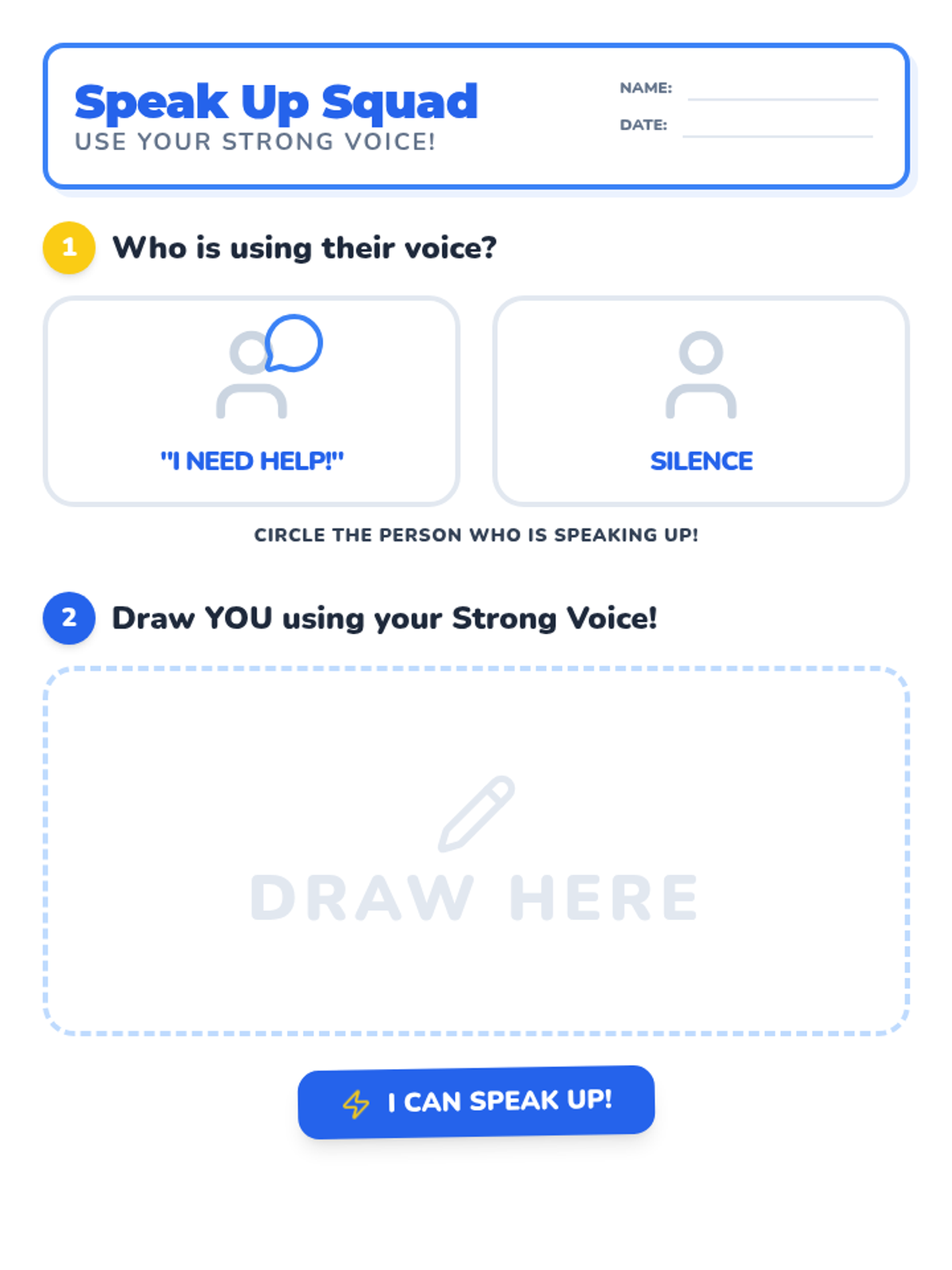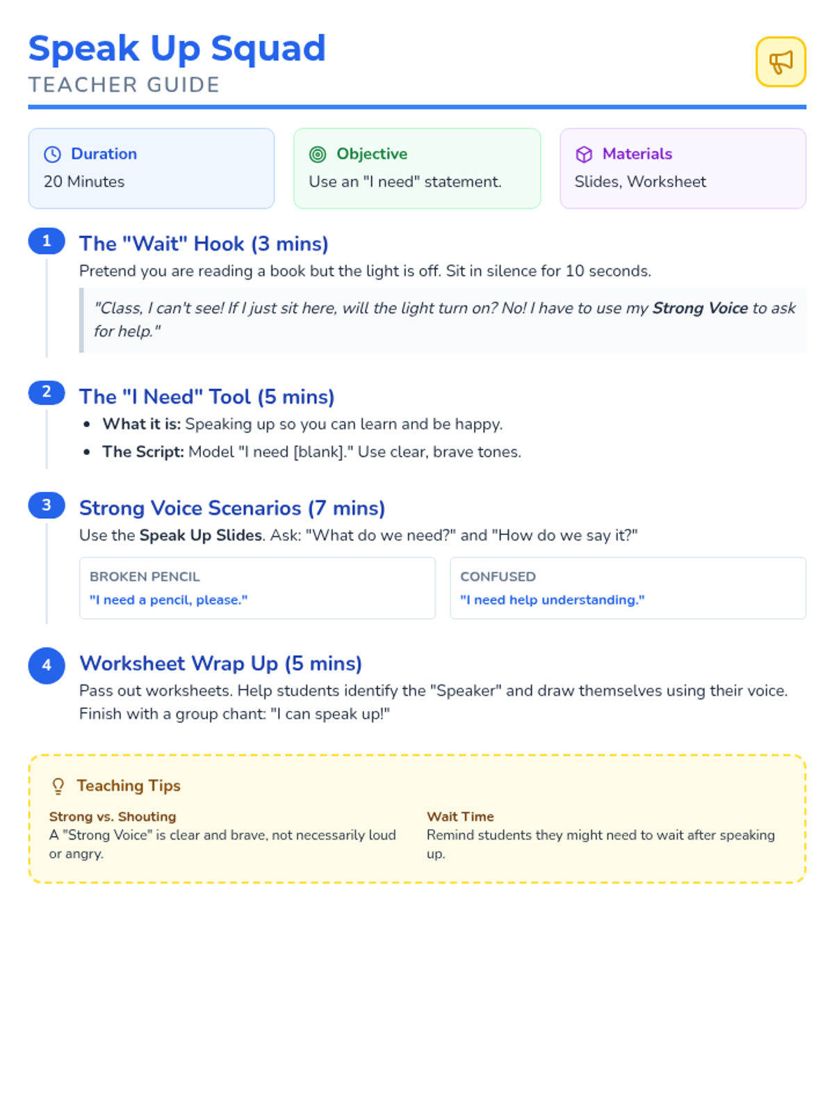 A 20-minute introductory lesson for kindergarteners on self-advocacy, focusing on identifying needs and using a 'Strong Voice' to ask for help.