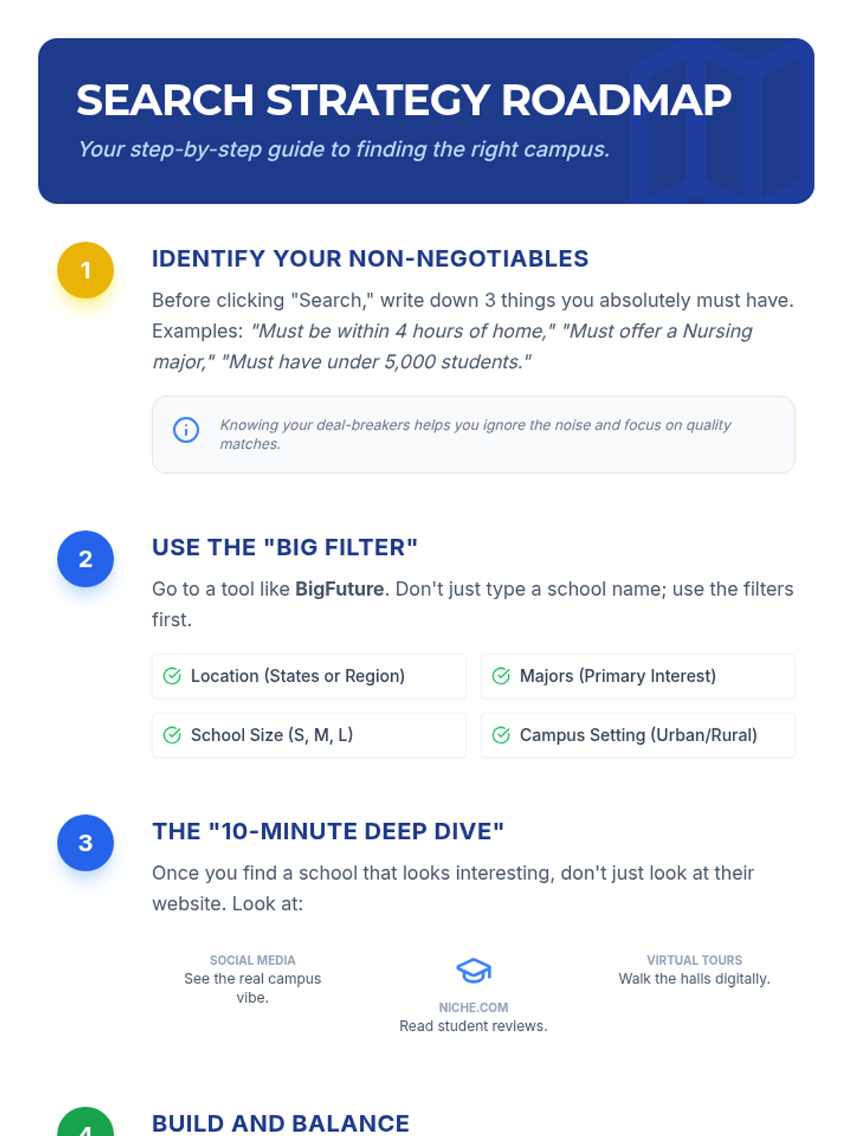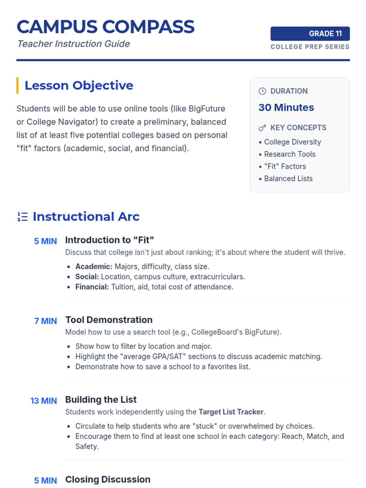This lesson guides 11th-grade students through the initial stages of college research, focusing on 'fit' factors and utilizing online tools to build a preliminary, balanced list of schools.