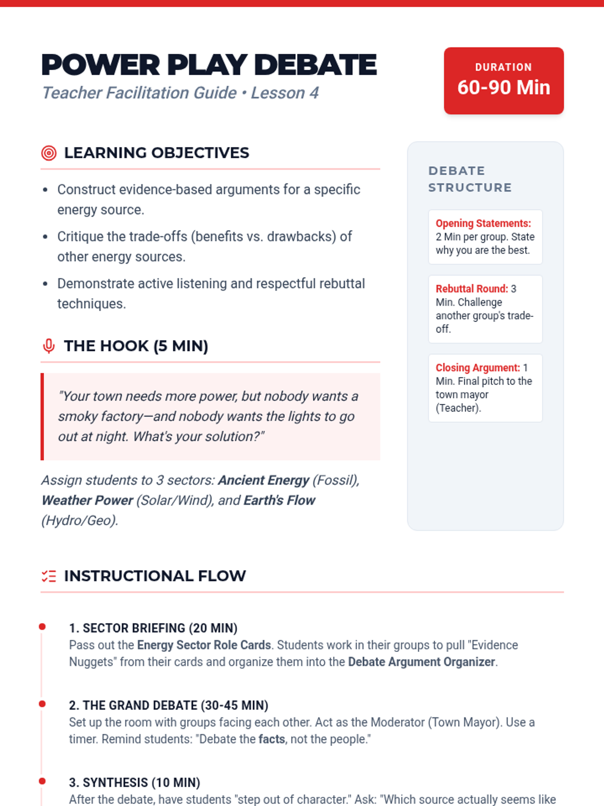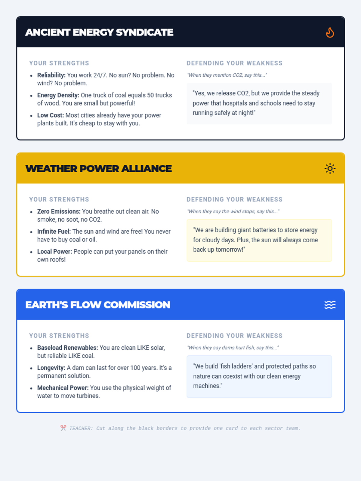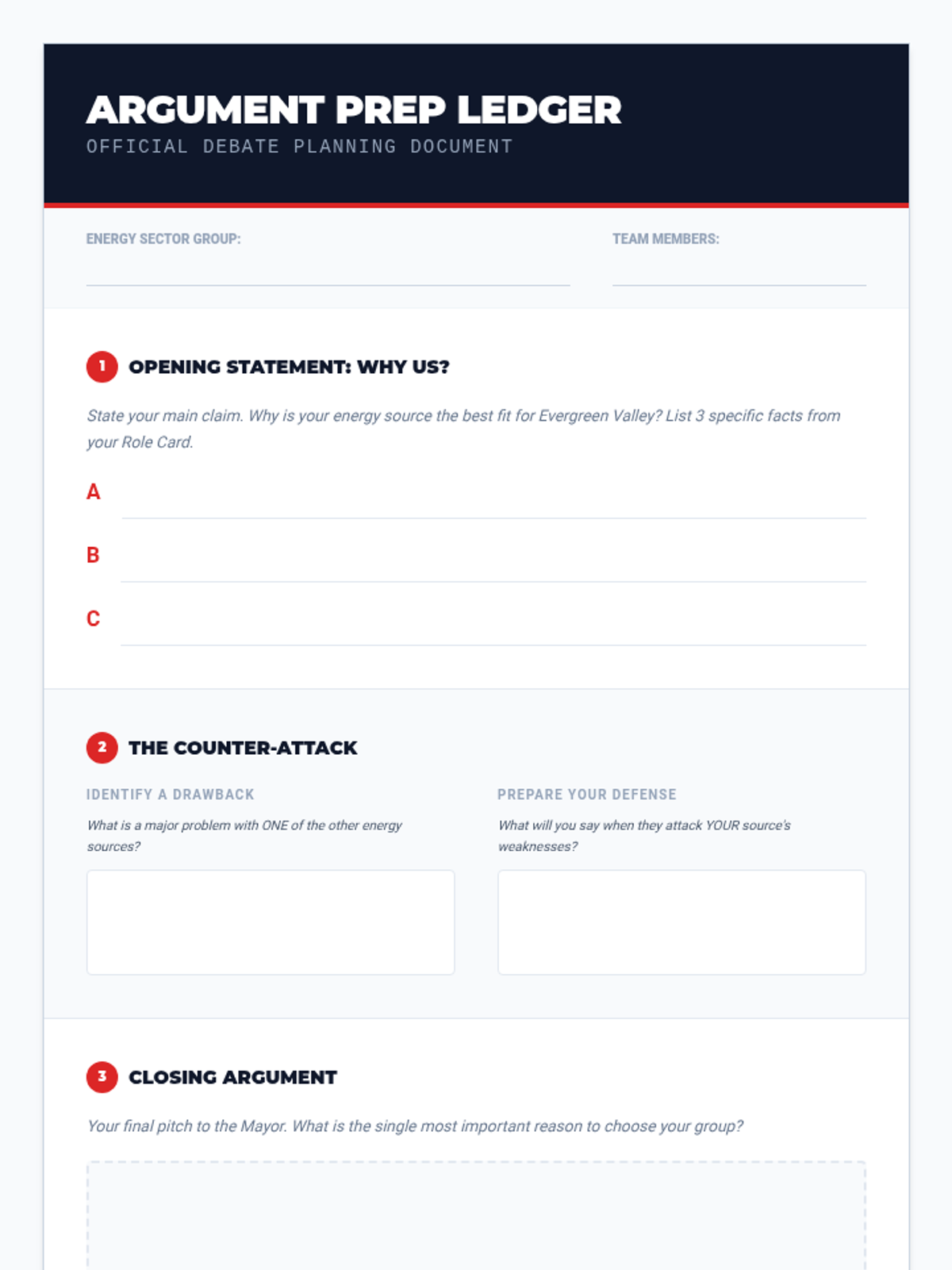 A structured debate where students represent different energy sectors to decide the future power source of a hypothetical town.
