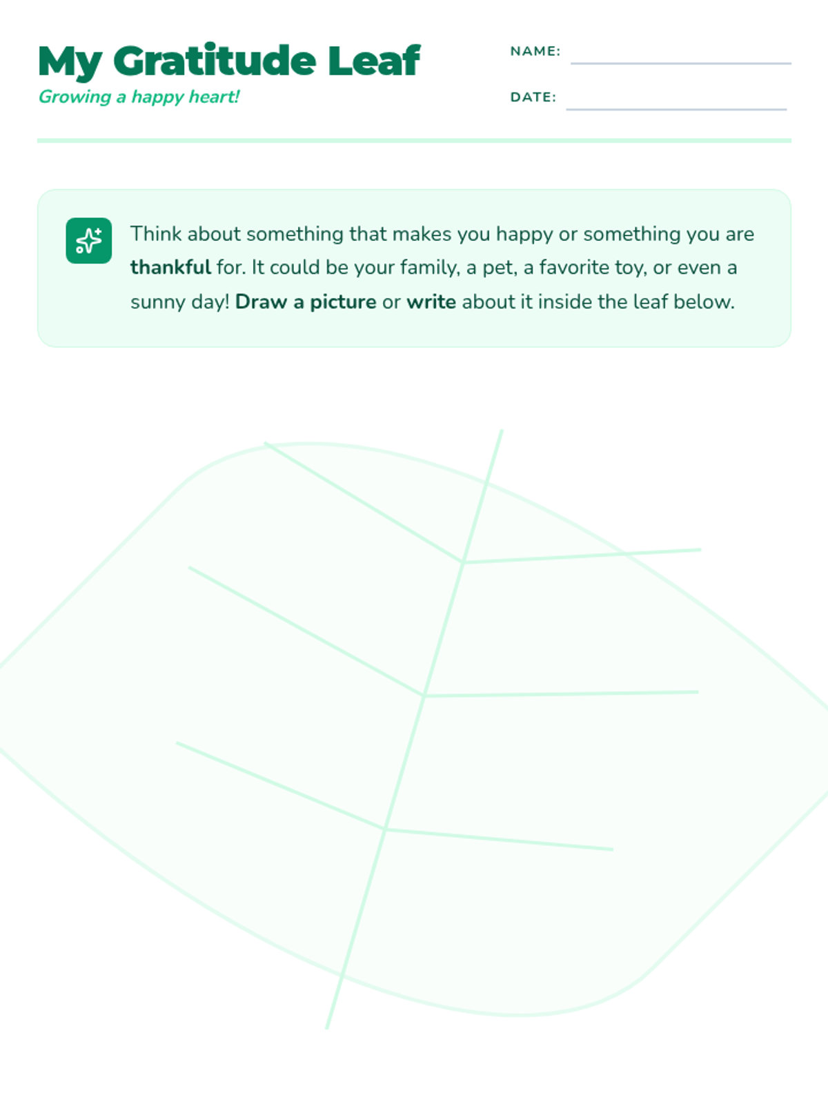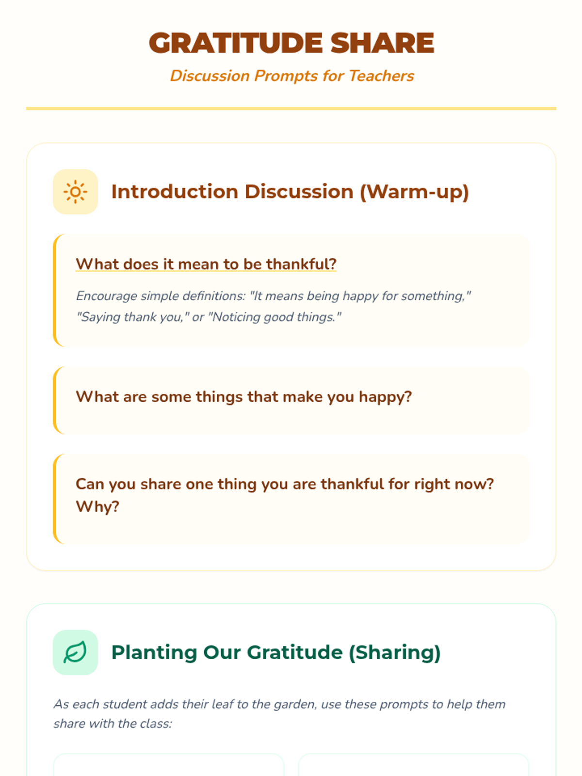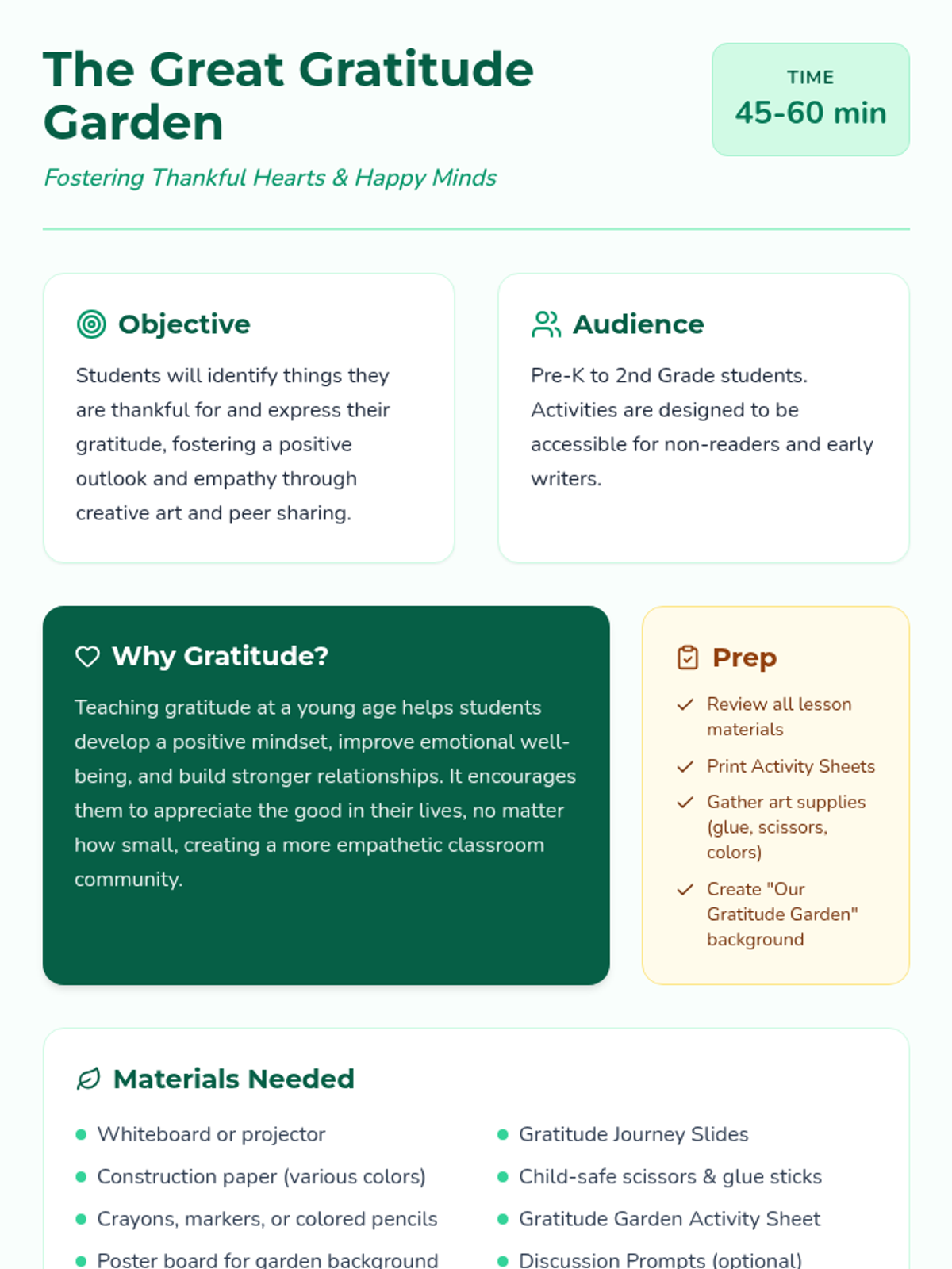 A whimsical, art-based lesson for Pre-K to 2nd grade students to explore gratitude by creating a collaborative classroom garden of 'thankful leaves'. Students will identify things they are grateful for and share them with their peers.