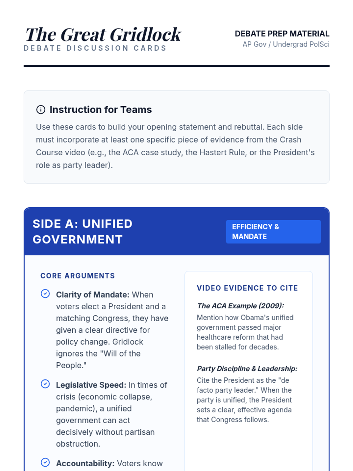 An analysis of legislative efficiency through the lens of unified vs. divided government, featuring a debate on gridlock and a case study of the Affordable Care Act.