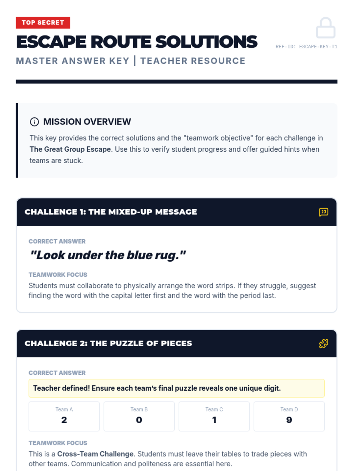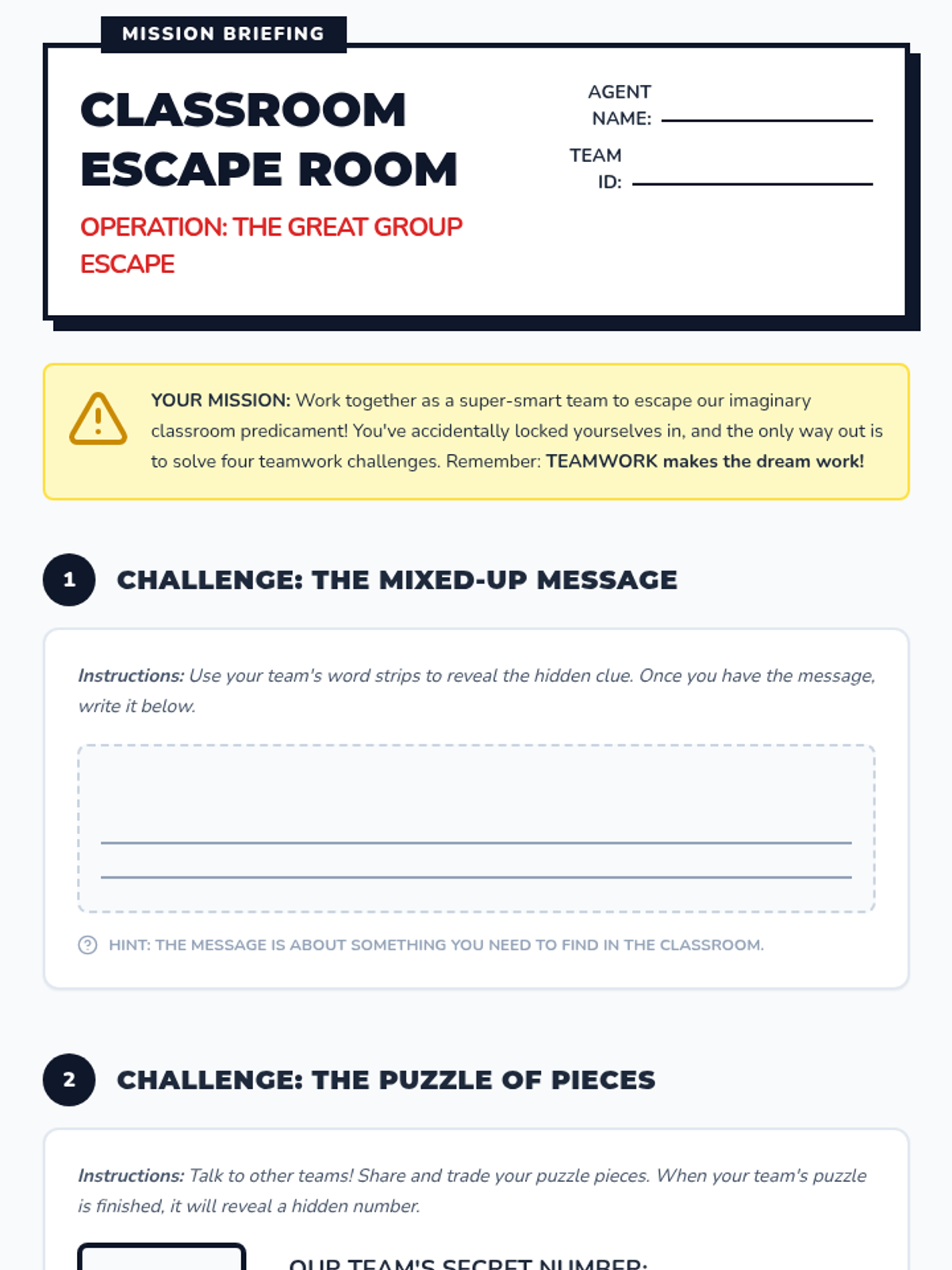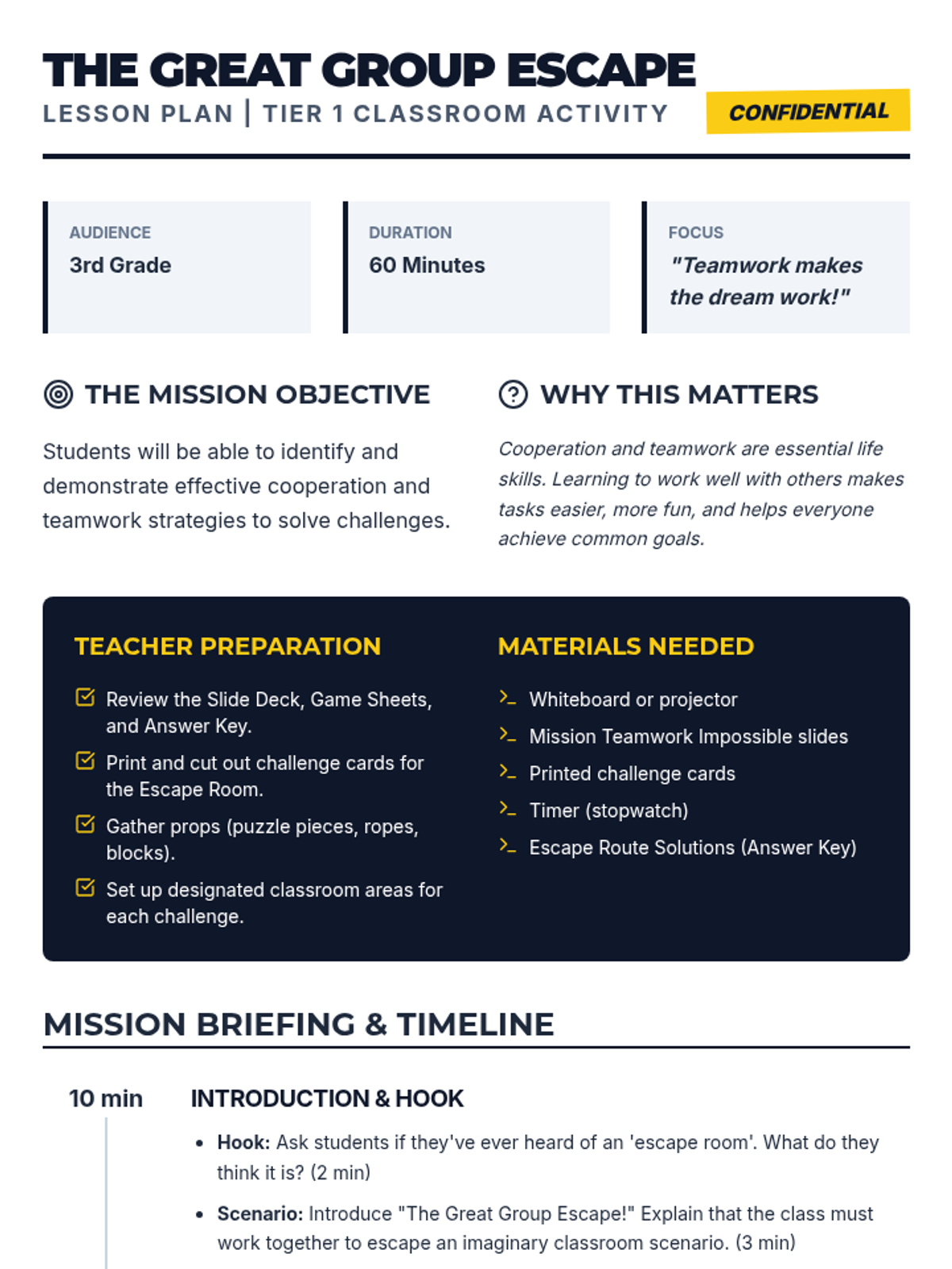 A high-energy, game-based lesson where 3rd-grade students work together in small teams and as a whole class to solve challenges and 'escape' a hypothetical scenario. This lesson emphasizes the importance of communication, listening, and collective problem-solving.
