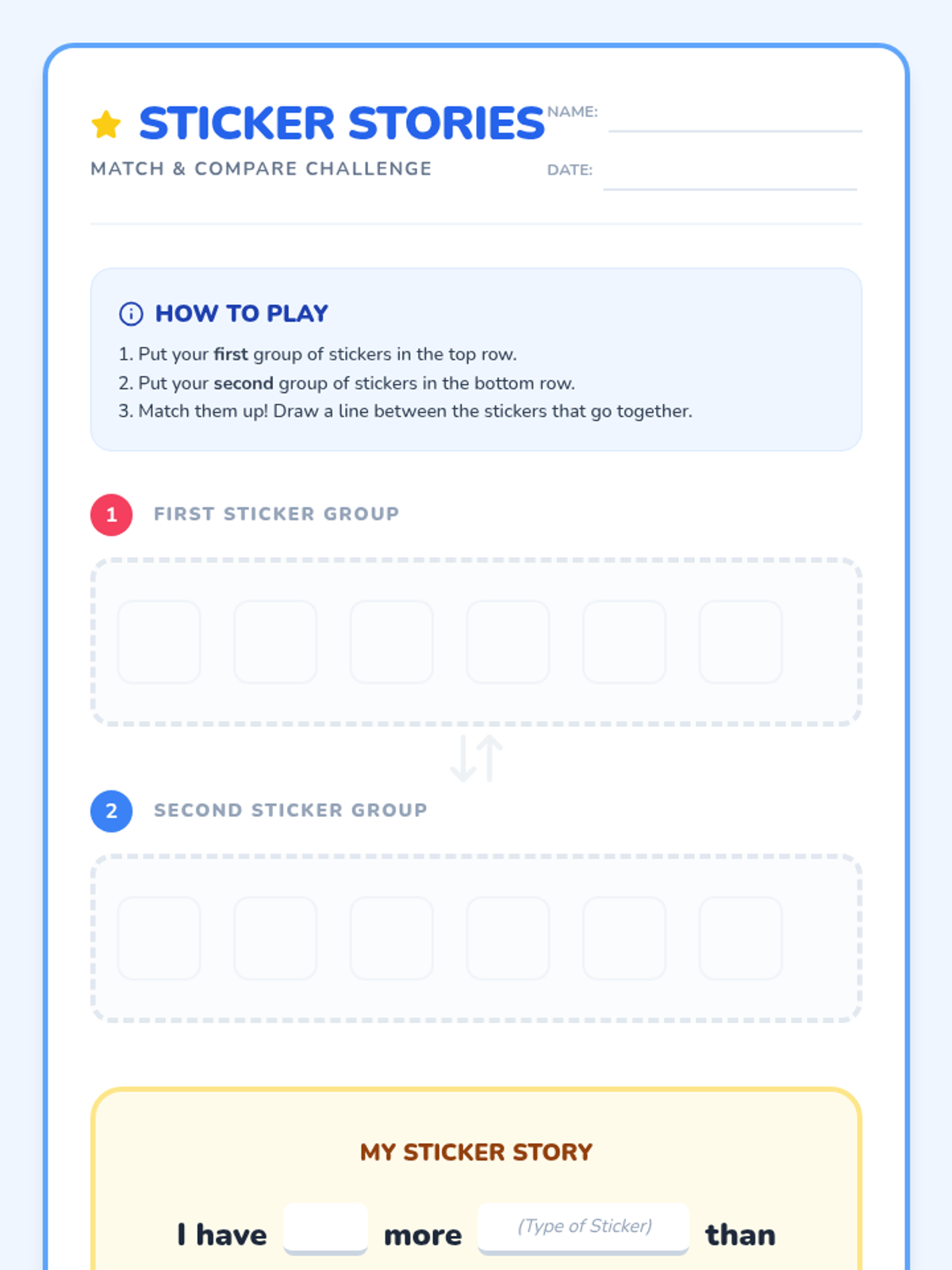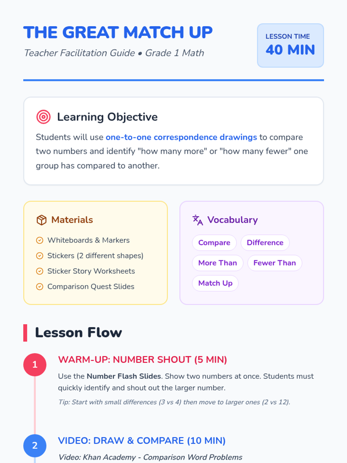 A 1st-grade lesson focused on using one-to-one correspondence to compare quantities. Students use drawing strategies and sticker activities to visualize the difference between two numbers.
