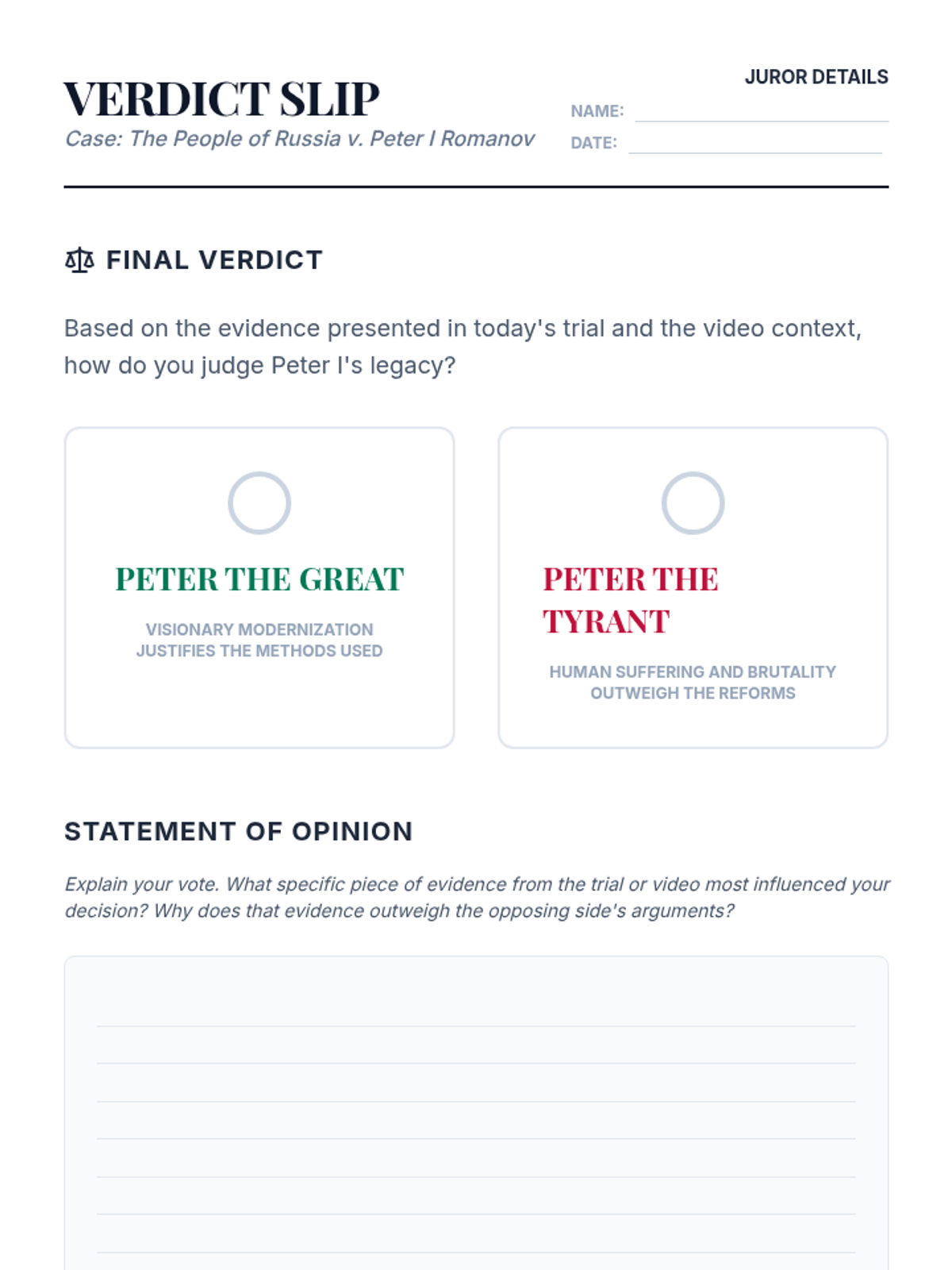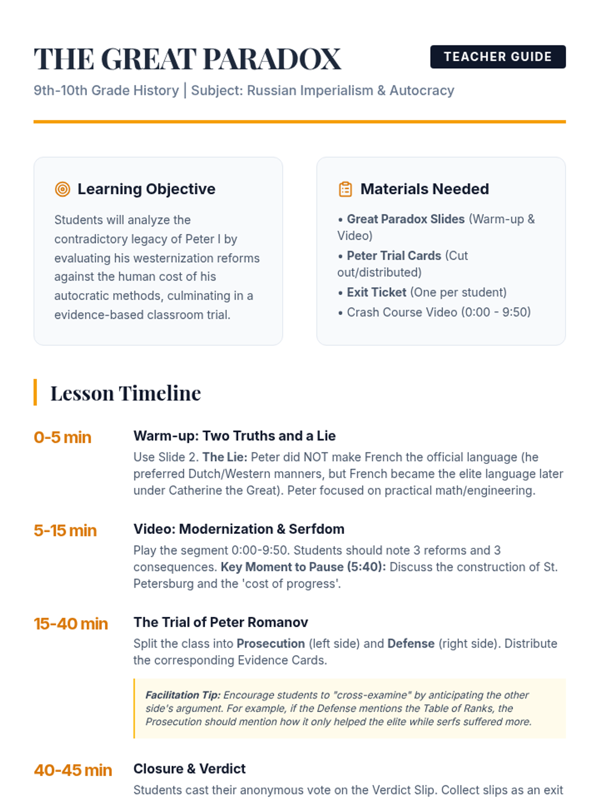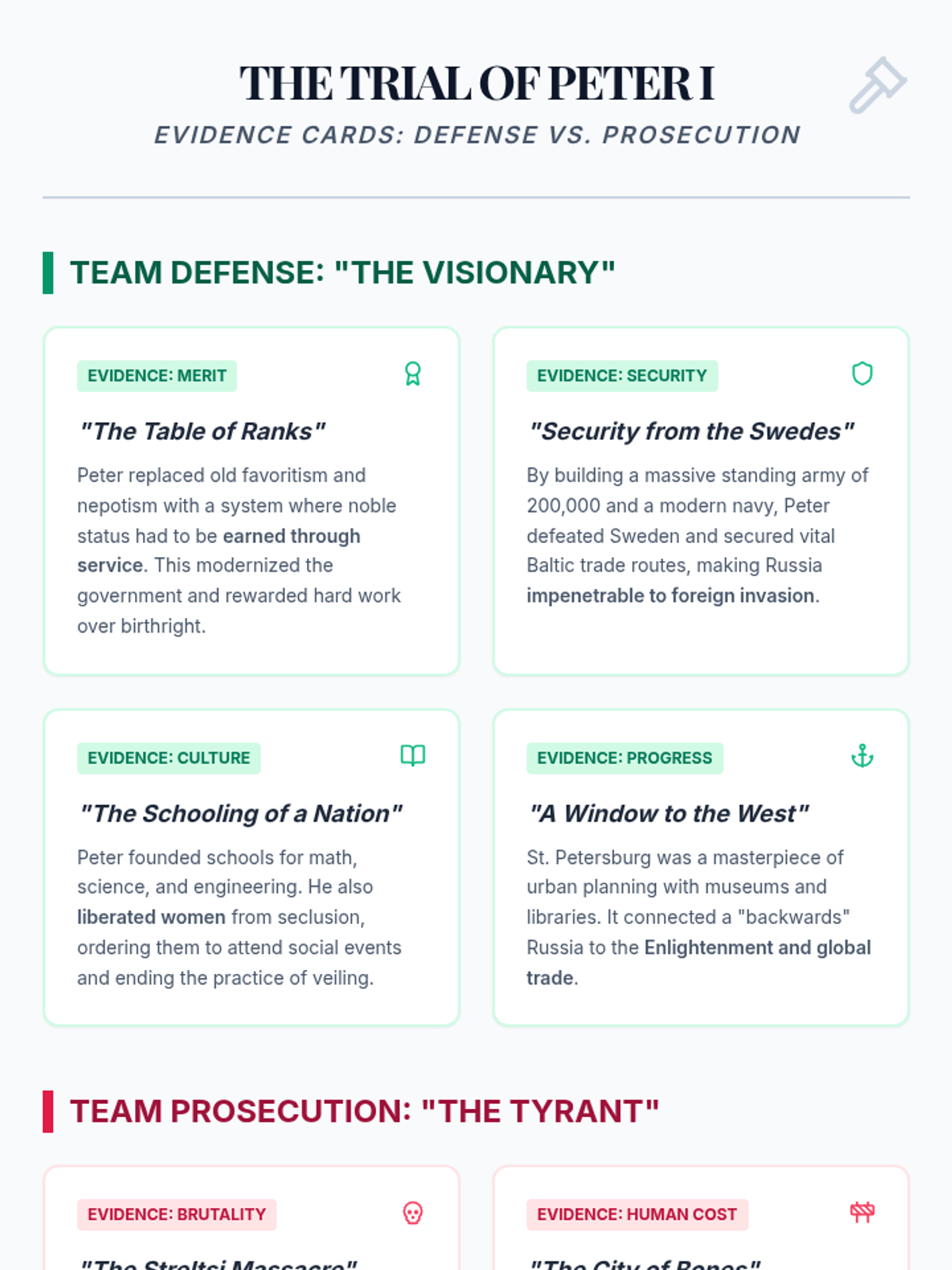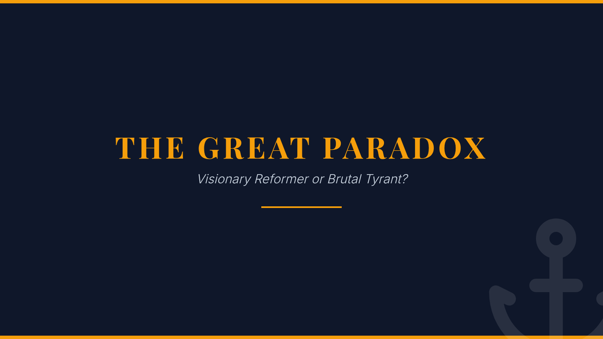 Students evaluate Peter the Great's legacy by analyzing his modernization efforts versus his autocratic brutality through a classroom trial simulation.
