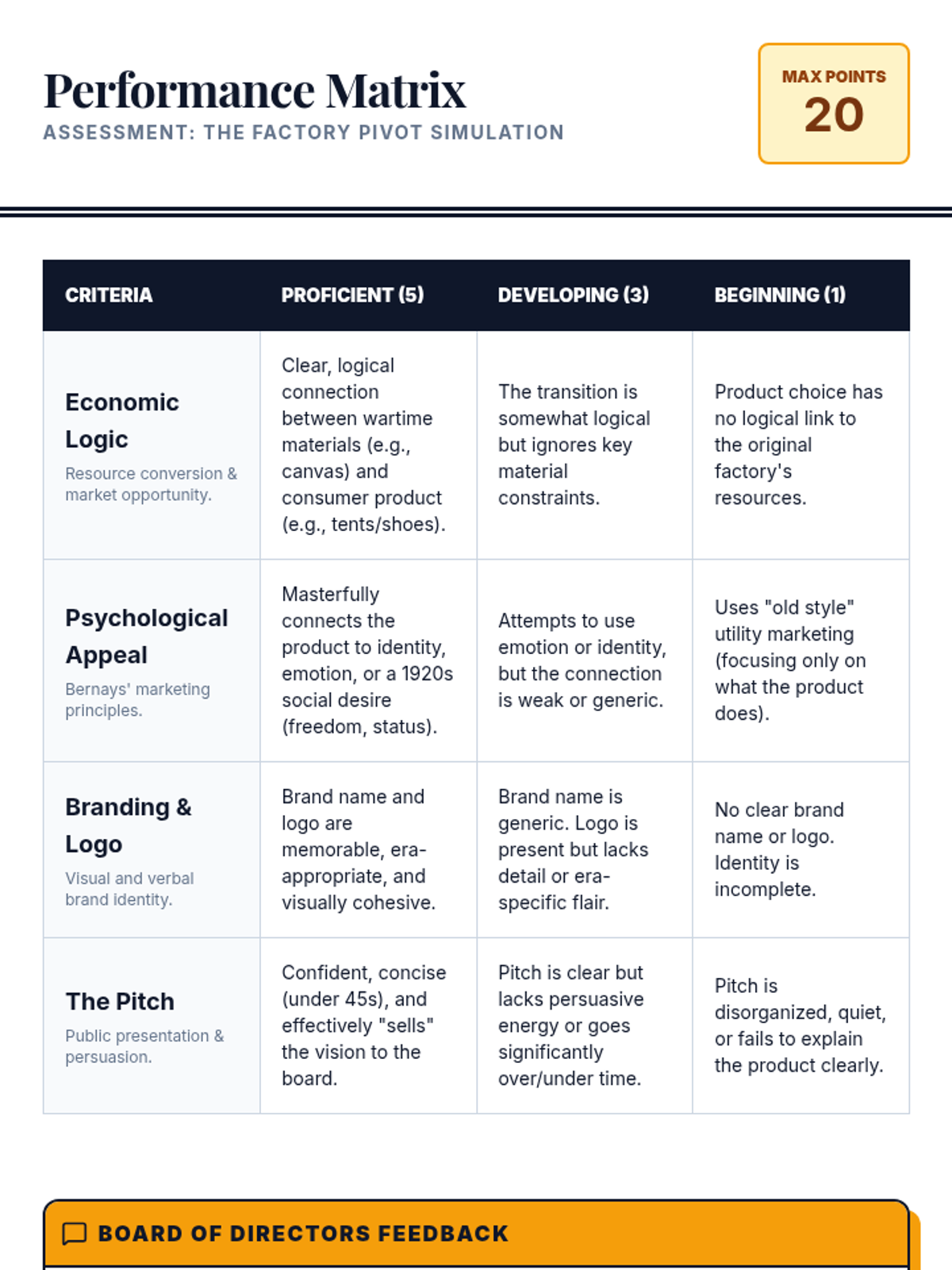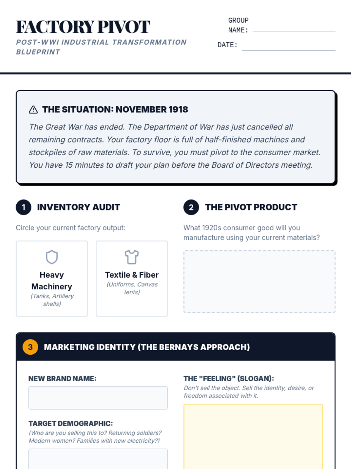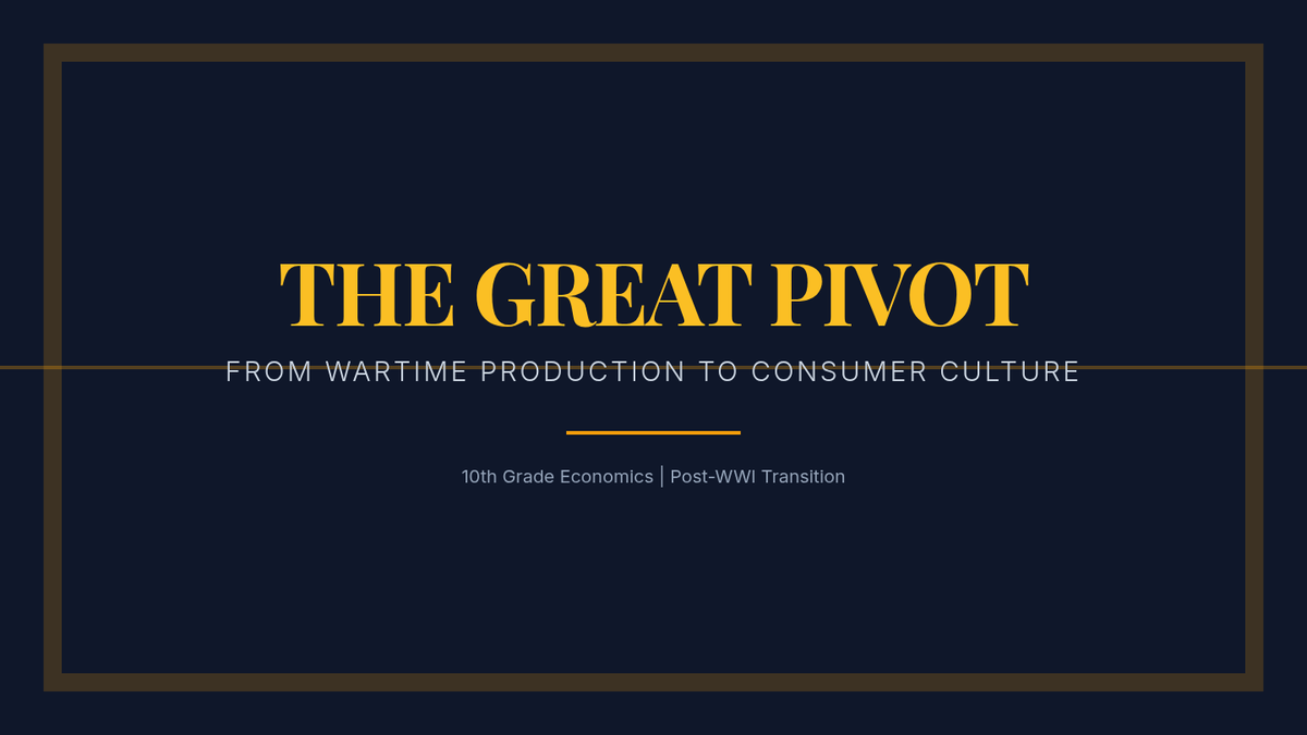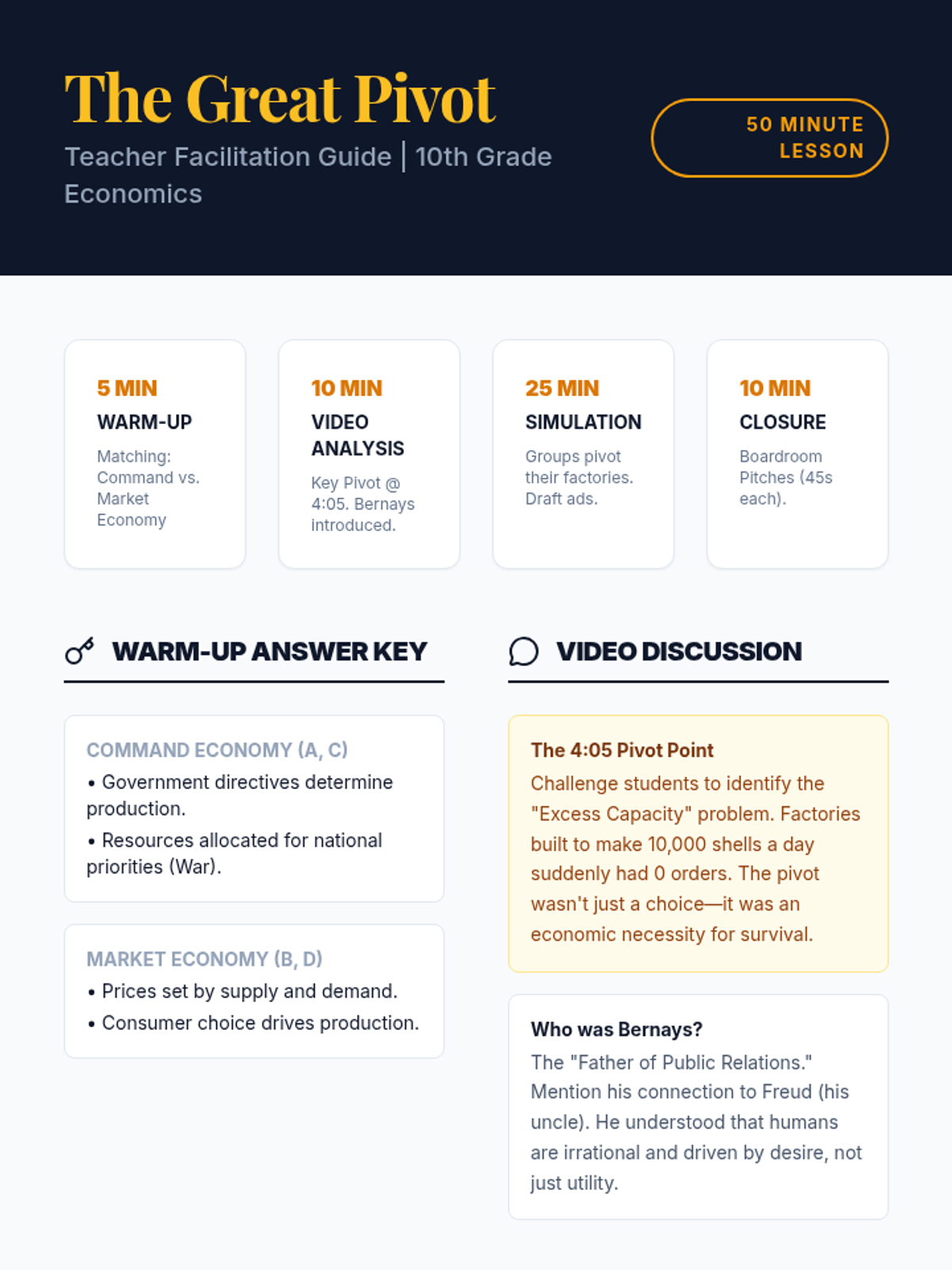 A 10th-grade economics lesson exploring the shift from WWI command-style production to 1920s consumerism, focusing on industrial pivots and the birth of modern marketing.
