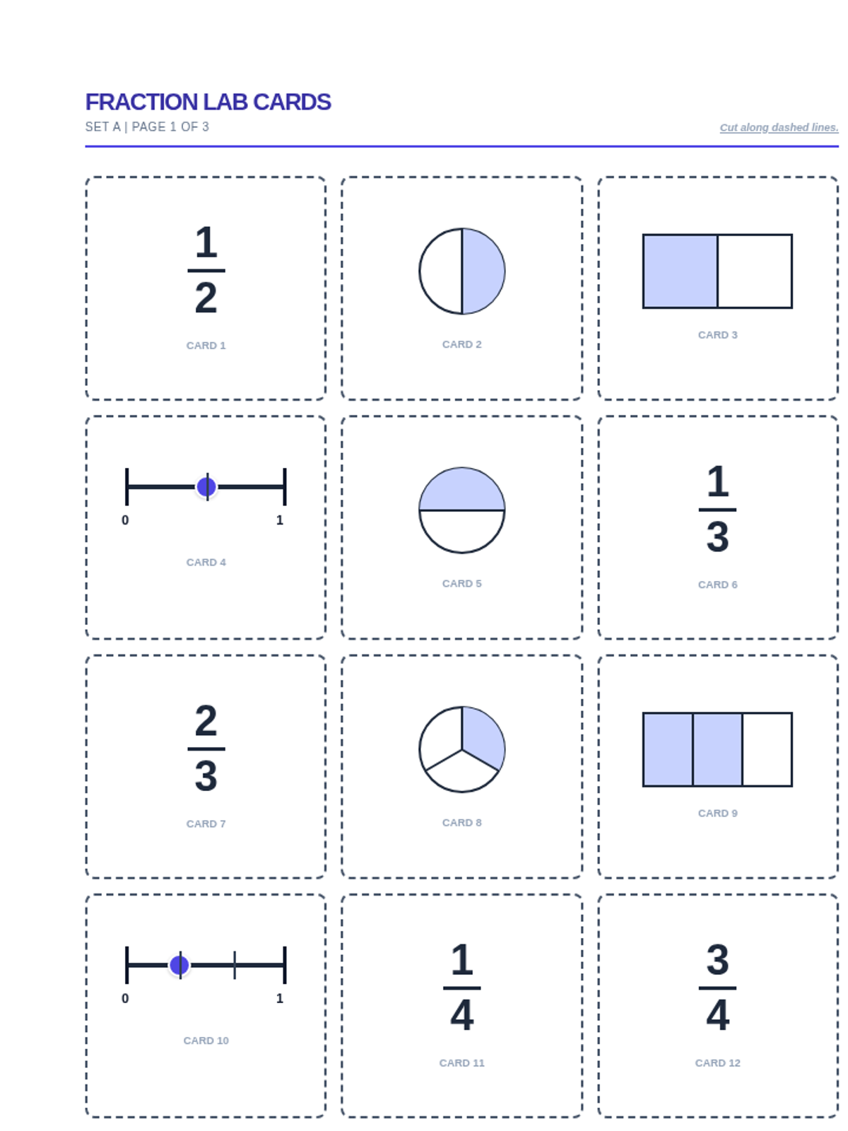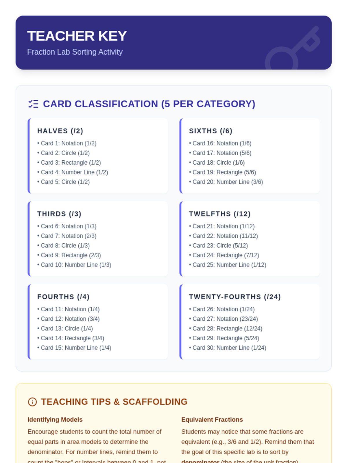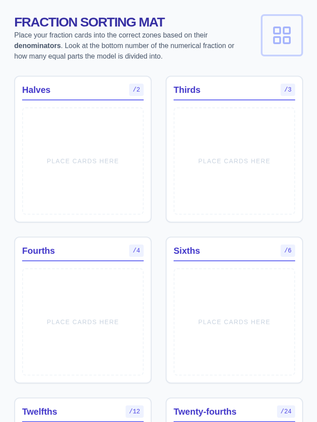 A hands-on exploration of fractions where students identify and sort fractions based on their denominators using various representations including number lines, area models, and numerical forms.