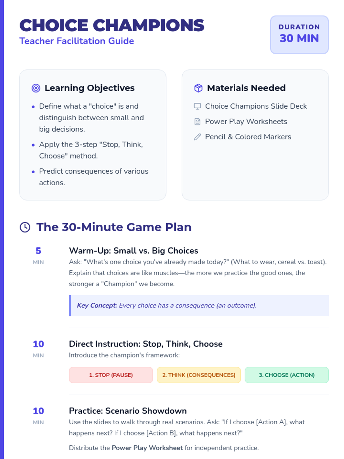 A 30-minute interactive lesson for 3rd graders on decision-making using the 'Stop, Think, Choose' method. Students explore the impact of their choices through real-world scenarios and personal reflection.