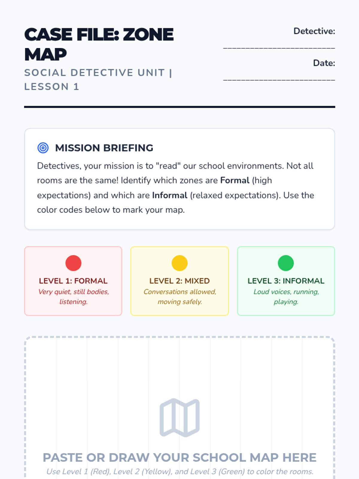 Students categorize school settings as formal or informal to understand that different rules apply in different places. They create a 'Zone Map' of the school to visualize these social expectations.