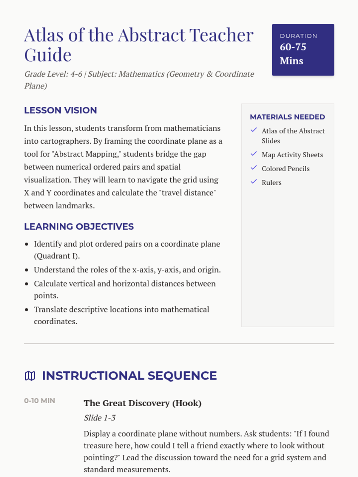 A specialized math lesson for plotting coordinates across all four quadrants and on the axes, designed with heavy scaffolding and visual cues for IEP support. Students will use an island map theme to practice identifying and plotting points.