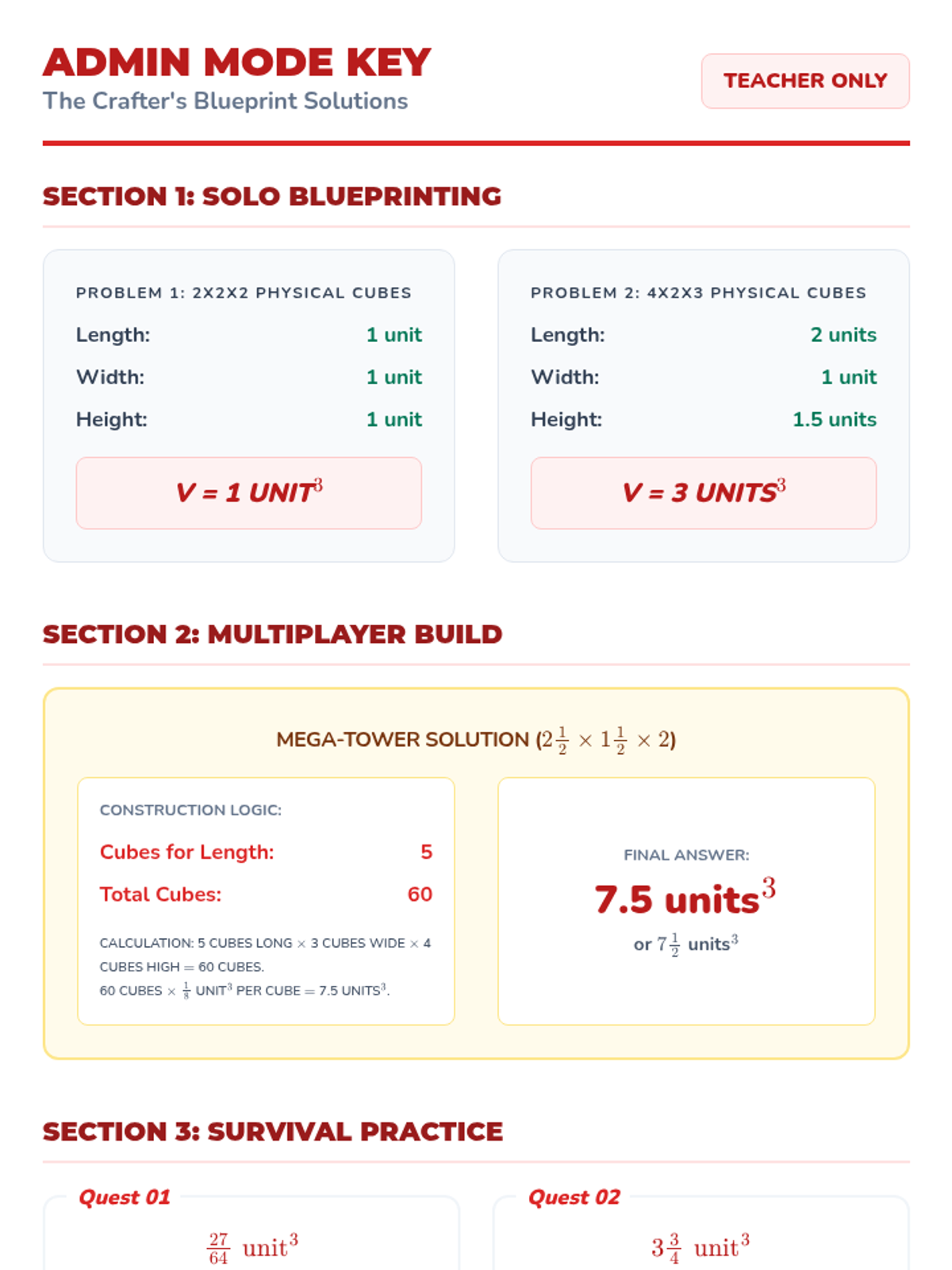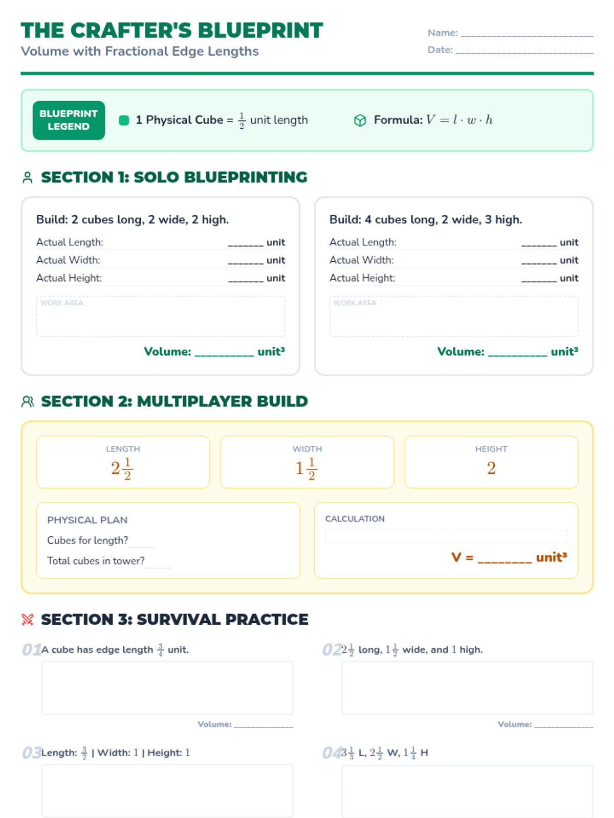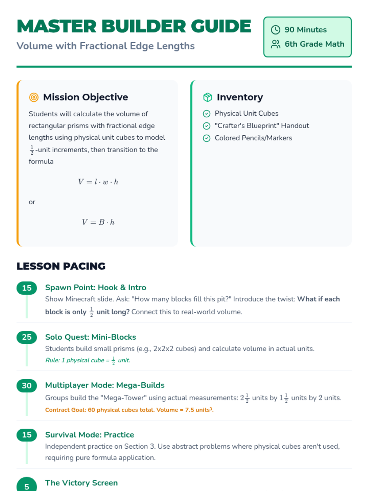 A Minecraft-themed lesson on finding volume with fractional edge lengths. Students use physical unit cubes to model structures and apply formulas to solve building challenges.