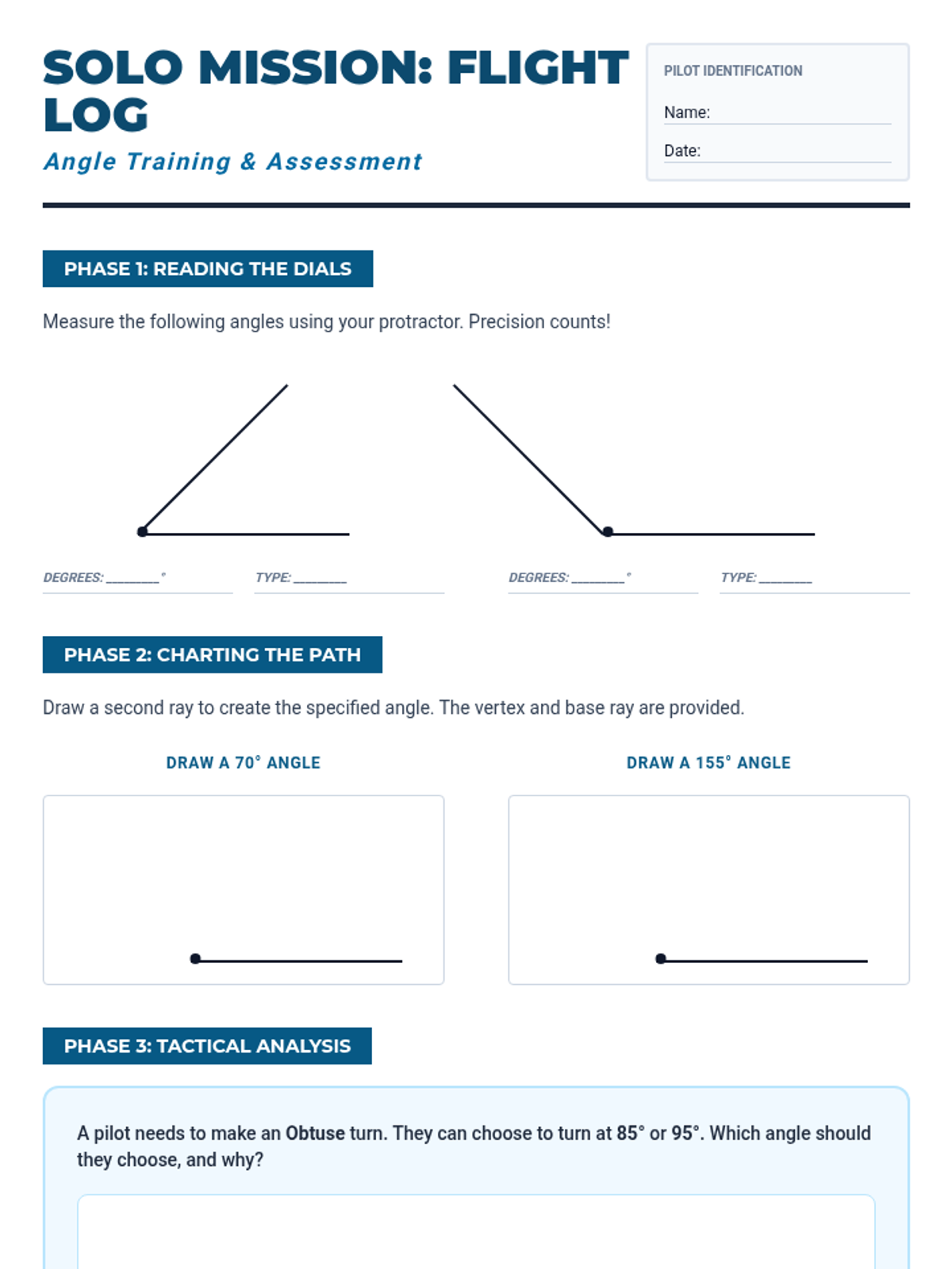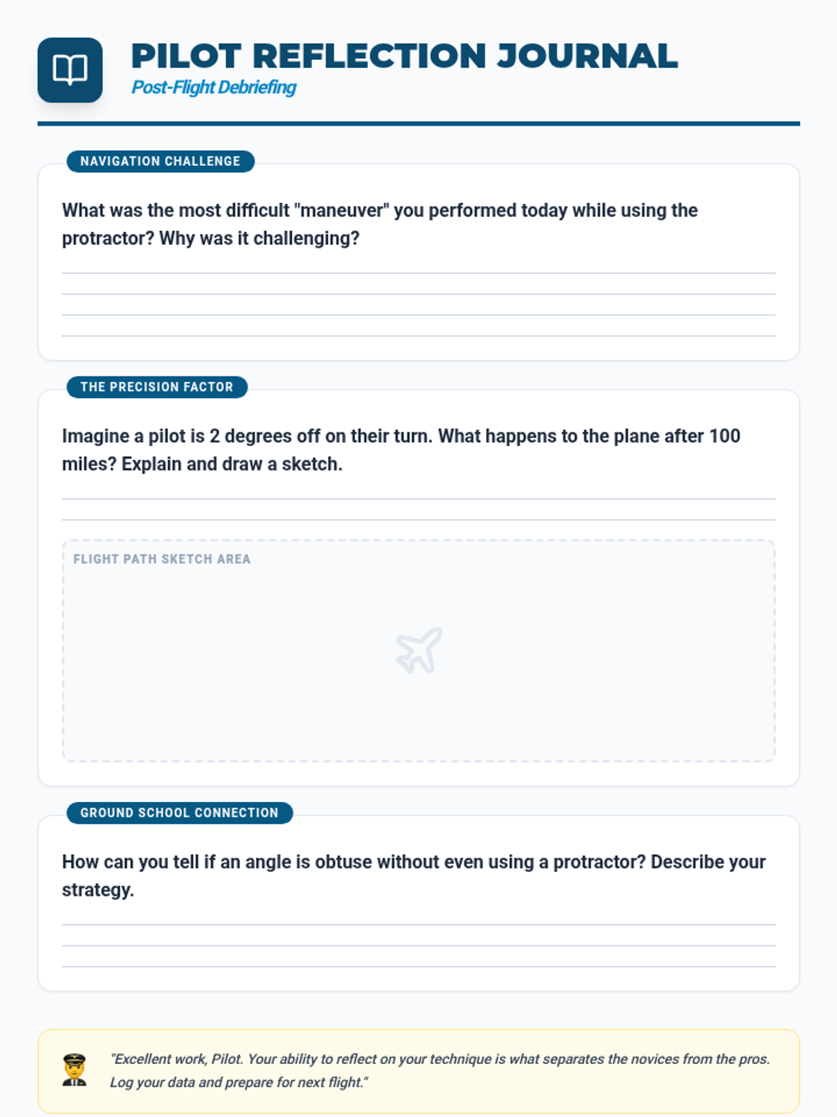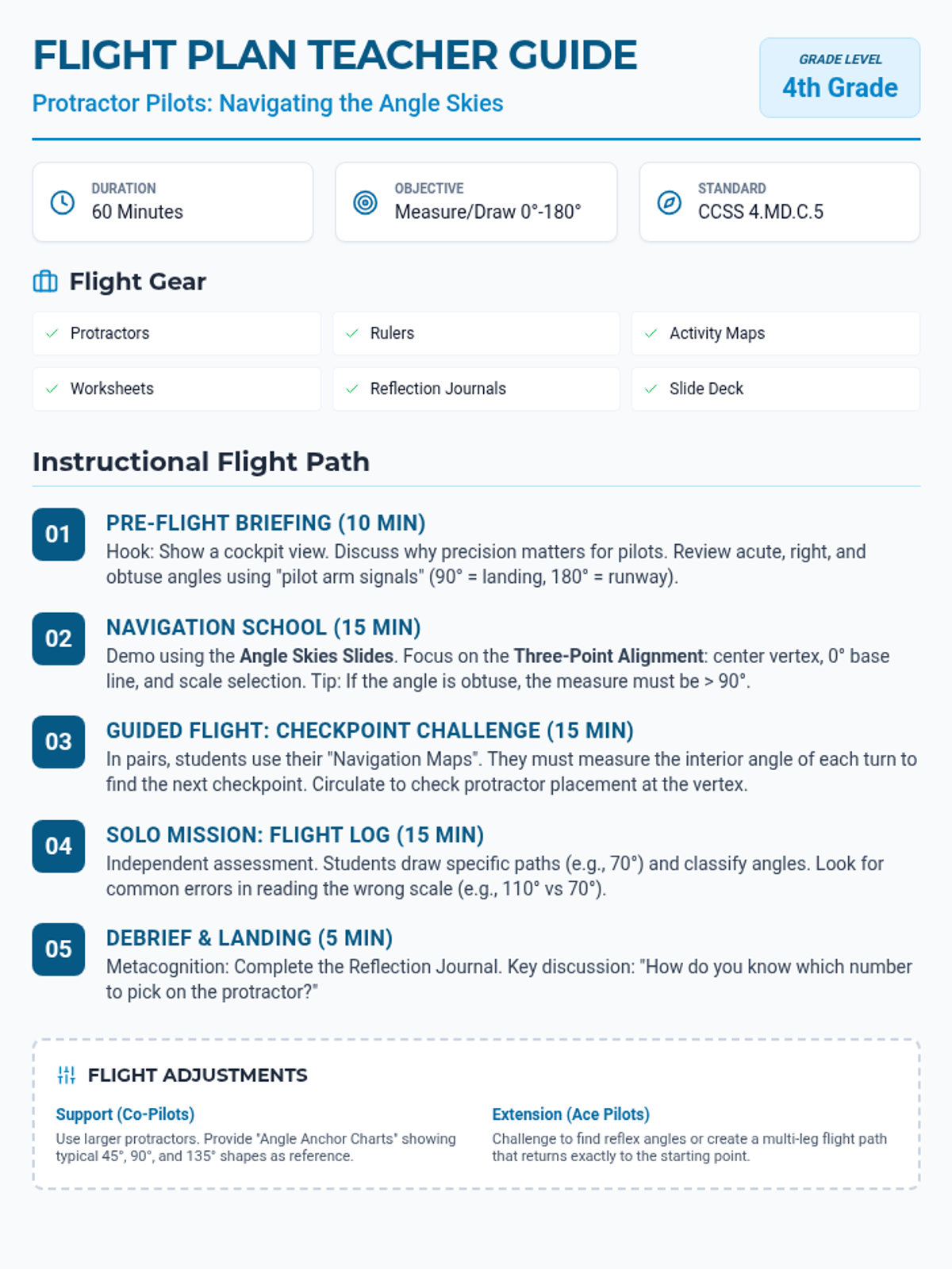 Students take to the skies as 'Protractor Pilots' to master measuring and drawing angles. This aviation-themed lesson focuses on precision, classifying angles, and spatial reasoning through a flight navigation simulation.