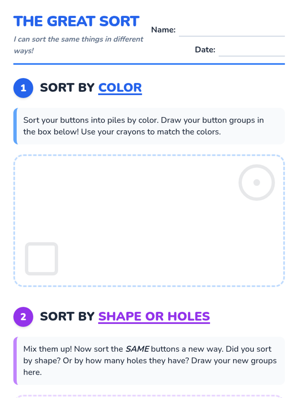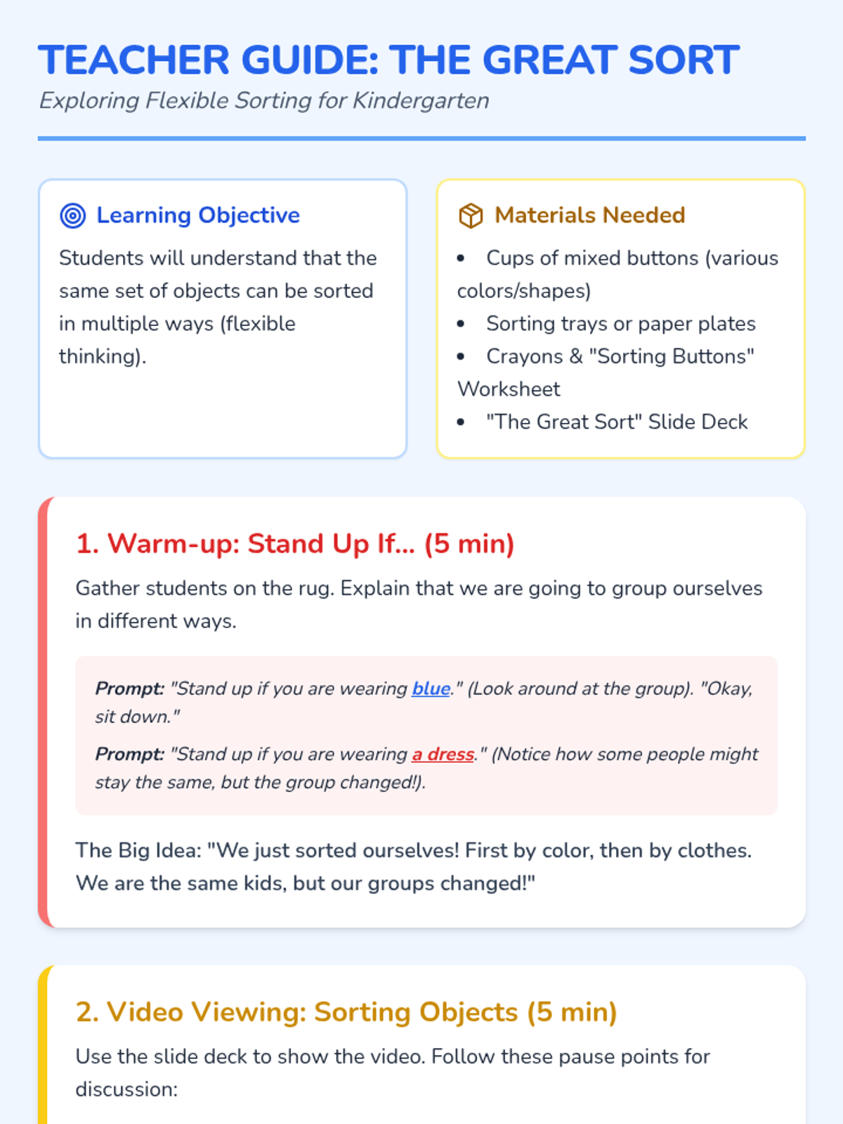 A Kindergarten lesson focused on flexible sorting, teaching students that the same set of objects can be organized in multiple ways (e.g., by color and then by type).