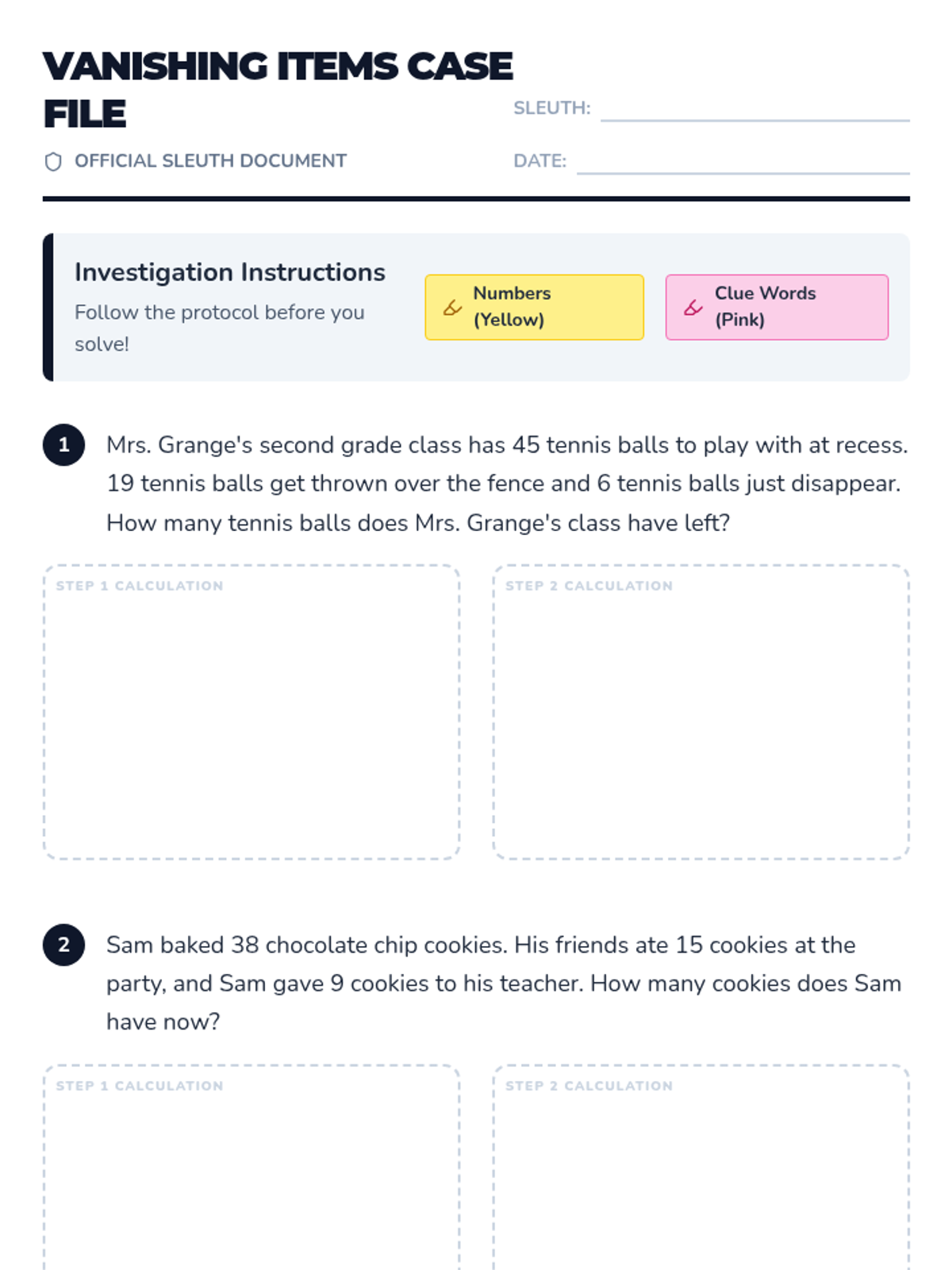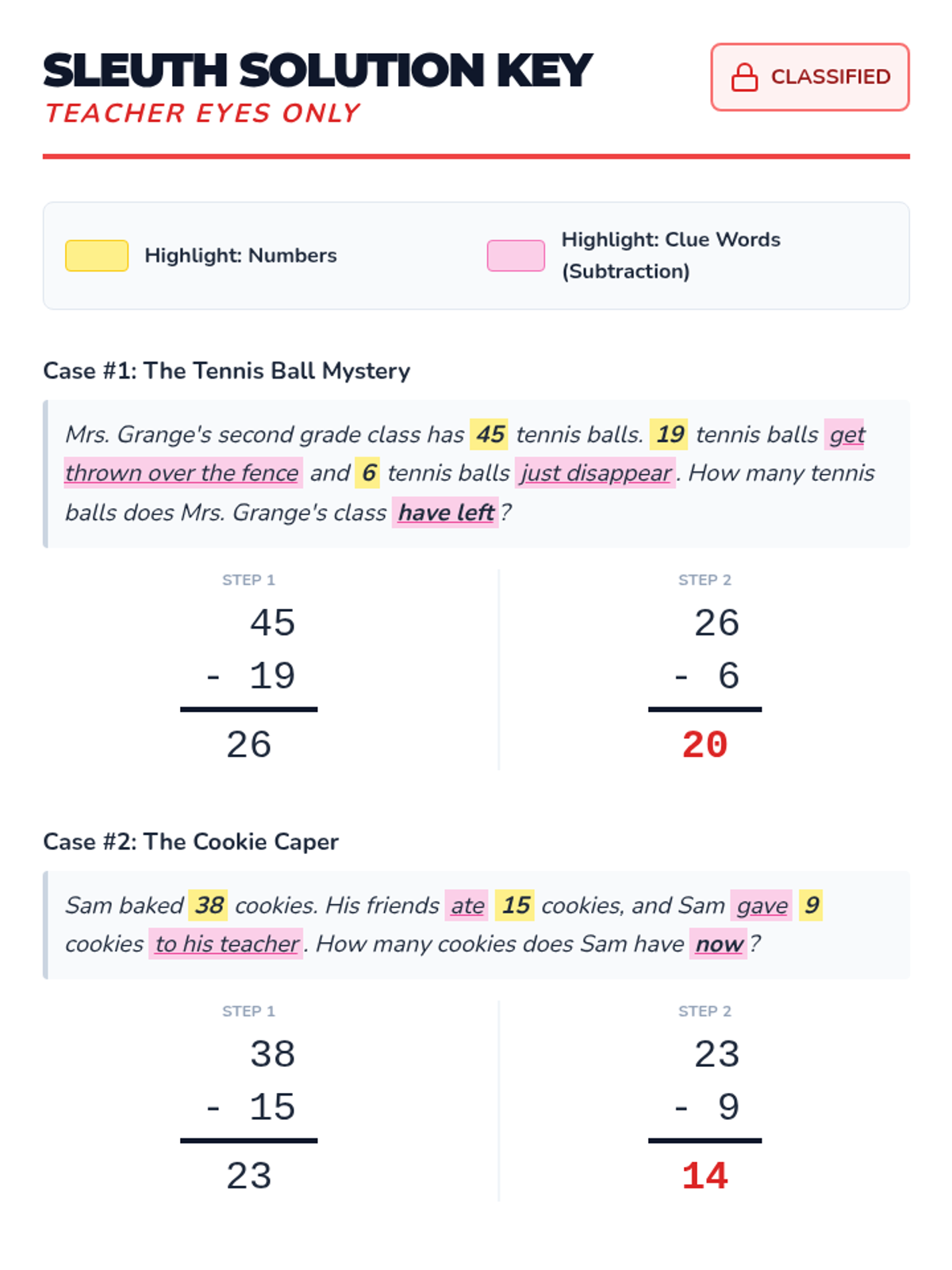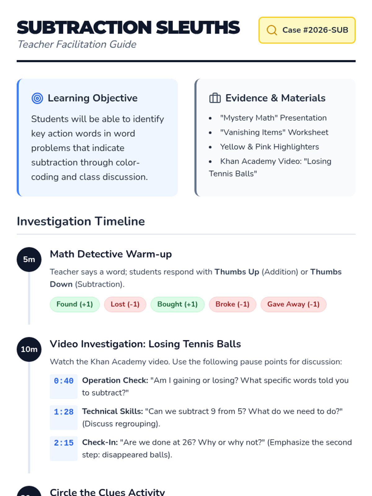 A comprehensive lesson for 2nd graders focused on identifying subtraction 'clue words' in word problems, featuring a multi-step subtraction video and a color-coded activity.