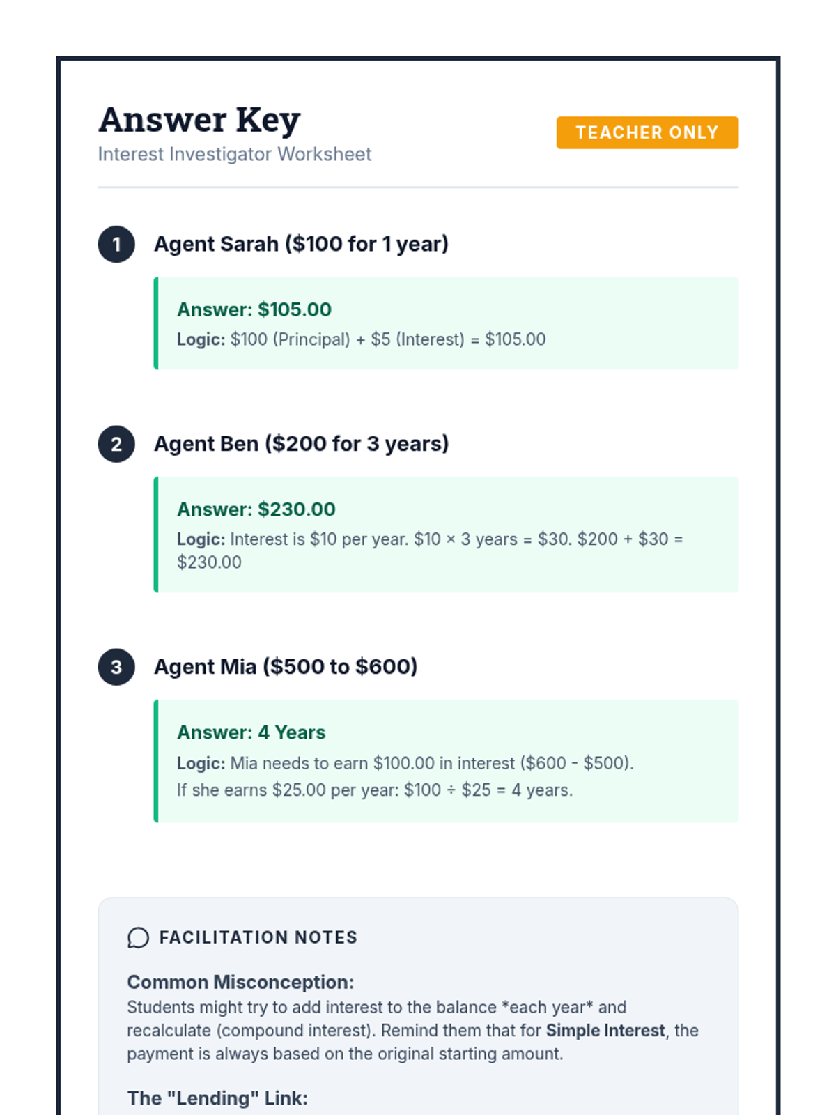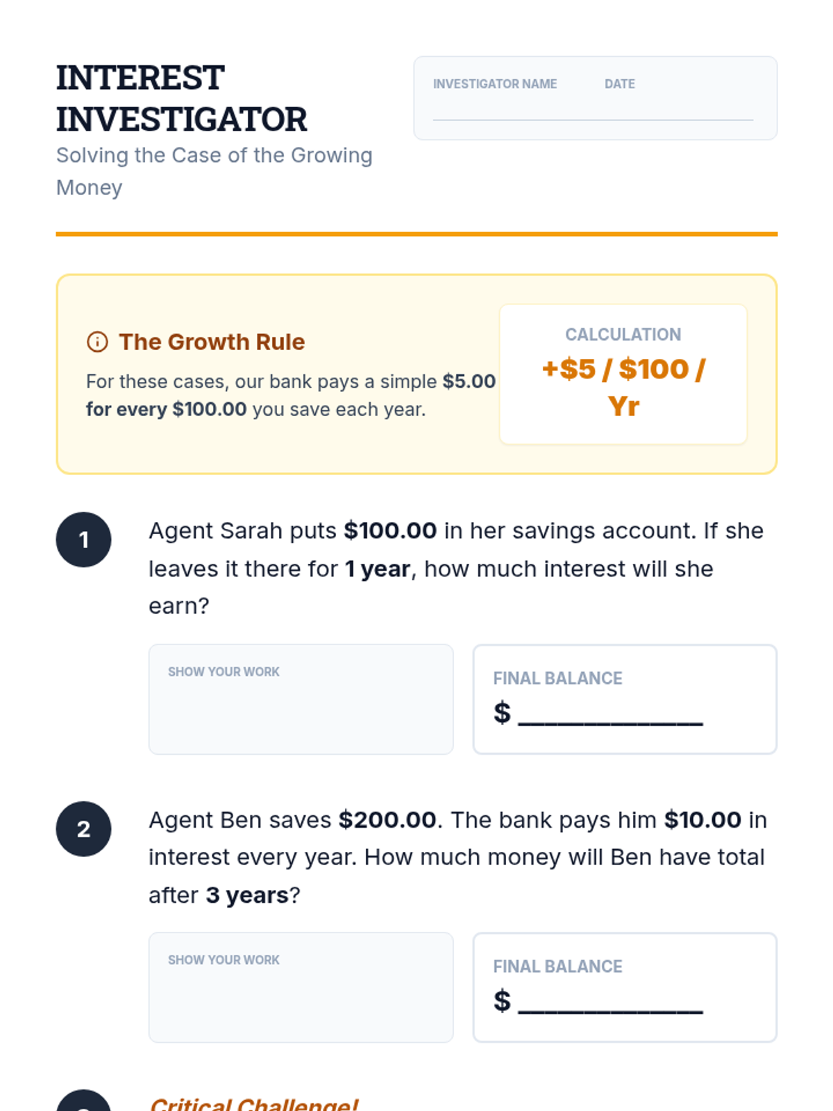 This lesson introduces the concept that banks pay people to keep money in accounts. Students use multiplication and addition to calculate simple interest scenarios, visualizing how money grows over time without additional work.