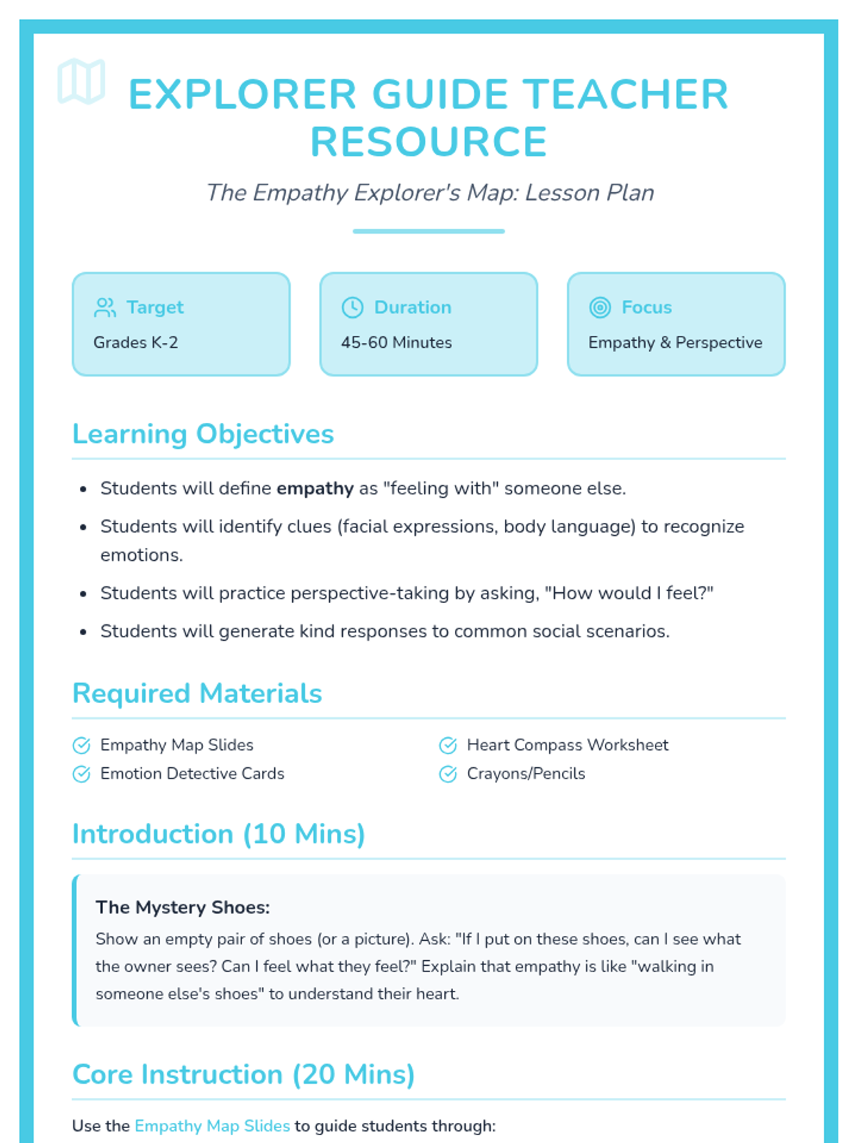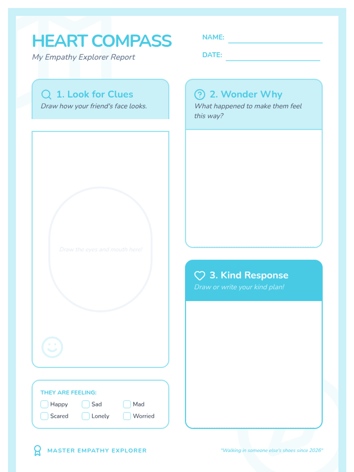 Students embark on a journey to understand empathy by identifying emotions, practicing perspective-taking, and learning kind responses through a 'map' metaphor.