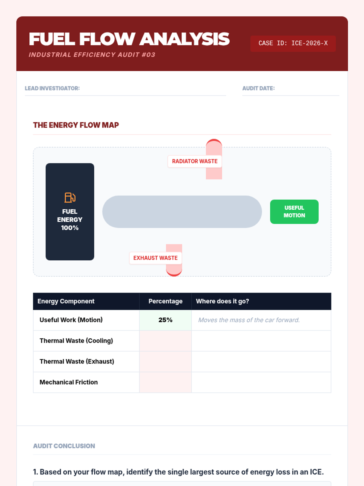 A deep dive into the internal combustion engine to track energy flow and identify thermal energy as the primary source of energy loss in modern transportation.