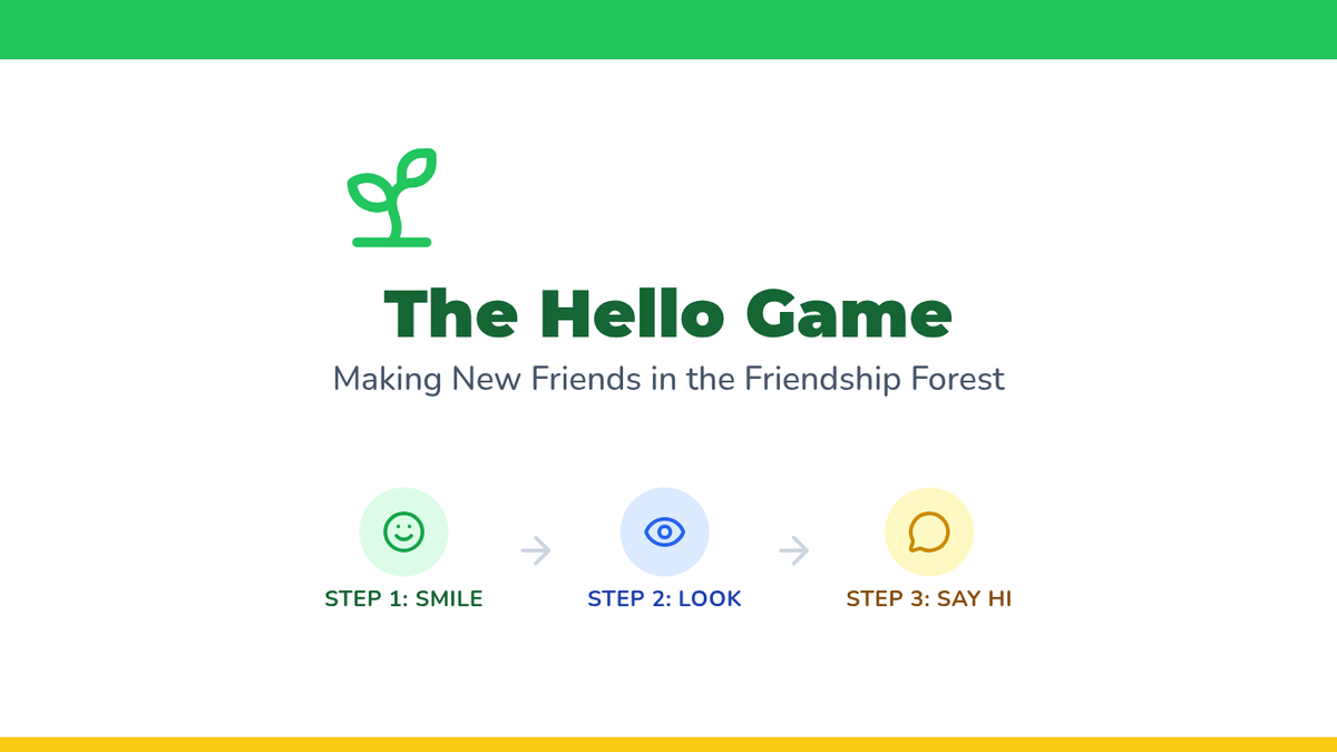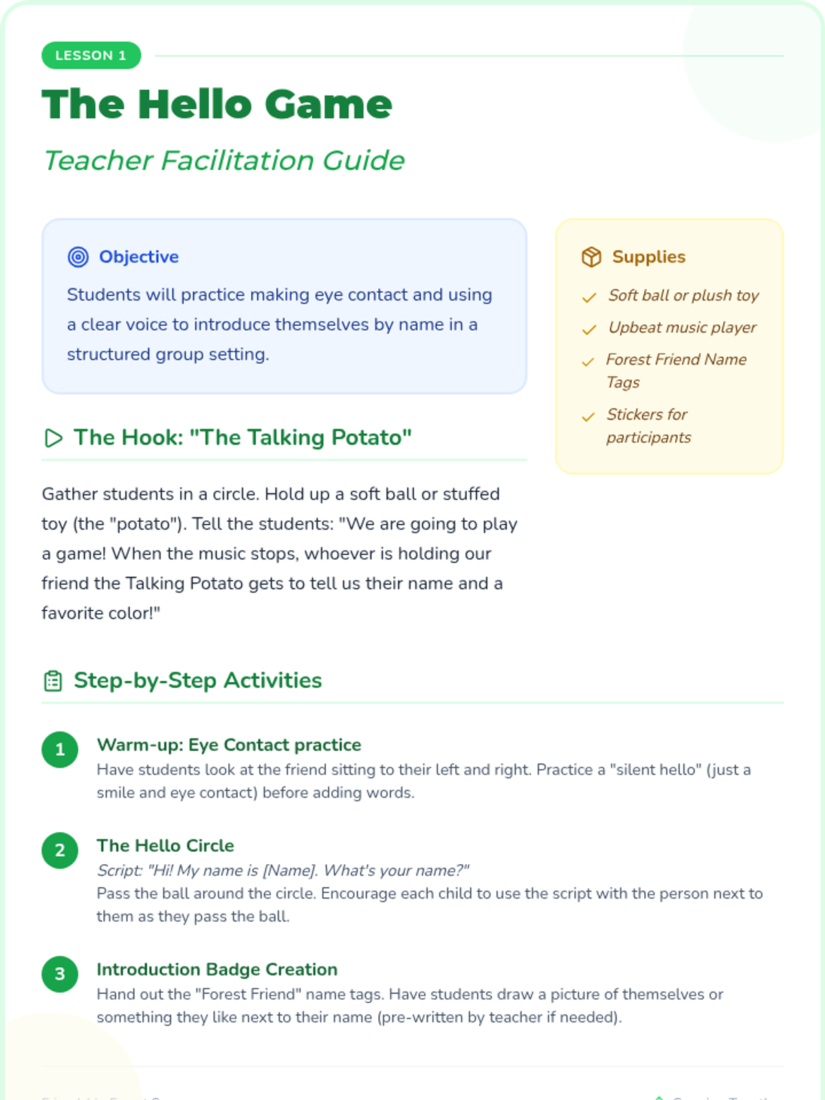 Students sit in a circle and pass a ball; whoever gets the ball practices saying 'Hello, my name is...' and making eye contact. This normalizes introductions and overcoming shyness.