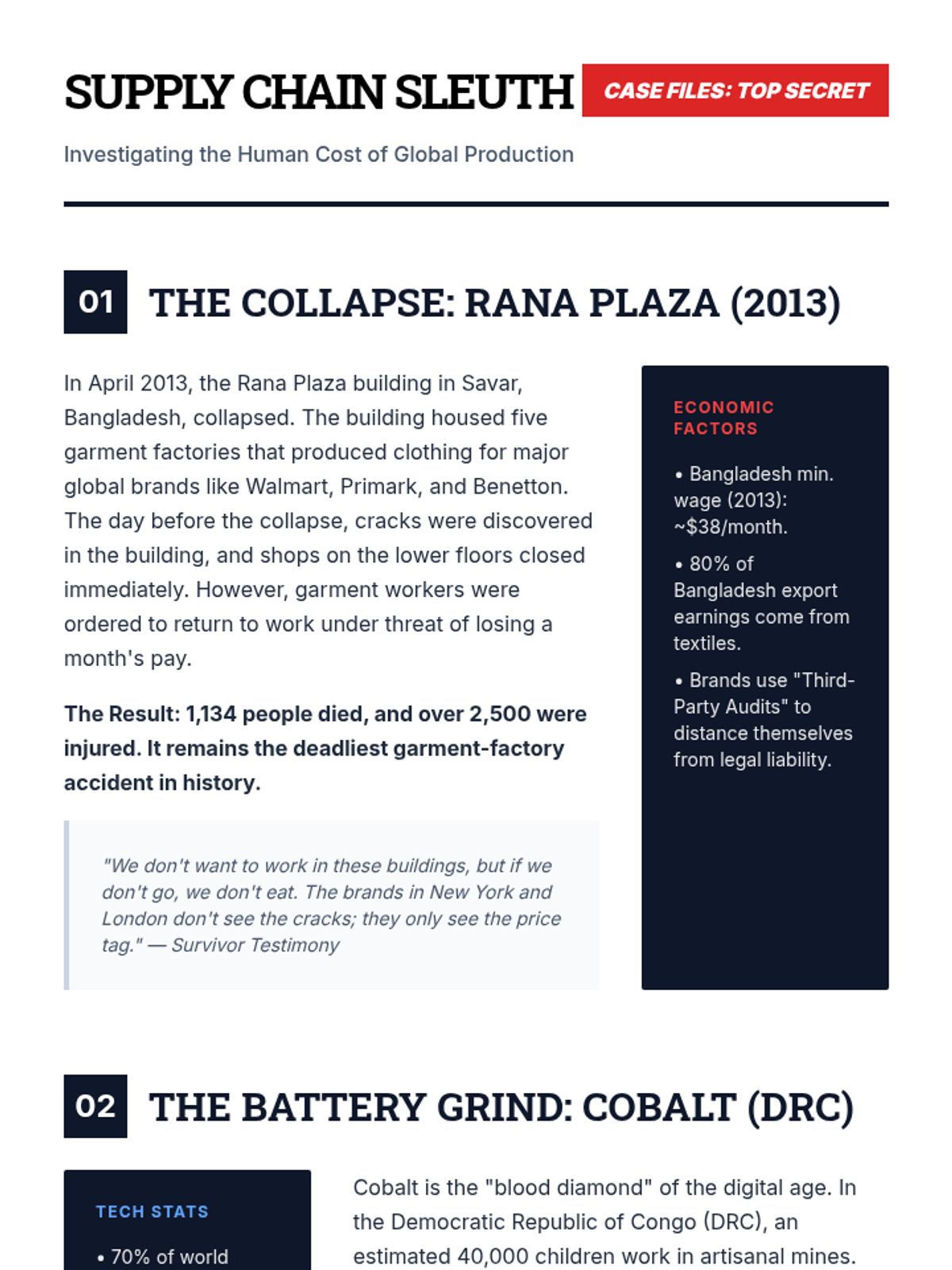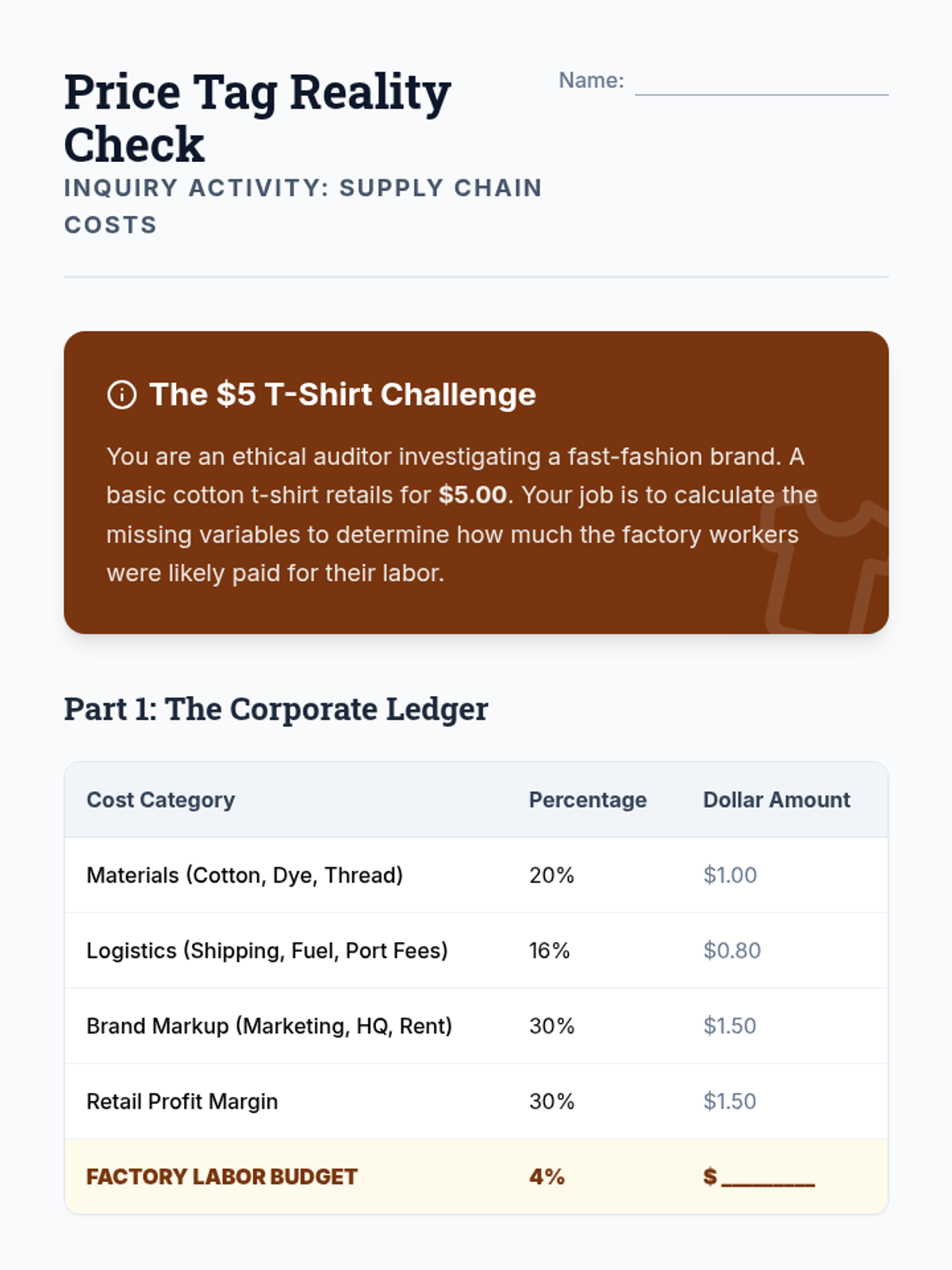 This lesson exposes the 'race to the bottom' in global manufacturing by tracing the supply chain of common products and calculating the human cost of cheap labor.