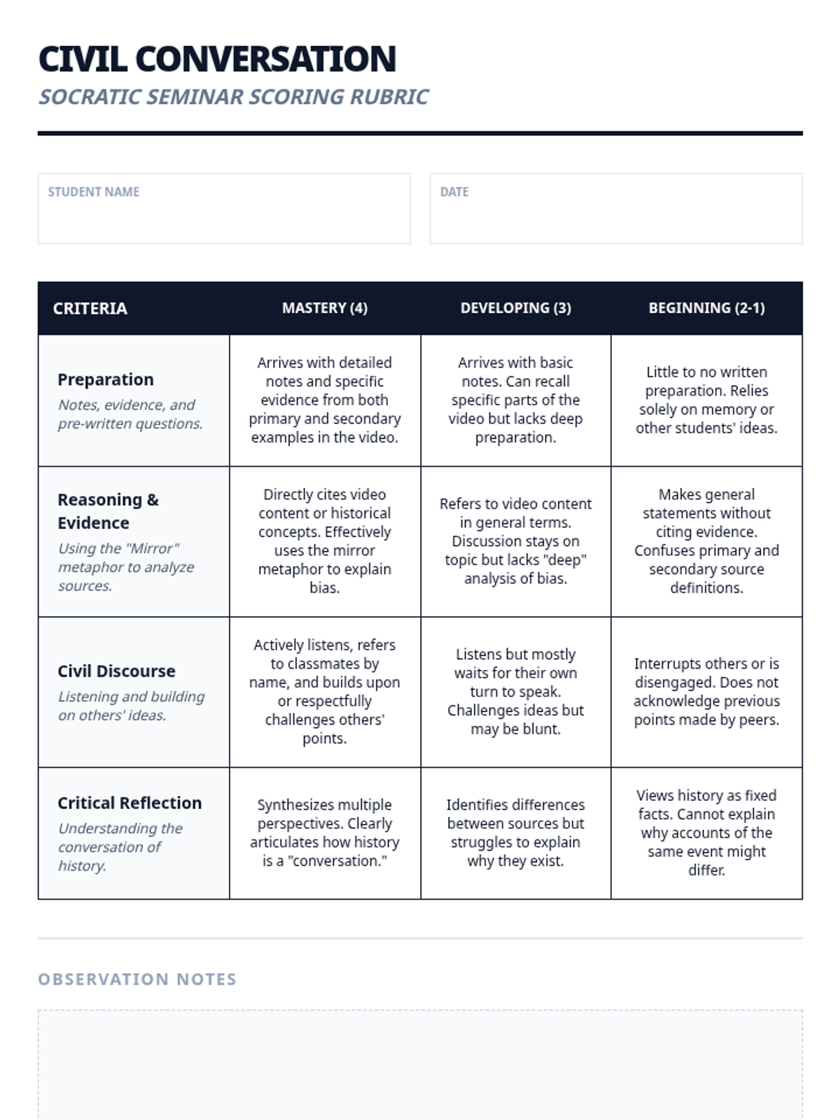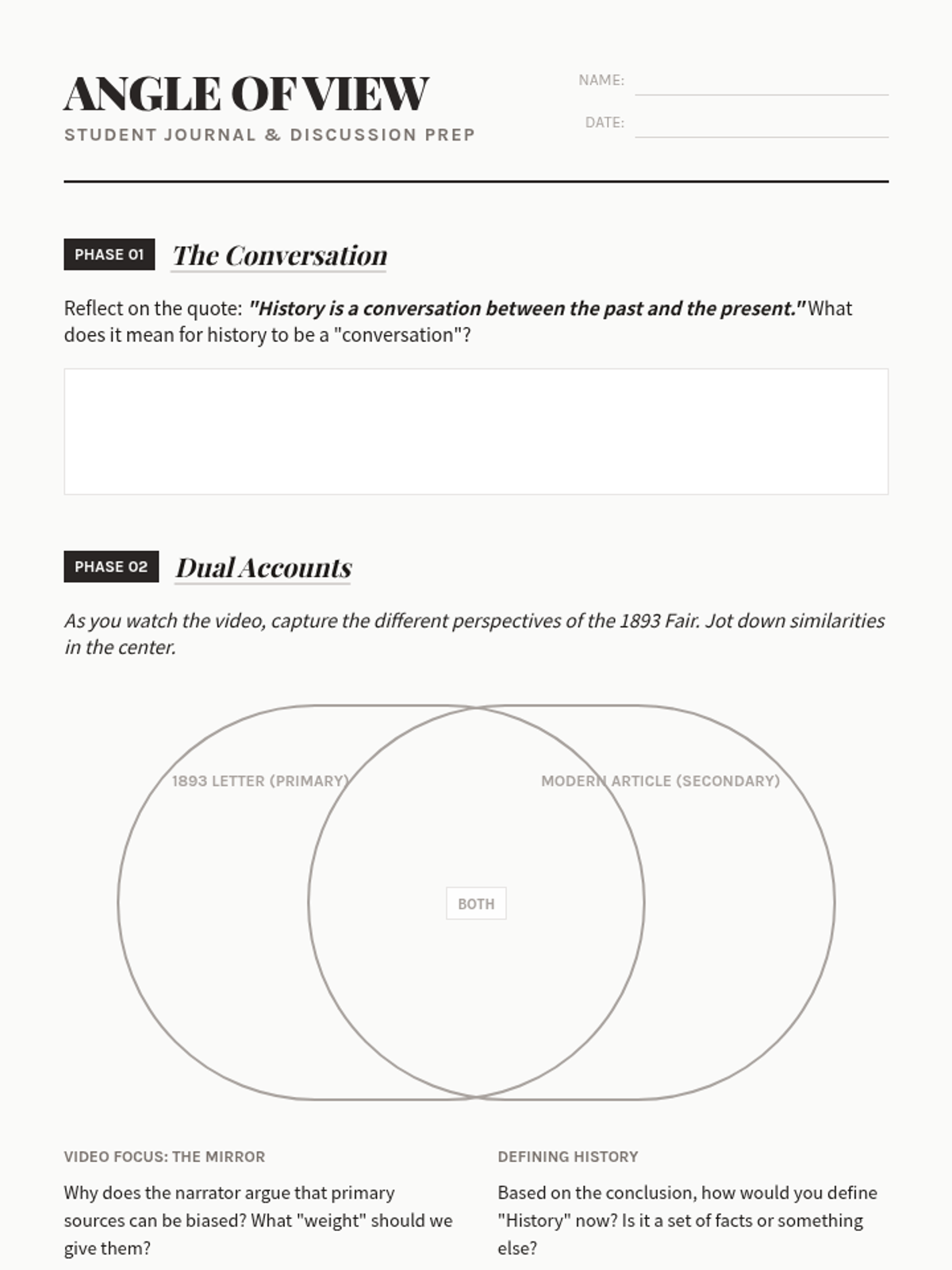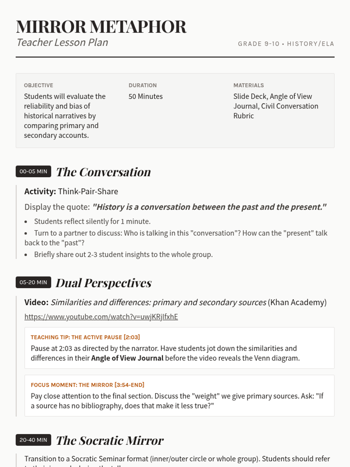 A lesson for high school students exploring the fluid nature of history through the lens of primary and secondary sources, centered on the 'mirror' metaphor of historical perspective.