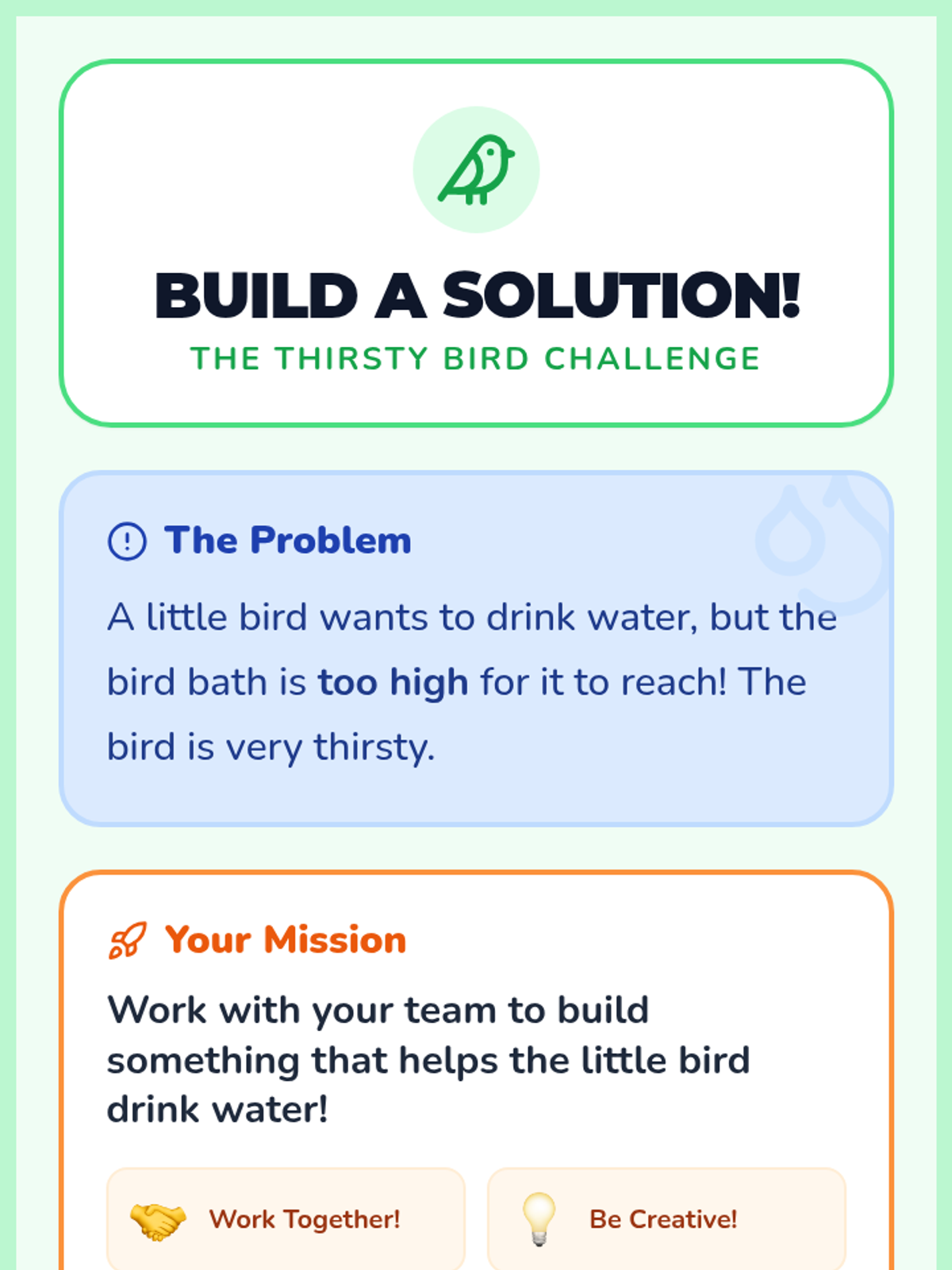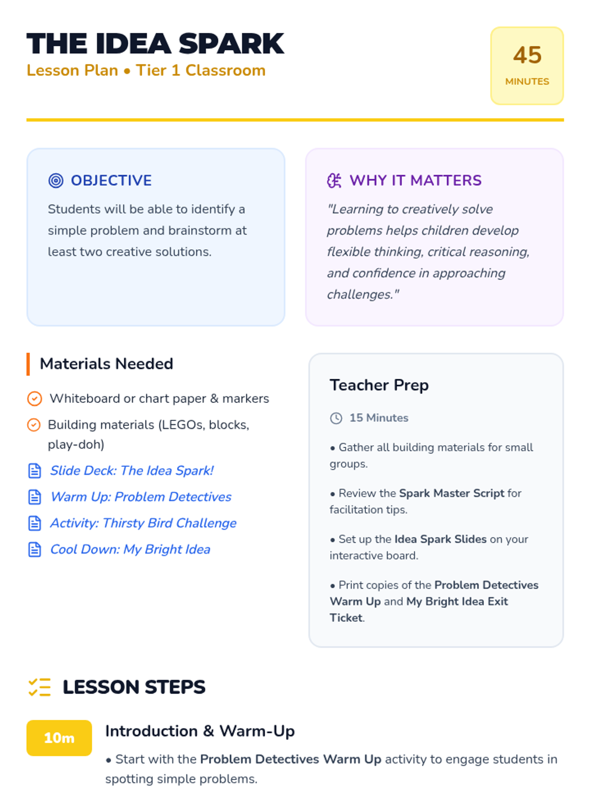 An interactive Kindergarten lesson that introduces creative problem-solving by helping students identify problems and brainstorm multiple solutions through stories and building activities.