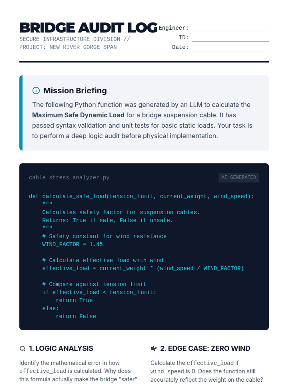 Students analyze code snippets that look correct and run without errors but produce incorrect results, learning that syntax proficiency does not equal logical accuracy in LLMs.