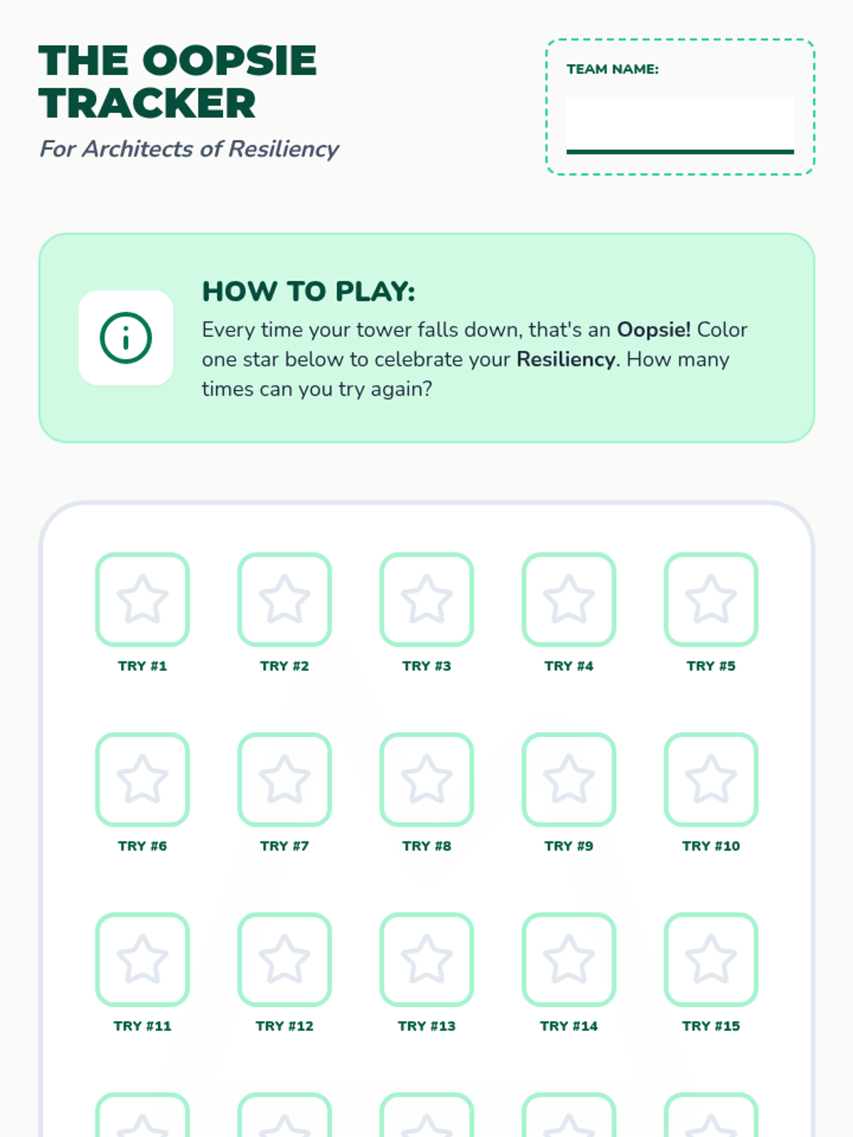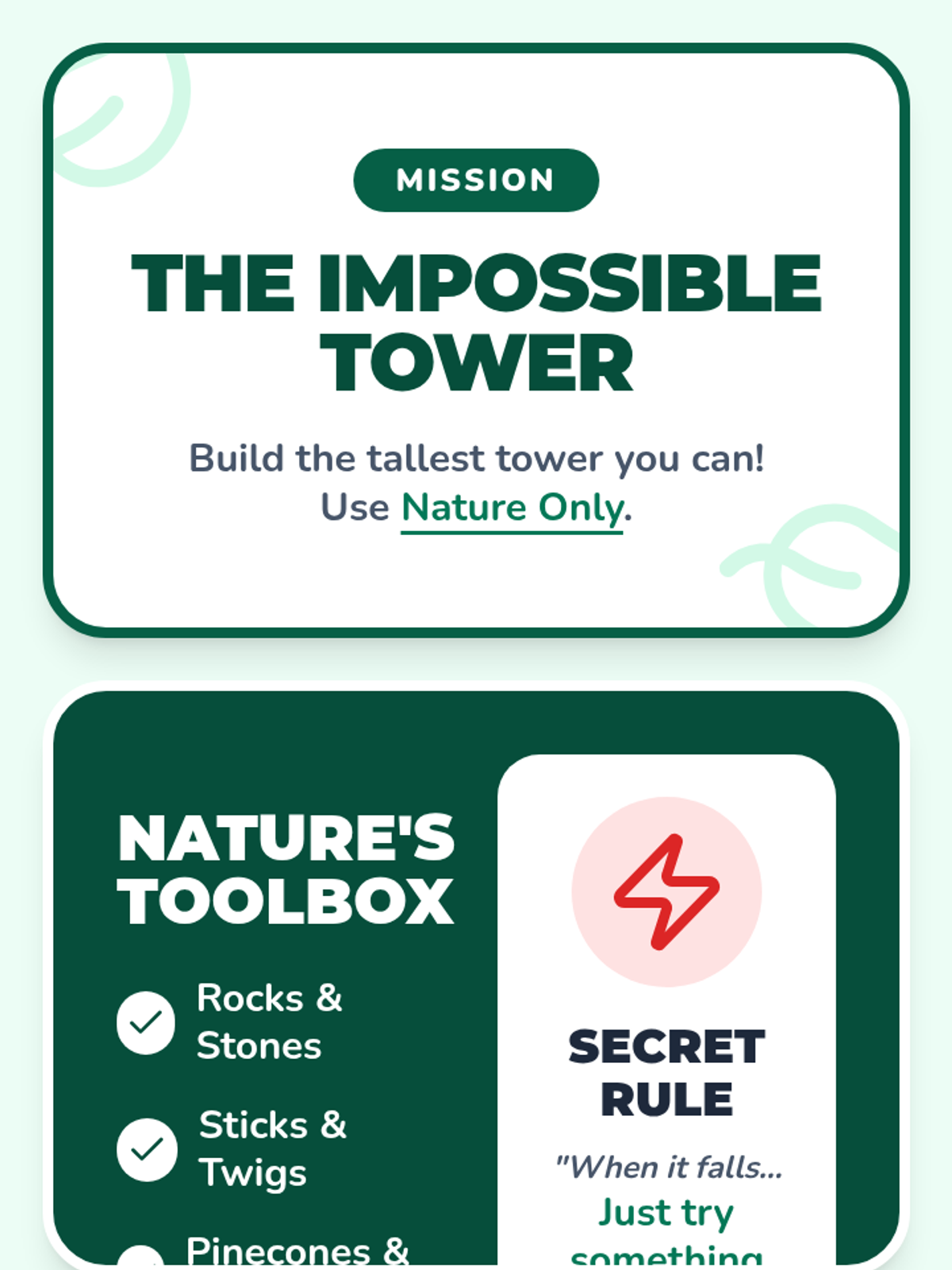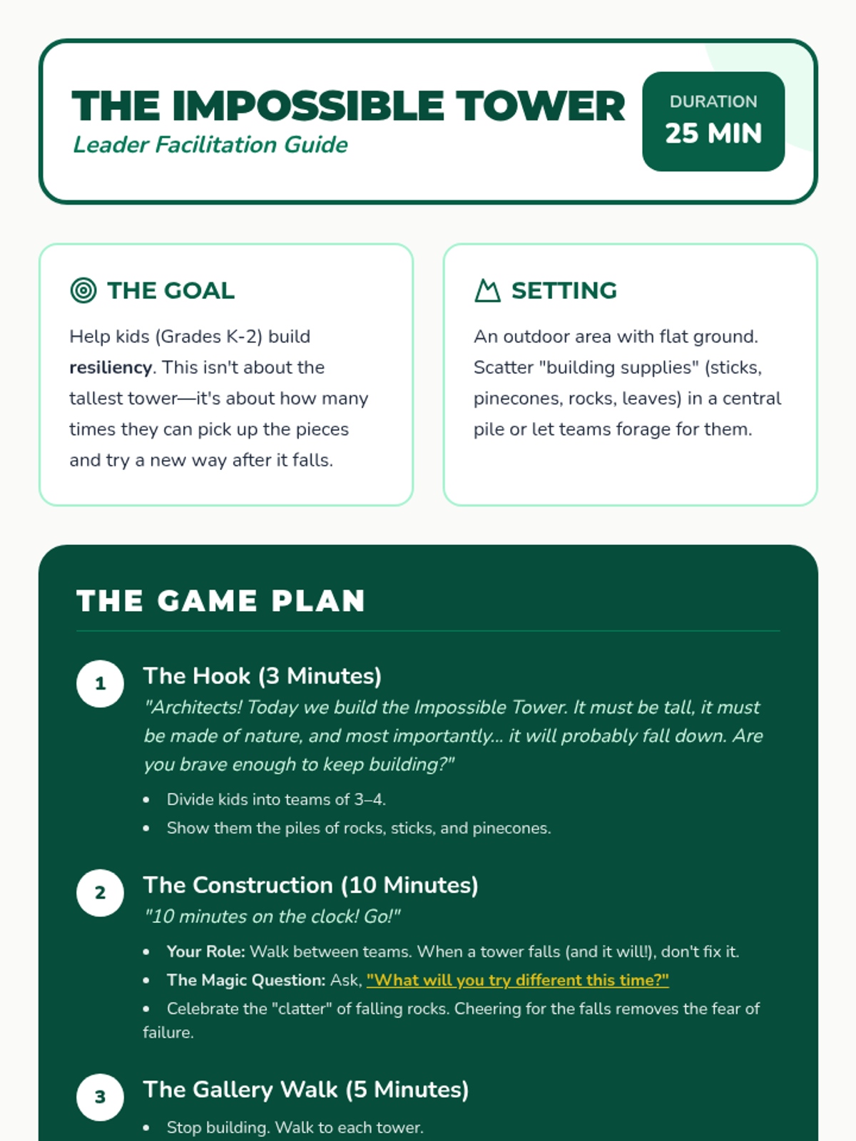 A 25-minute outdoor team-building challenge focused on resiliency. Children in grades K-2 use natural materials to build towers that are designed to fall, teaching them to celebrate effort and persistence over perfection.