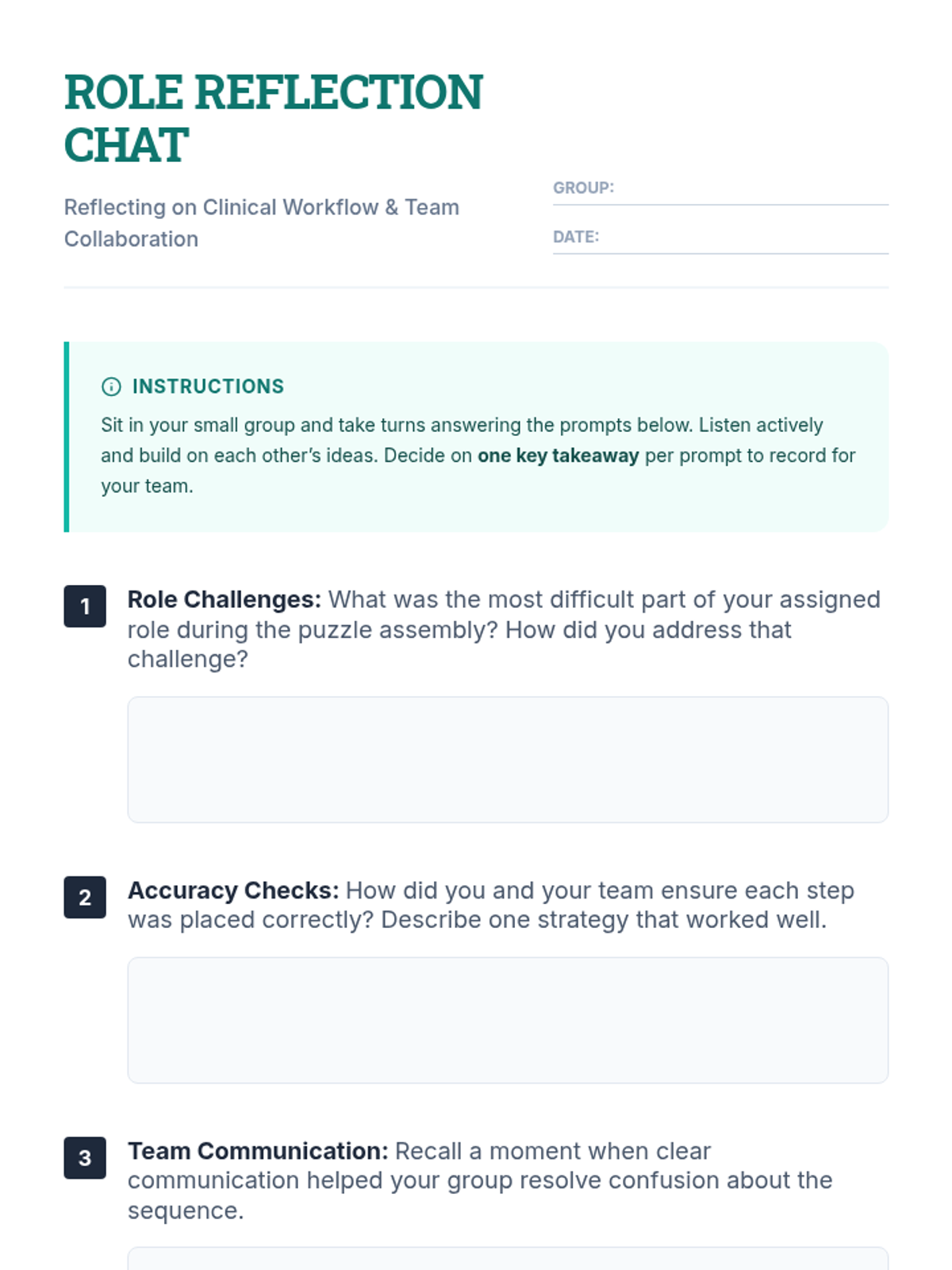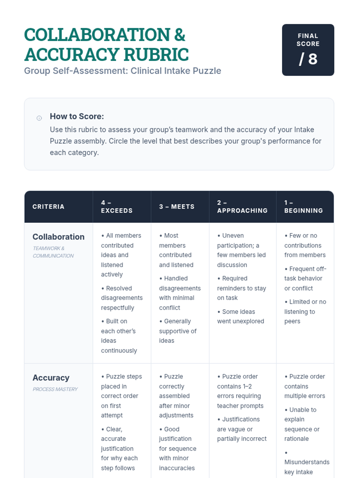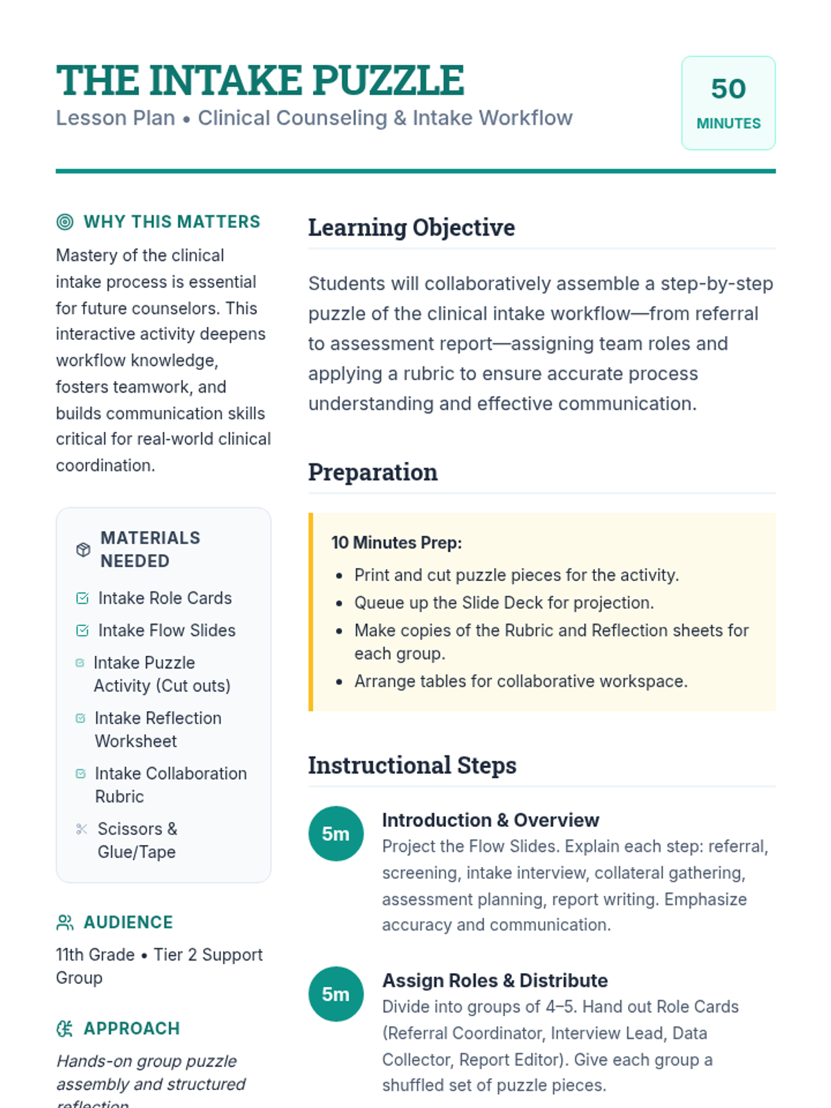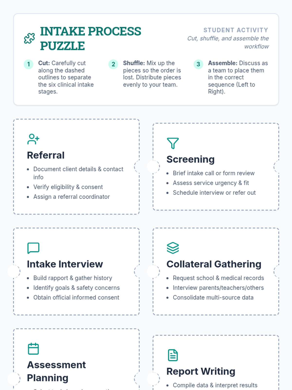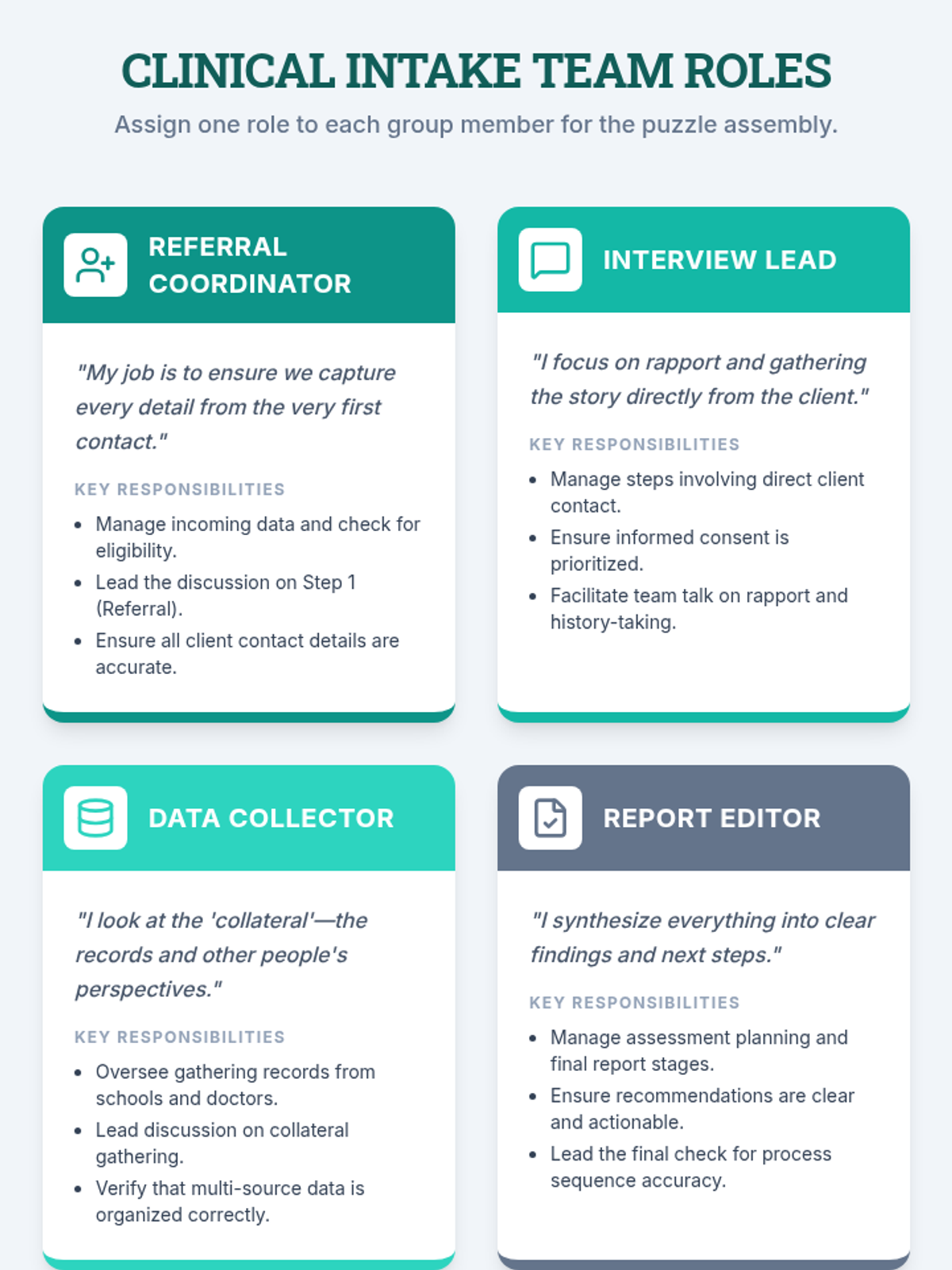 A collaborative Tier 2 lesson for 11th graders where they piece together the clinical intake process from referral to report, reinforcing workflow mastery and team communication.