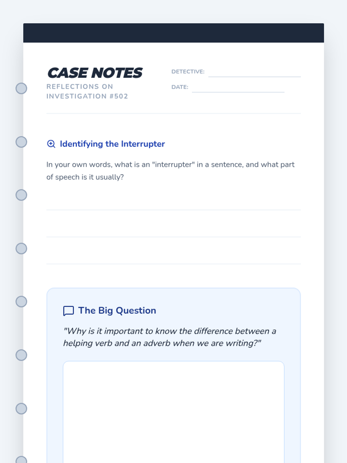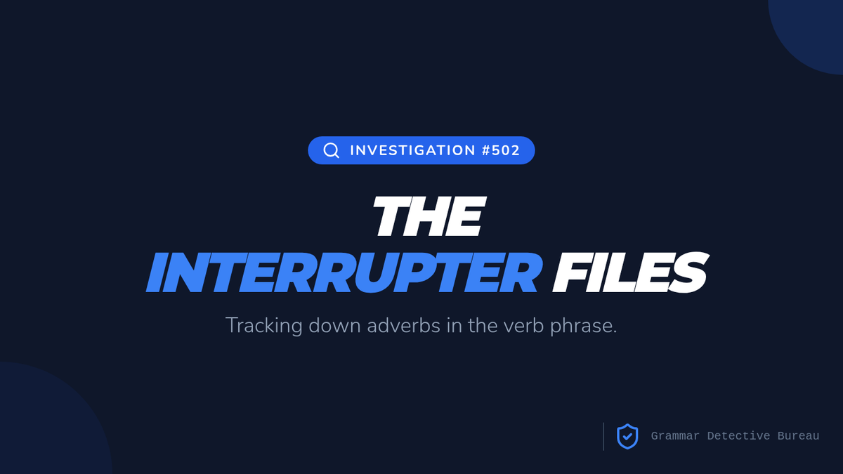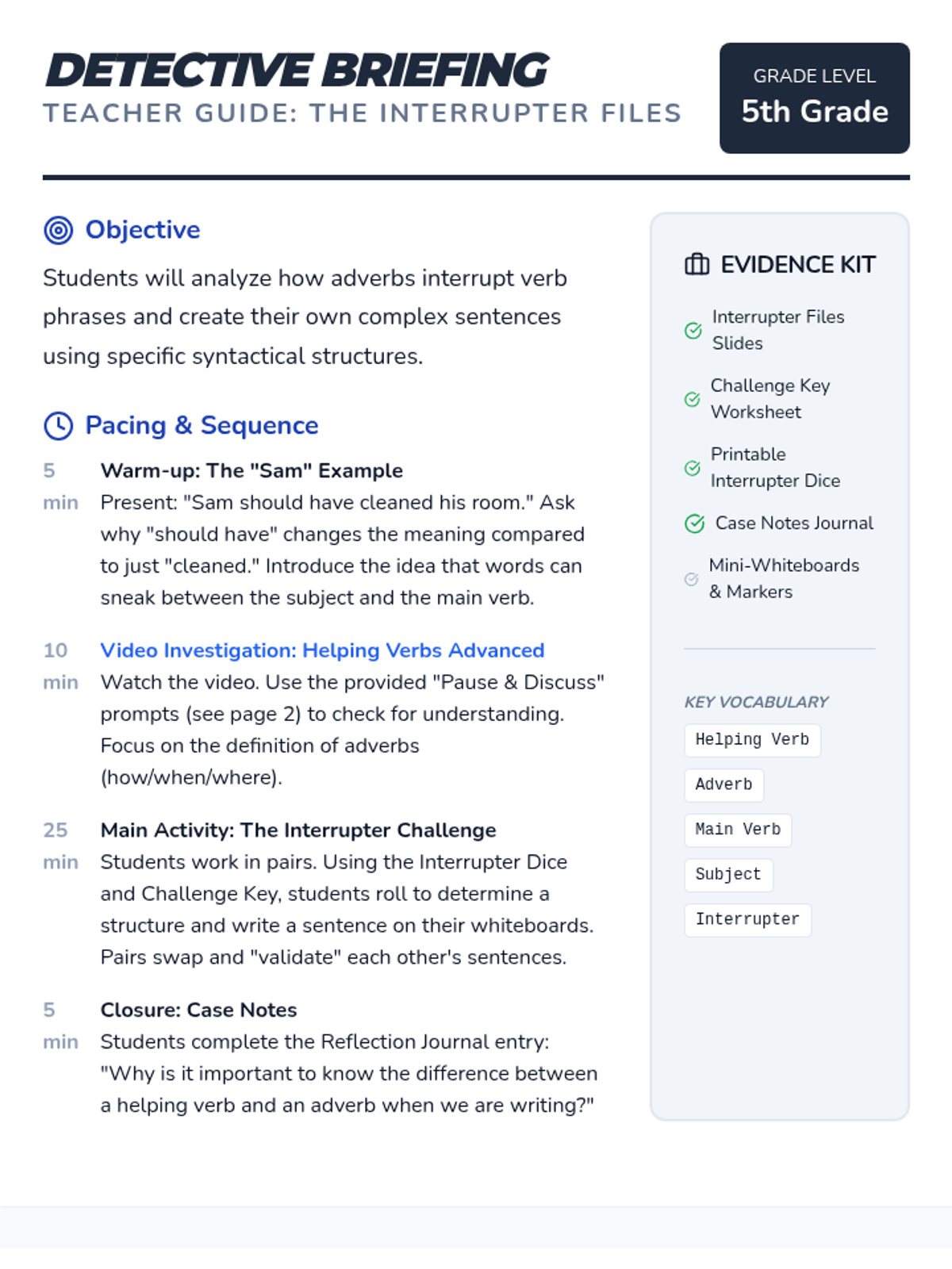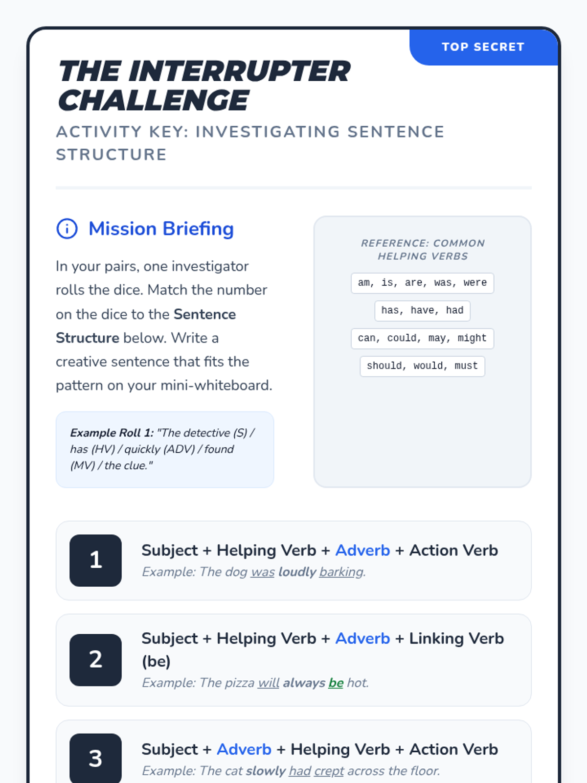 A detective-themed lesson where students investigate how adverbs 'interrupt' verb phrases. Students use a step-by-step strategy to distinguish between helping verbs and adverbs and apply their knowledge through a dice-based sentence-building challenge.