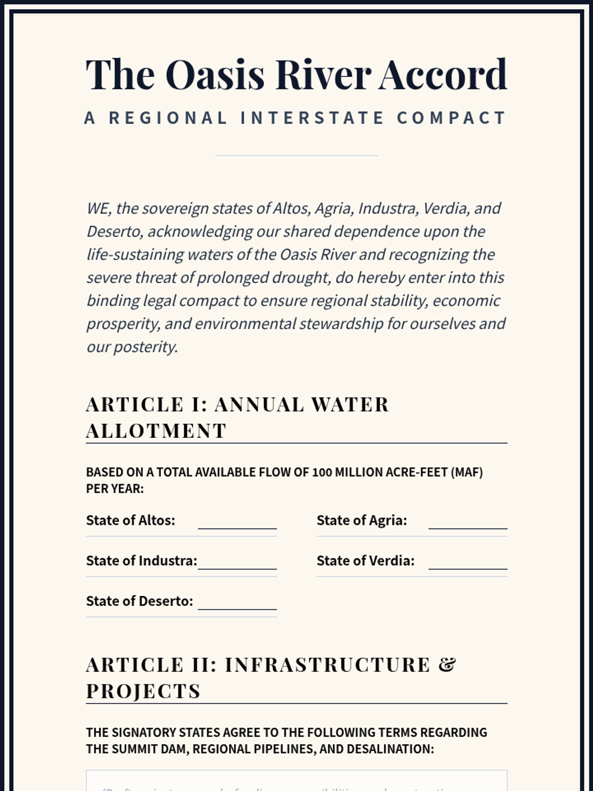 The culmination of the sequence where students engage in a formal negotiation summit to draft a resource usage agreement, balancing local needs with regional stability.