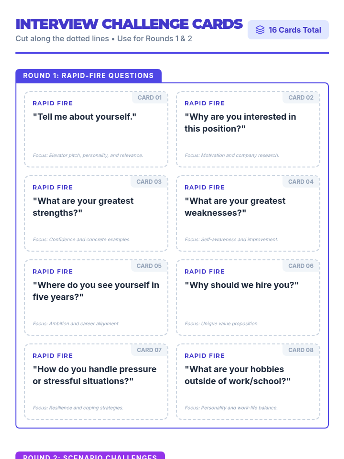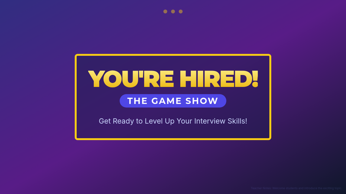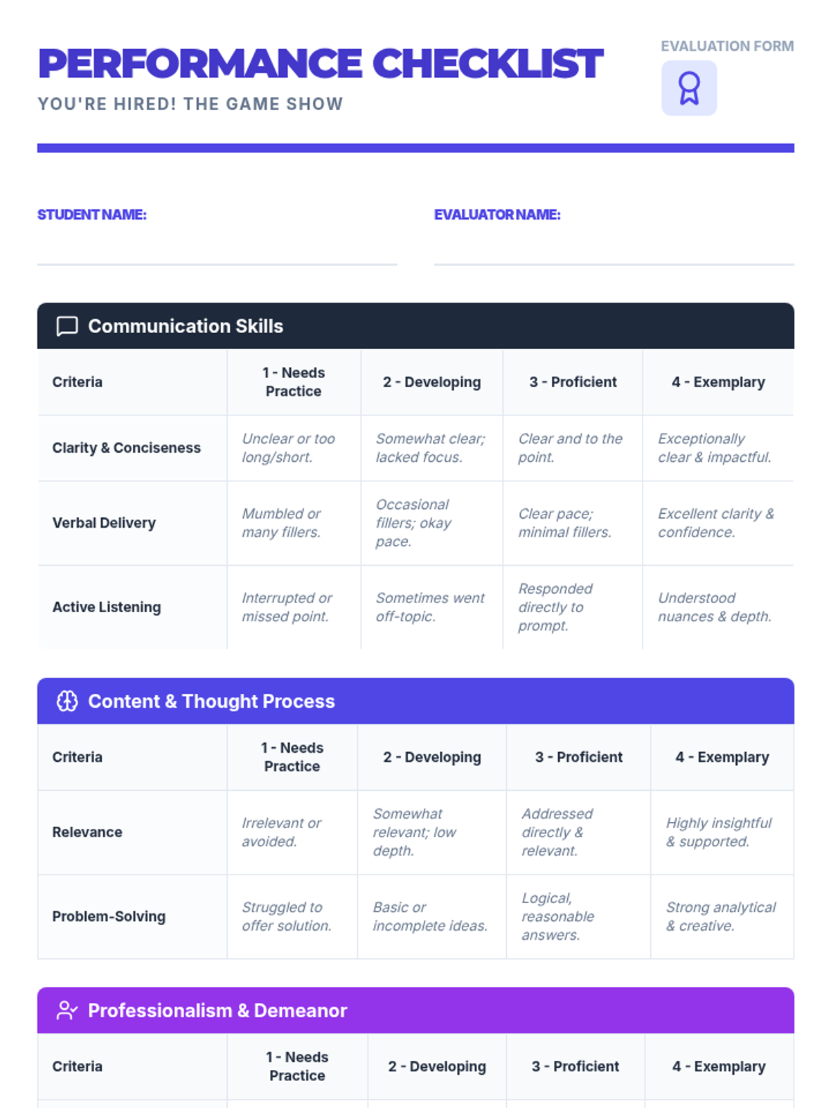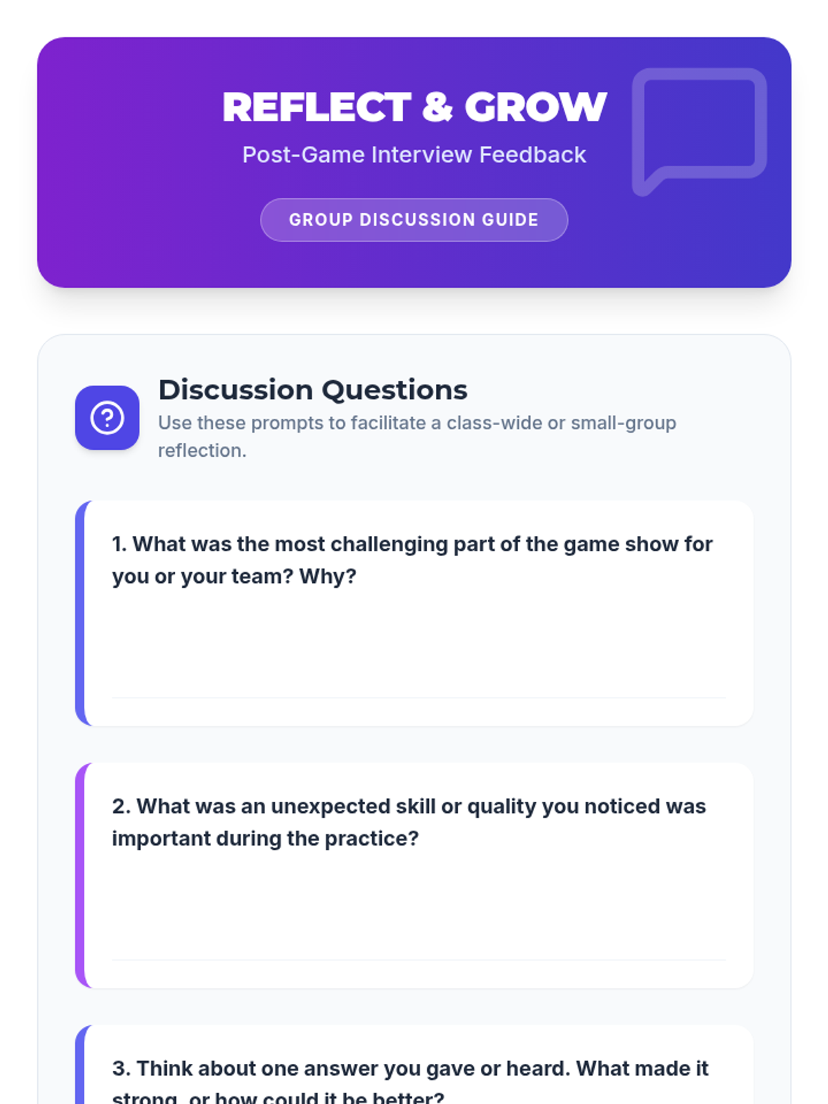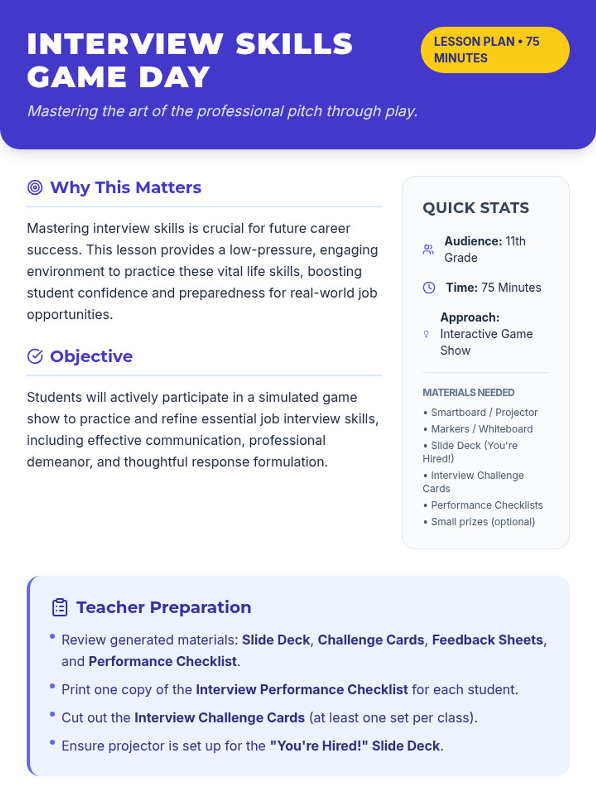 An interactive game show format for 11th-grade students to practice job interview skills through role-playing, peer feedback, and competitive challenges.