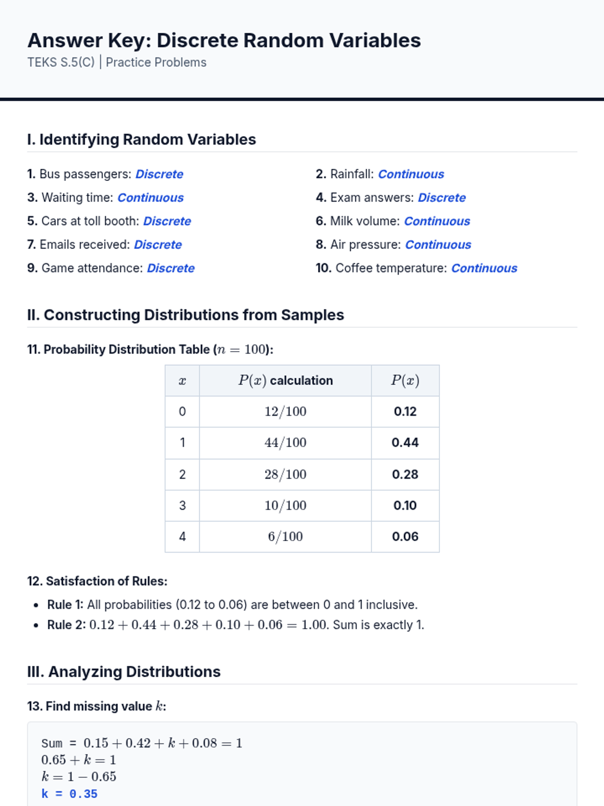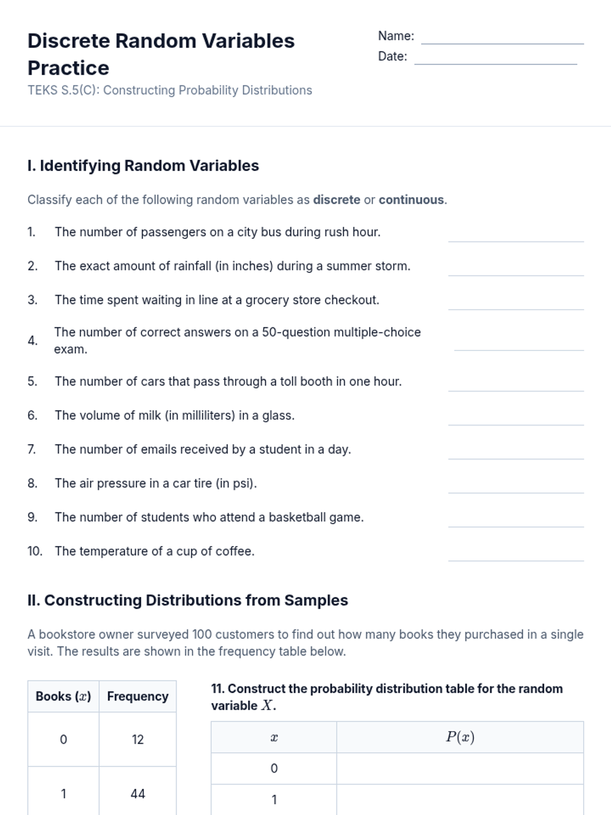 A lesson on constructing and analyzing probability distributions for discrete random variables based on collected samples or simulations, aligned with TEKS S.5(C).