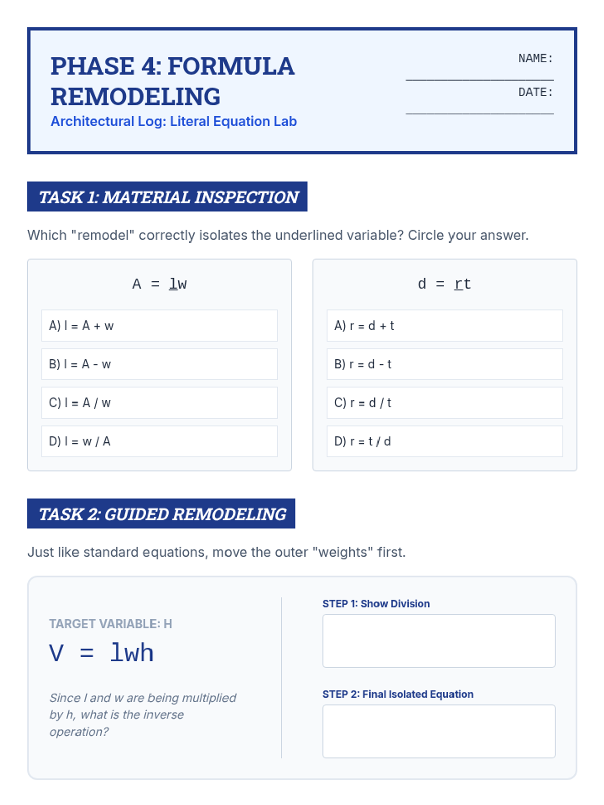 Students learn to manipulate formulas and literal equations, 'remodeling' them to solve for a specific variable. Connects abstract variable manipulation to real-world geometric and physical formulas.