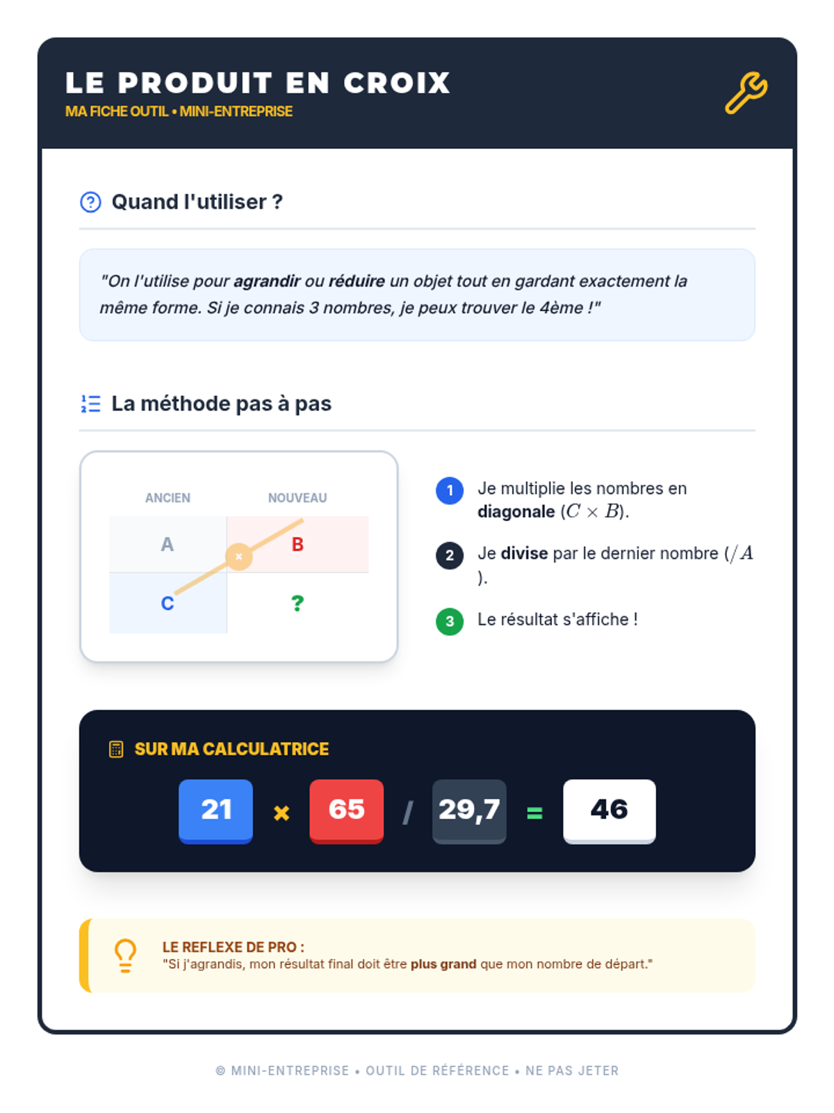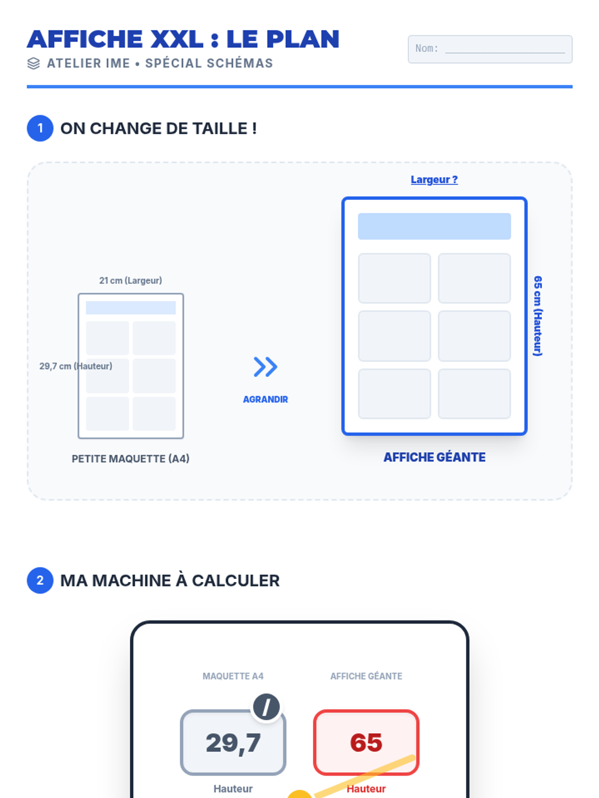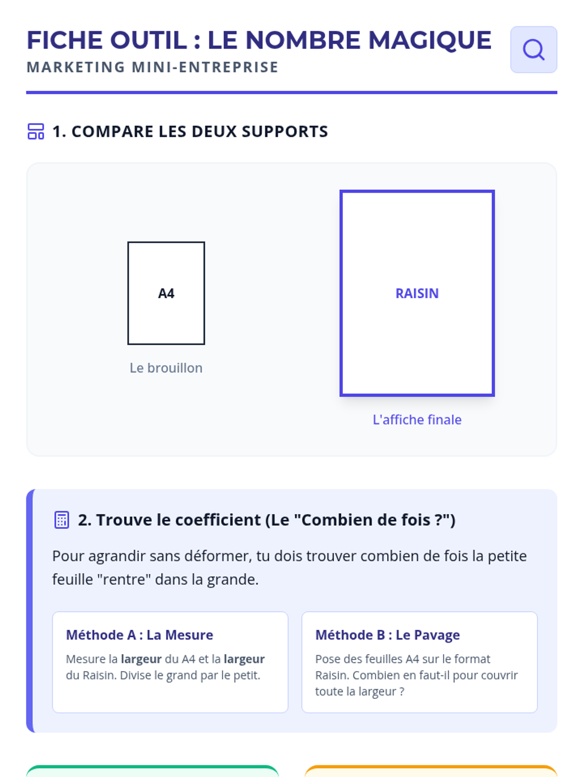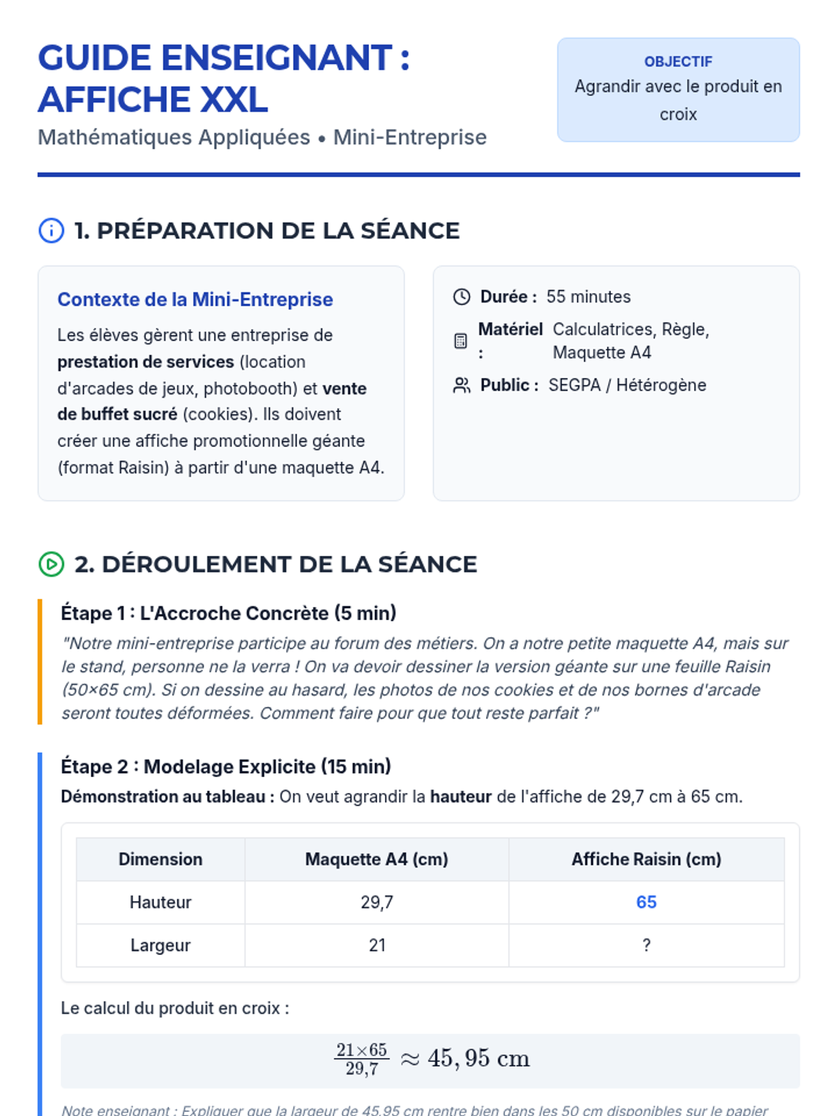 Cette séance de mathématiques appliquées guide les élèves de SEGPA dans l'agrandissement d'une affiche promotionnelle pour leur mini-entreprise, en utilisant la proportionnalité et le produit en croix pour passer du format A4 au format raisin.