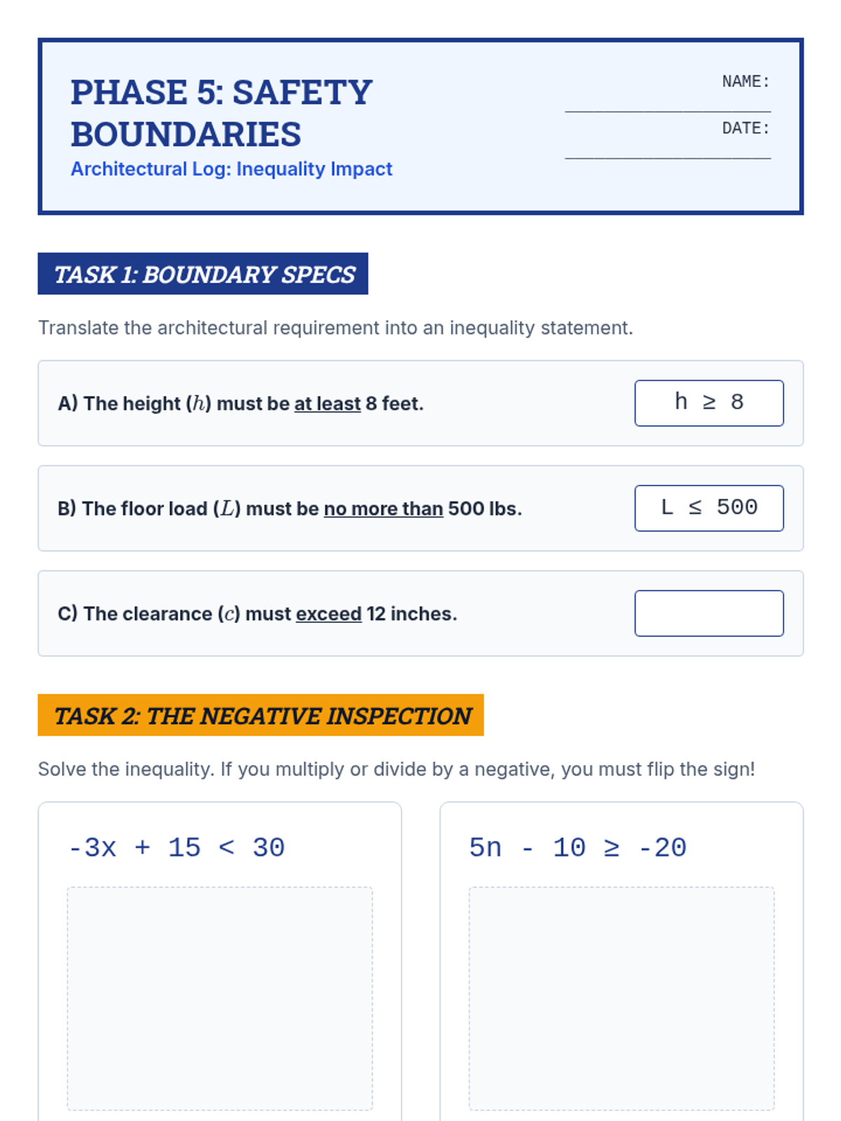 Addresses the logic of linear inequalities, including graphing on a number line and the critical rule for multiplying/dividing by a negative number. Includes real-world 'budgeting' scenarios.