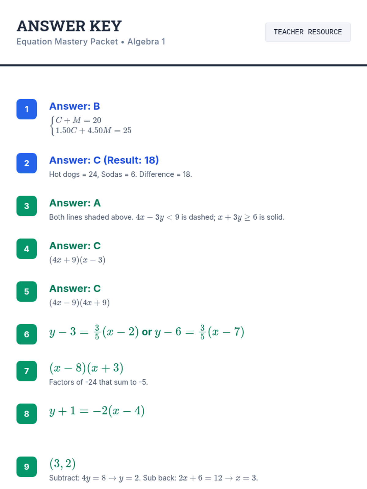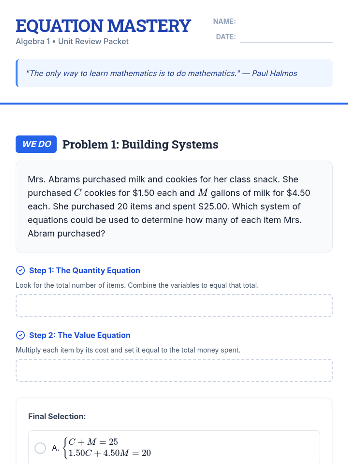 A comprehensive review lesson covering systems of equations, linear inequalities, factoring quadratics, and writing linear equations. Includes guided 'We Do' practice for complex word problems and independent practice for skill mastery.