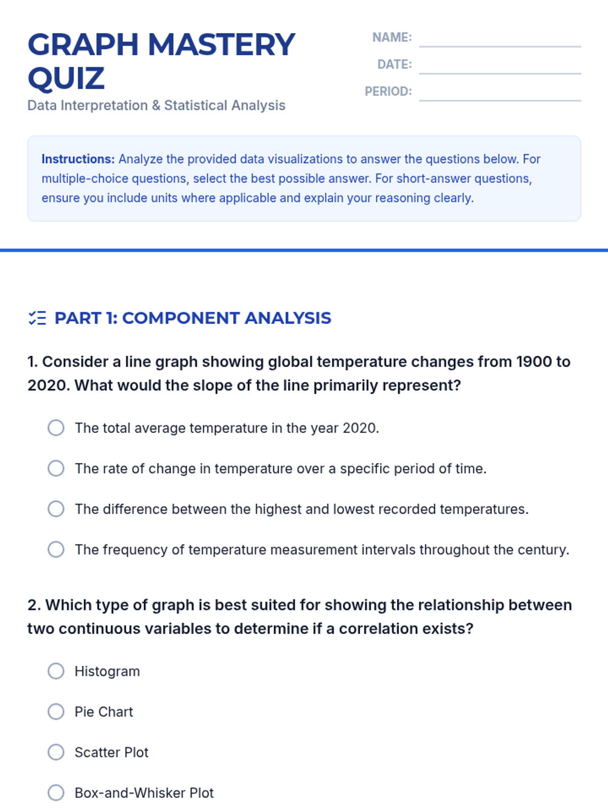 A baseline assessment designed to identify student gaps in data interpretation, display construction, and statistical reasoning. Includes a variety of item types to gauge prior knowledge of histograms, box plots, and measures of center.