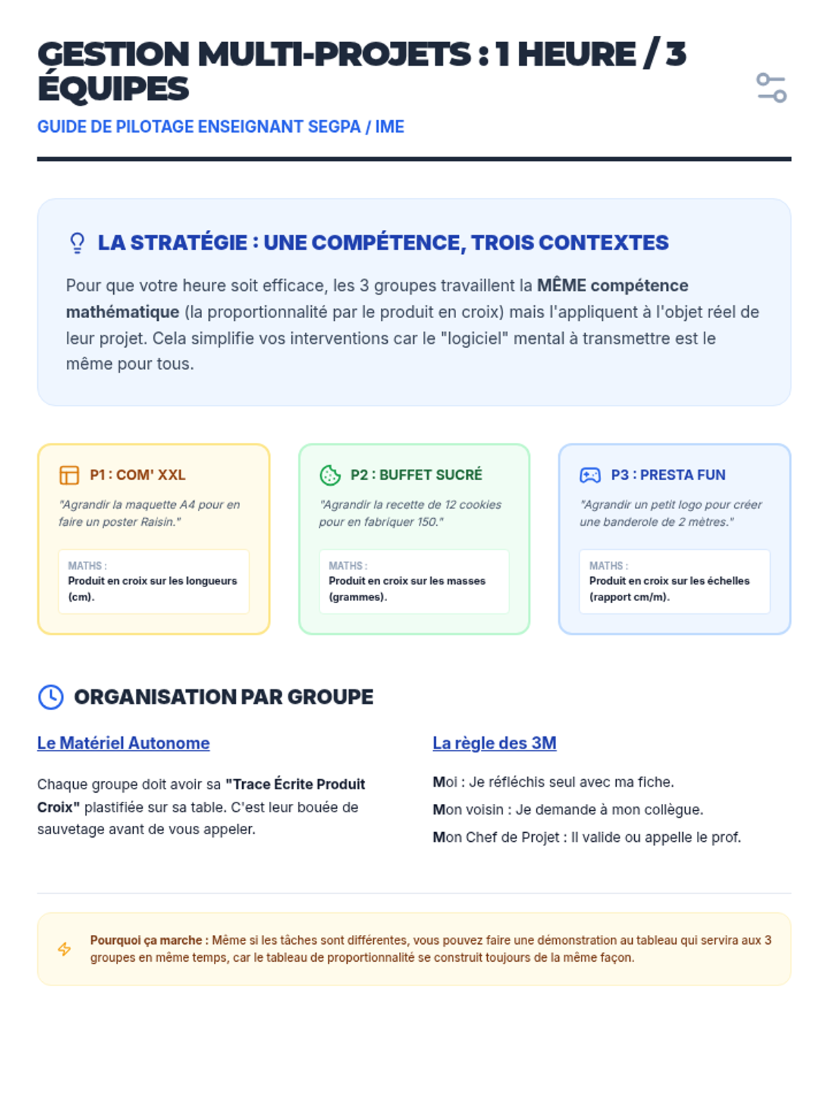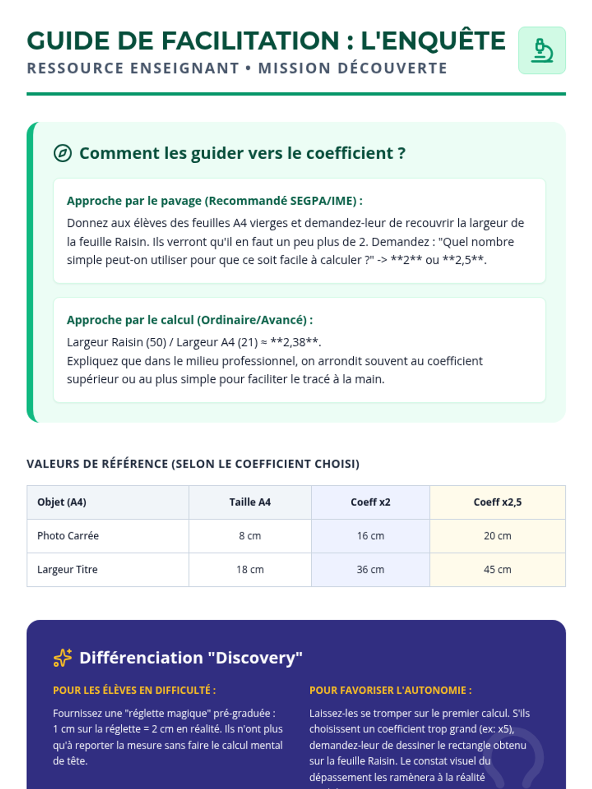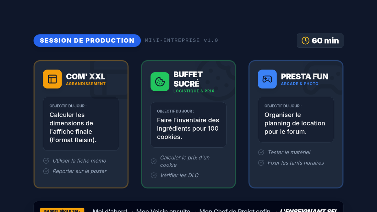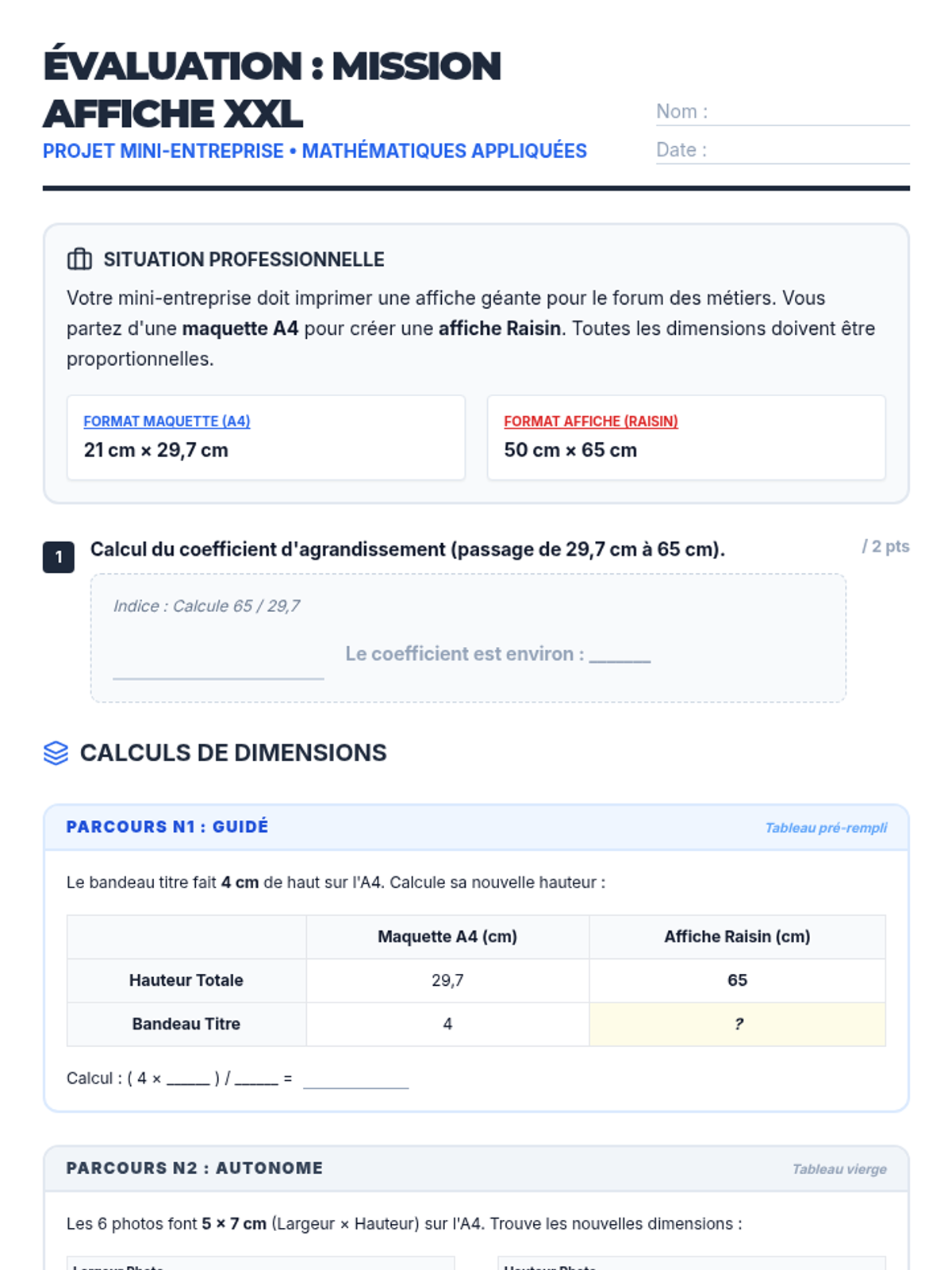 Cette séance de mathématiques appliquées permet aux élèves de SEGPA d'apprendre à agrandir une maquette d'affiche A4 au format Raisin en utilisant la proportionnalité et le produit en croix, dans le cadre réel de leur mini-entreprise scolaire. Elle intègre une gestion de classe flexible (groupes hétérogènes, présence fluctuante) et des micro-tâches orientées métier.
