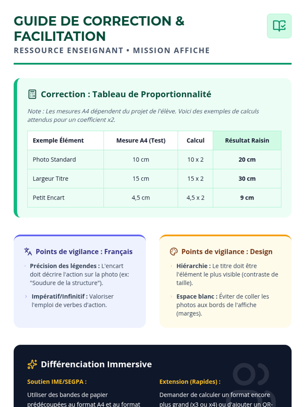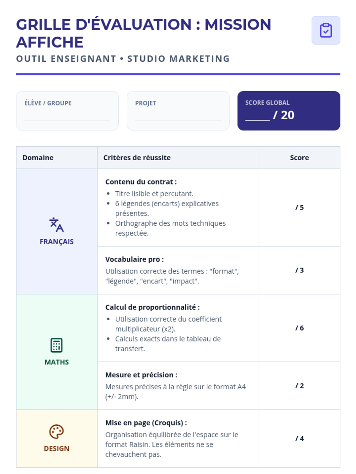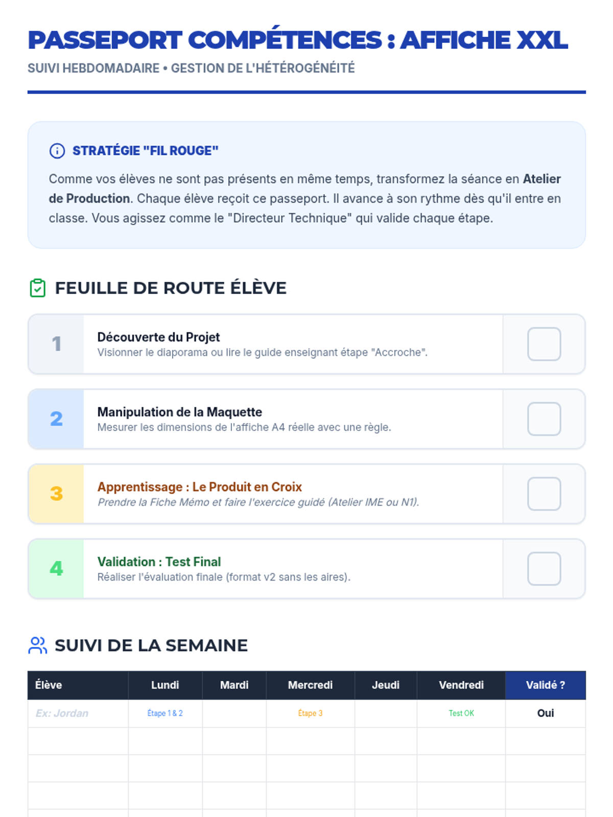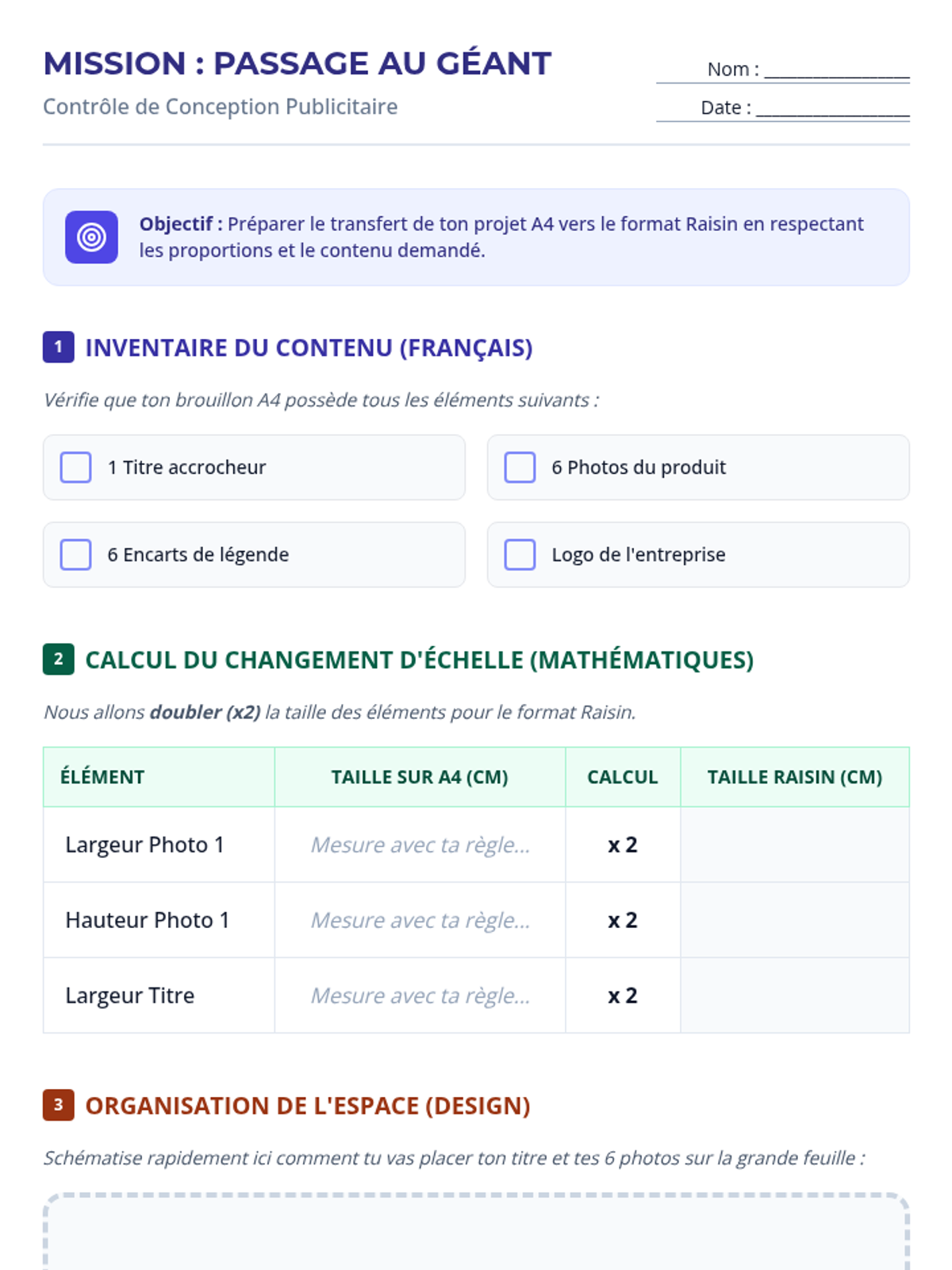 Cette séance de mathématiques appliquées permet aux élèves de SEGPA d'apprendre à agrandir une maquette d'affiche A4 au format Raisin en utilisant la proportionnalité et le produit en croix, dans le cadre réel de leur mini-entreprise scolaire. Elle intègre une gestion de classe flexible (groupes hétérogènes, présence fluctuante) et des micro-tâches orientées métier.
