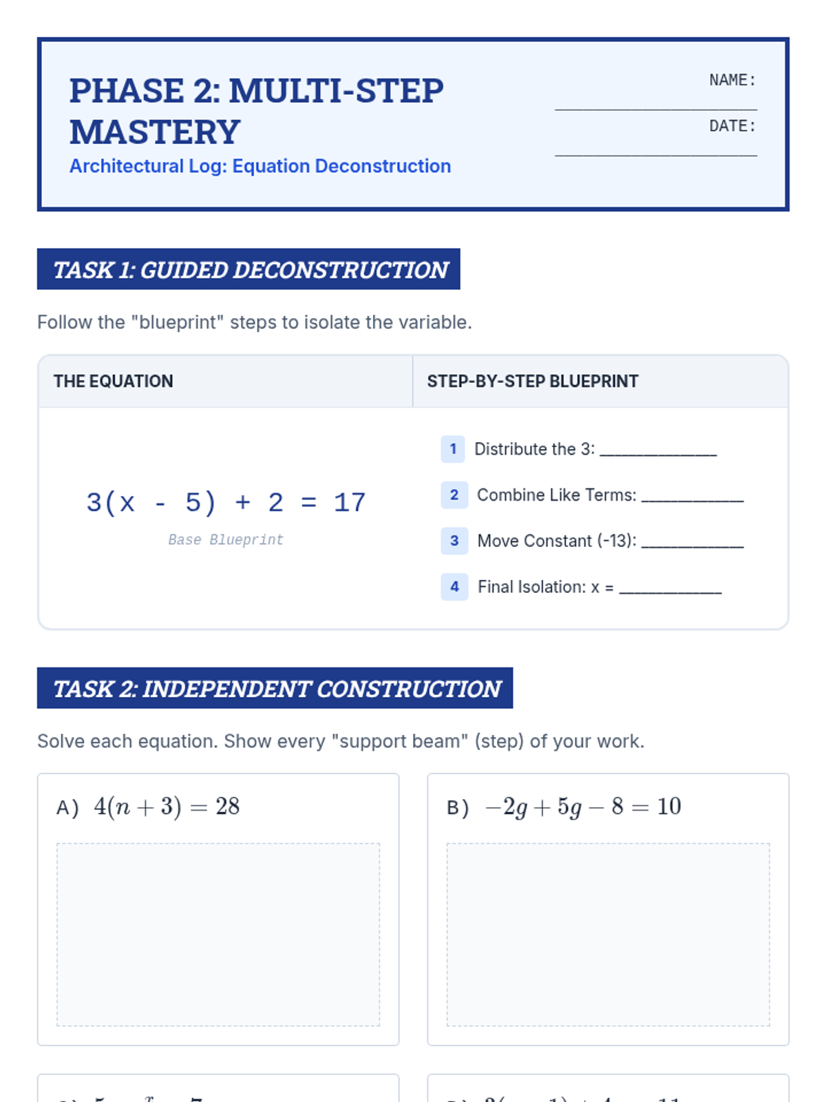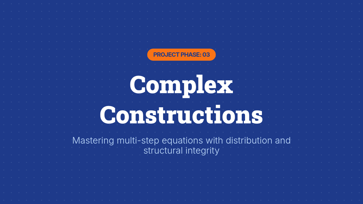 Focuses on multi-step linear equations involving the distributive property and combining like terms. Uses a 'building blocks' approach to help students visualize the order of operations in reverse.