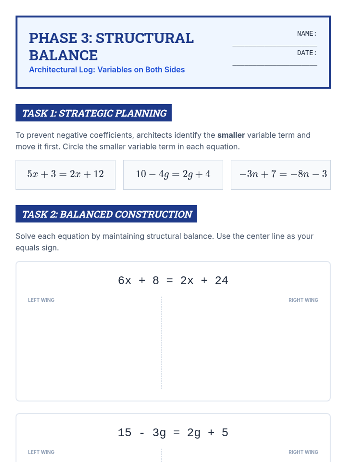 Teaches students how to handle equations with variables on both sides of the equals sign. Emphasizes maintaining 'structural balance' and choosing the most efficient first move.