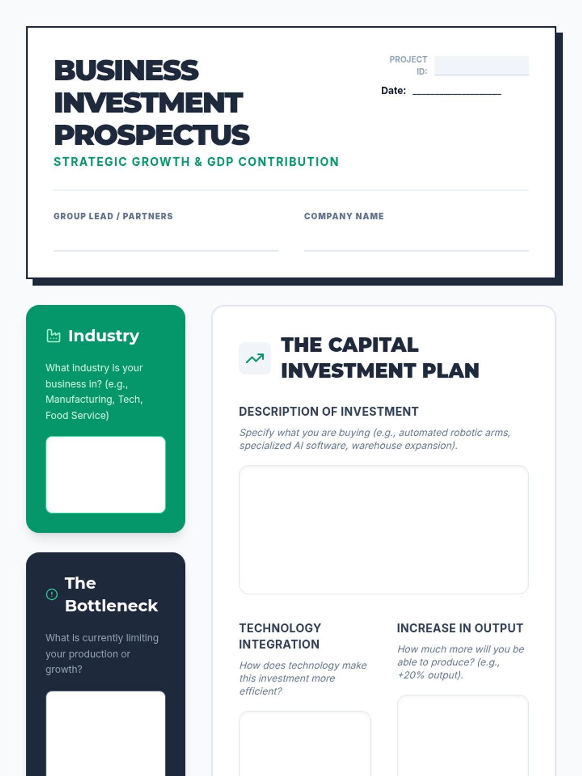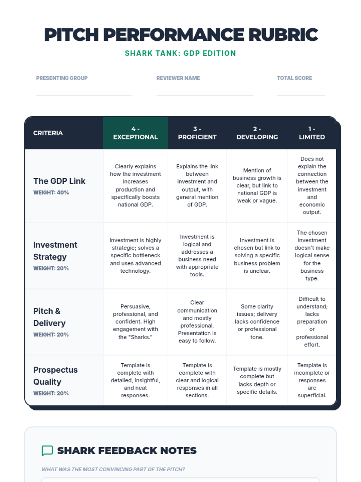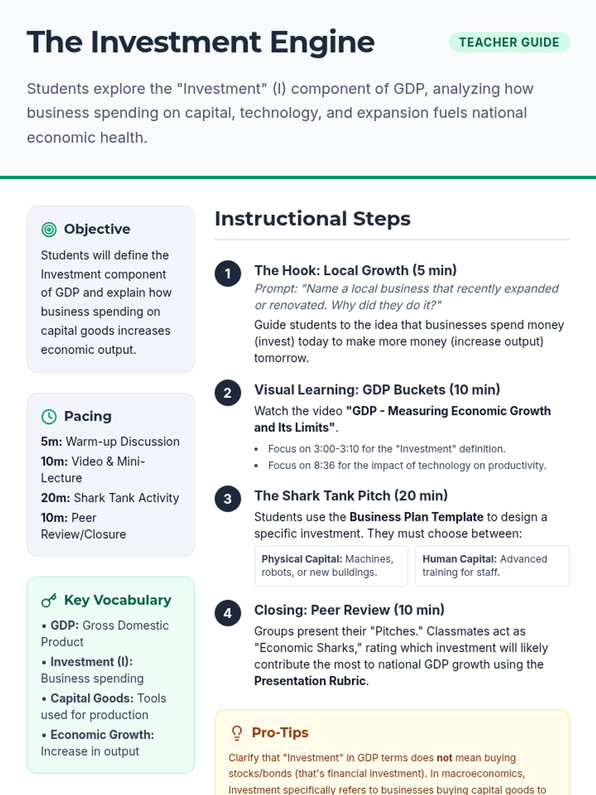A high school business lesson focused on the 'Investment' component of GDP, exploring how business spending on technology and expansion drives economic growth through a 'Shark Tank' style pitch activity.